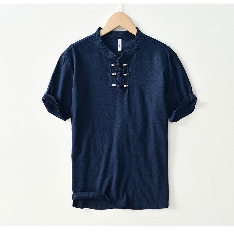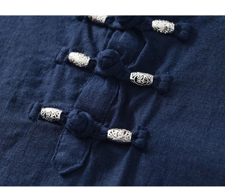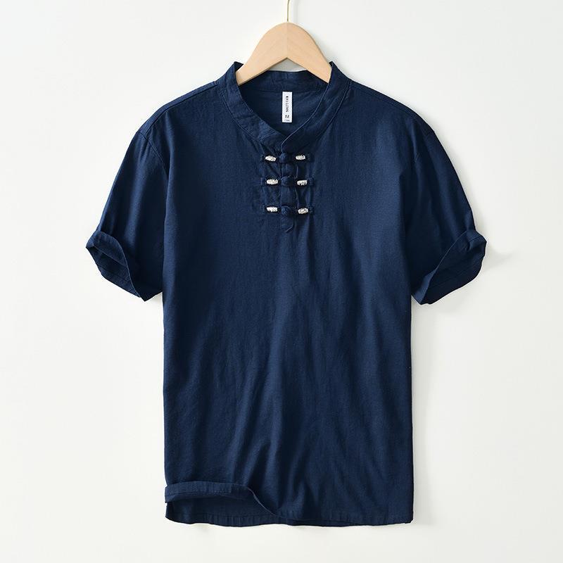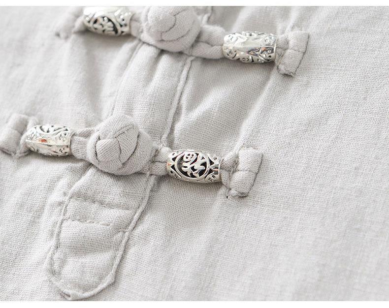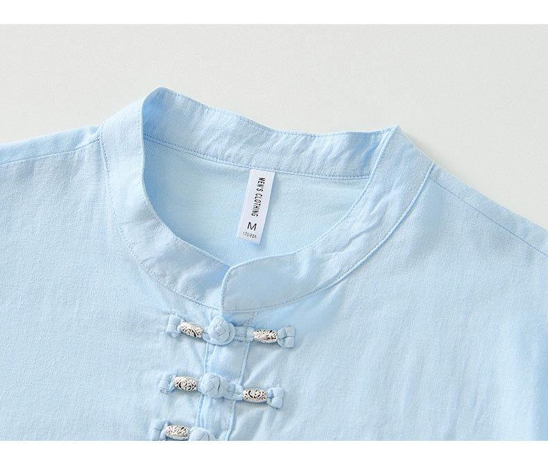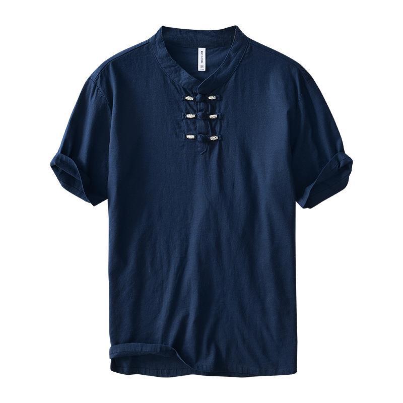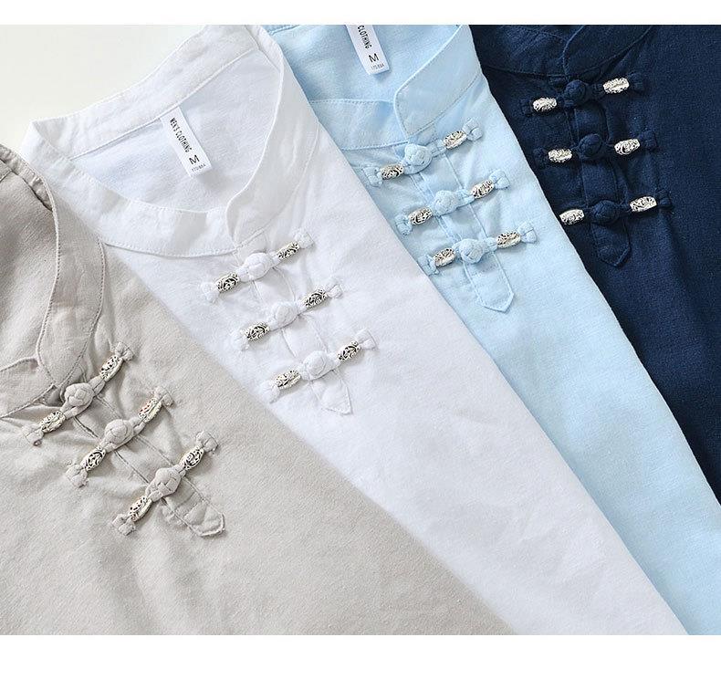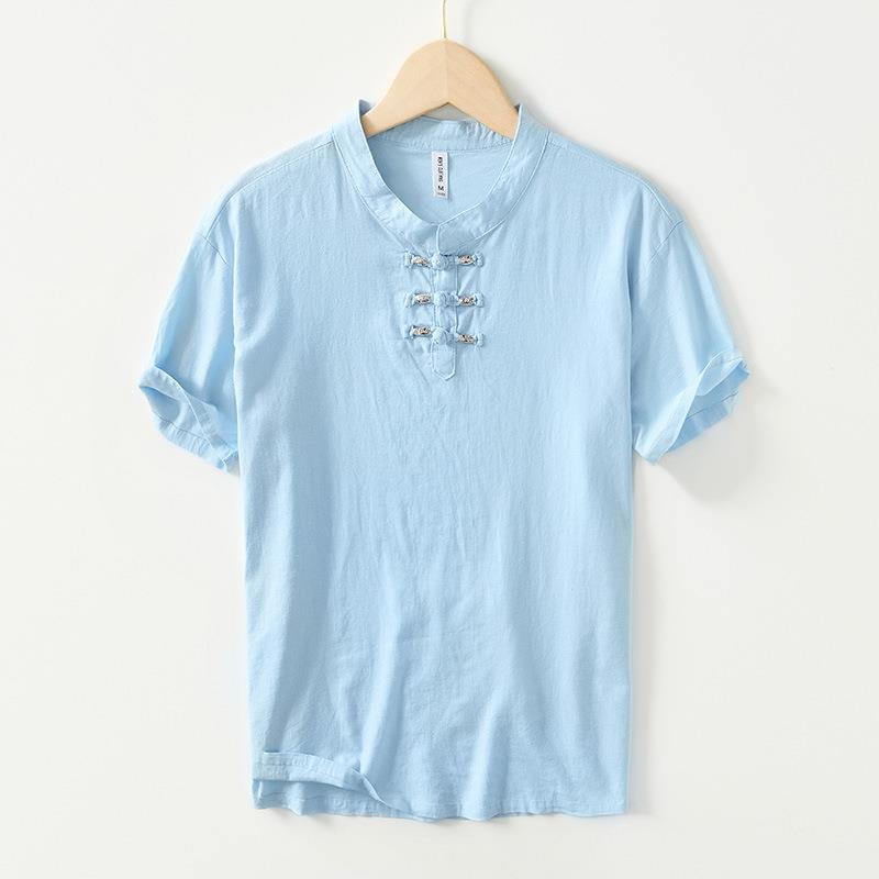 L986 중국식 행운의 단어 구슬 버클 캐주얼 반팔 티셔츠 남성 캐주얼 단색 린넨 재킷 머리카락의 세대