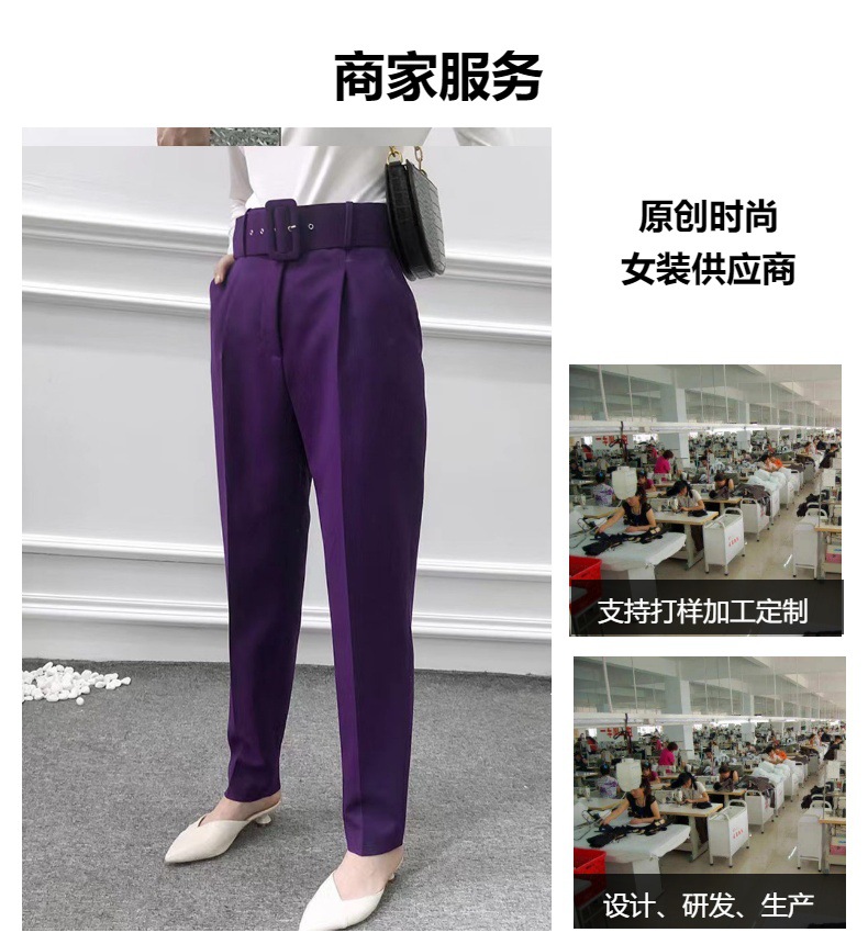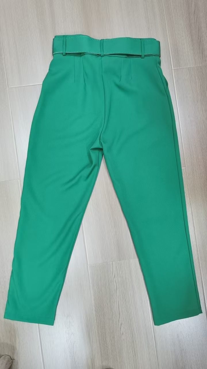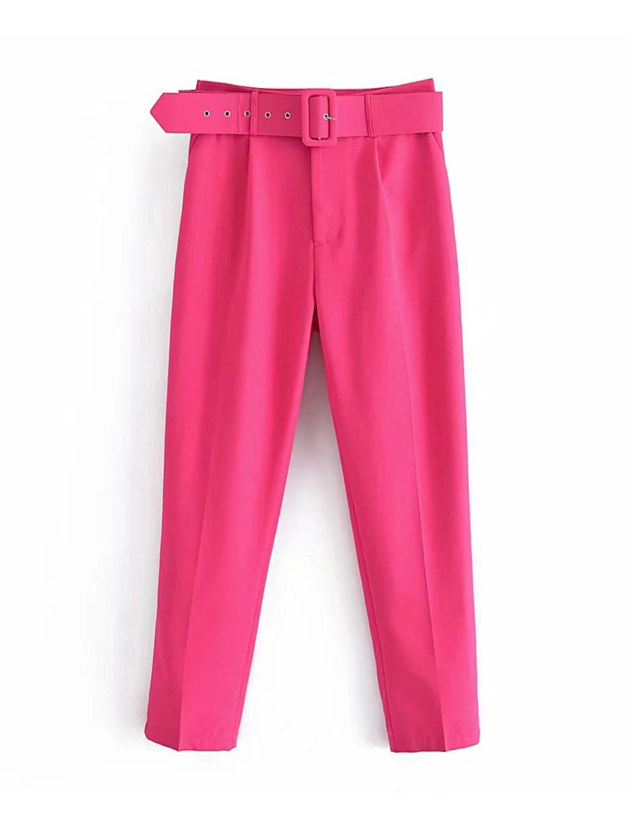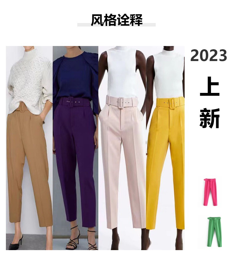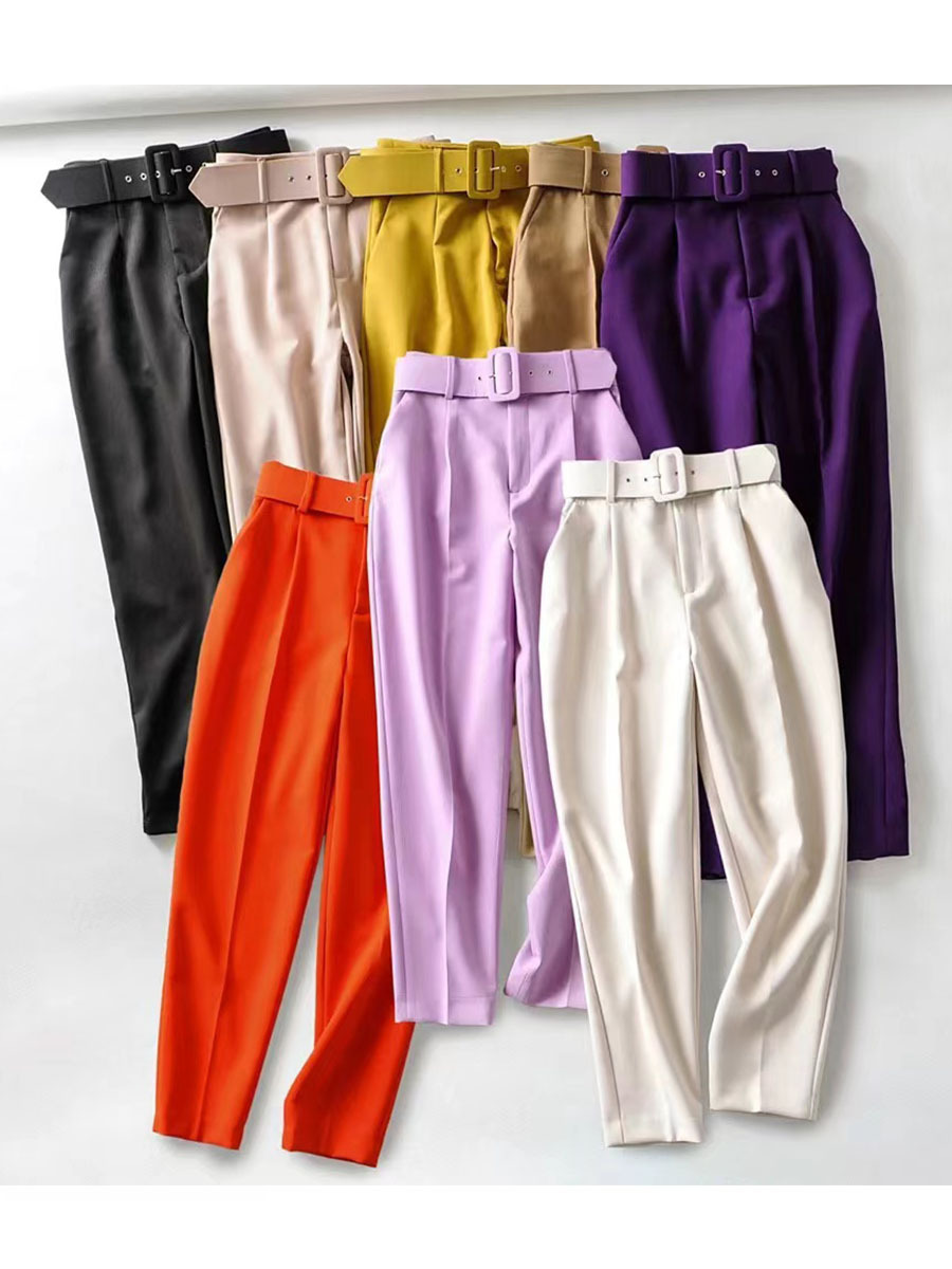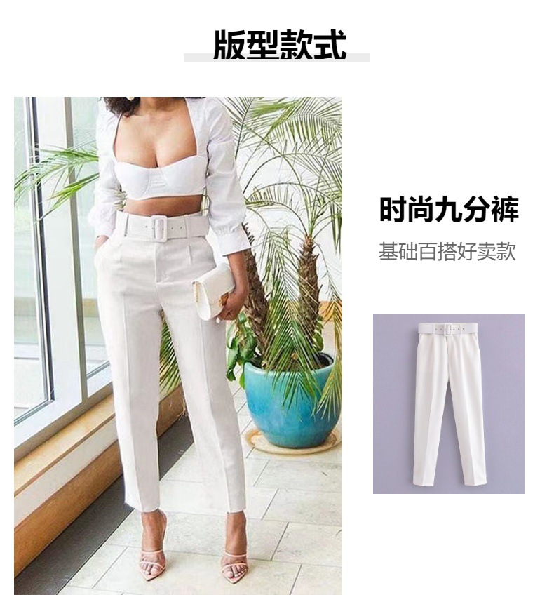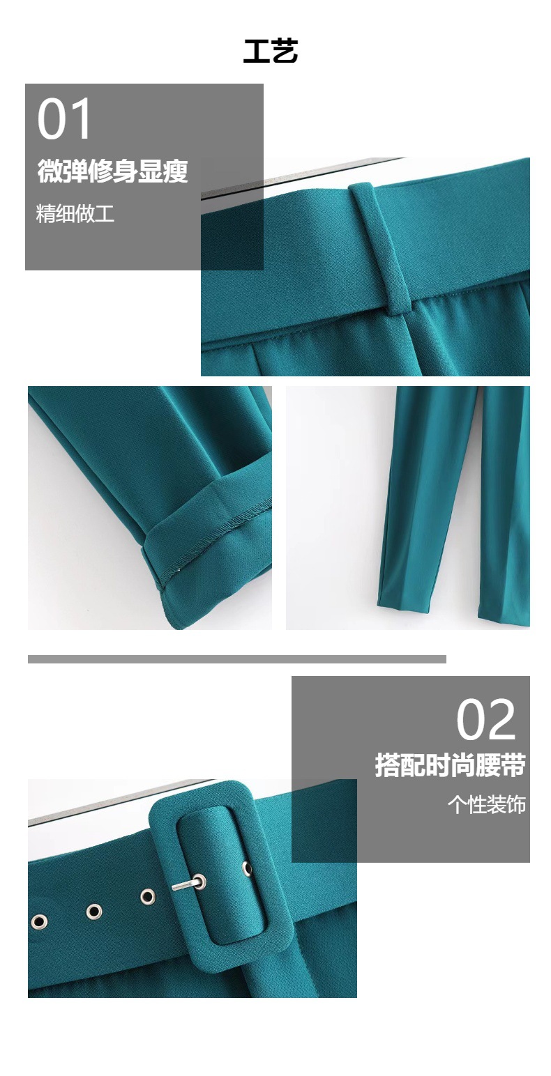유럽과 미국 스타일 크로스 보더 새로운 캐주얼 바지 마이크로 탄성 슬림 핏 슬리밍 벨트 장식 단색 스트레이트 세트 발목 길이 바지