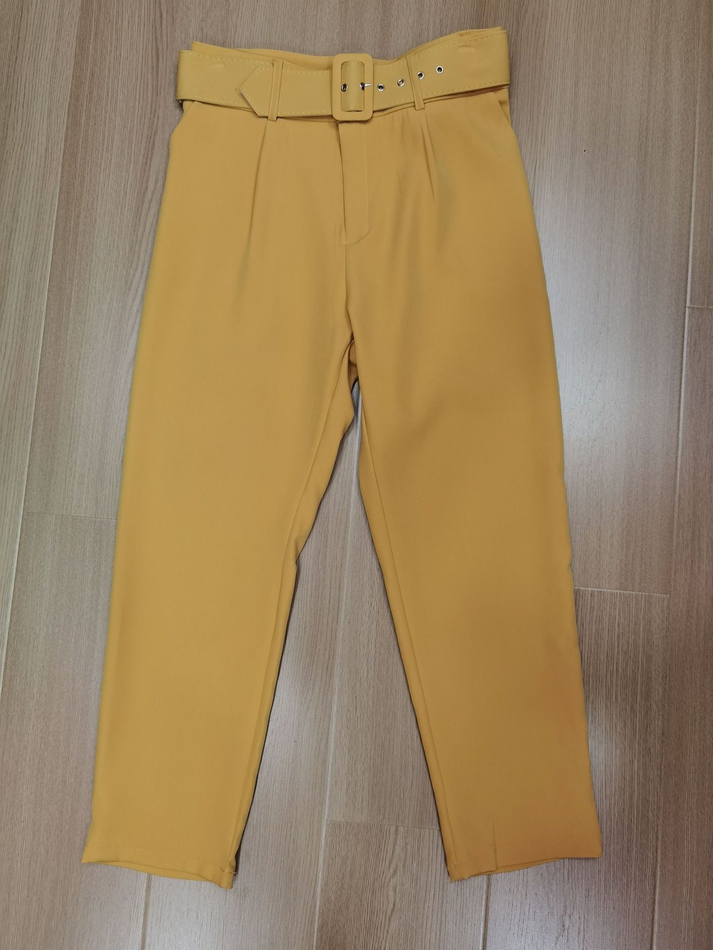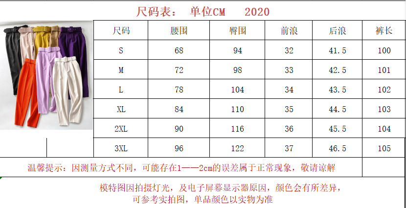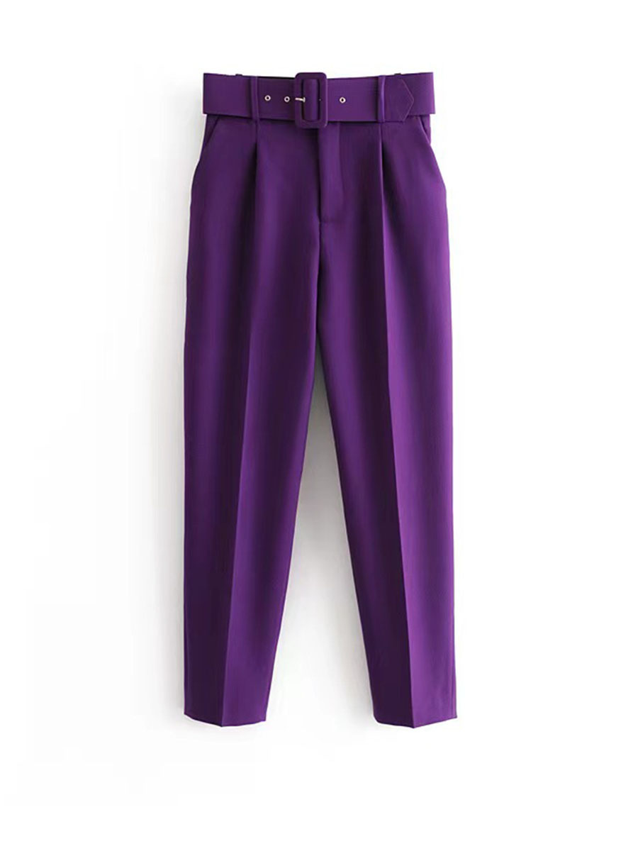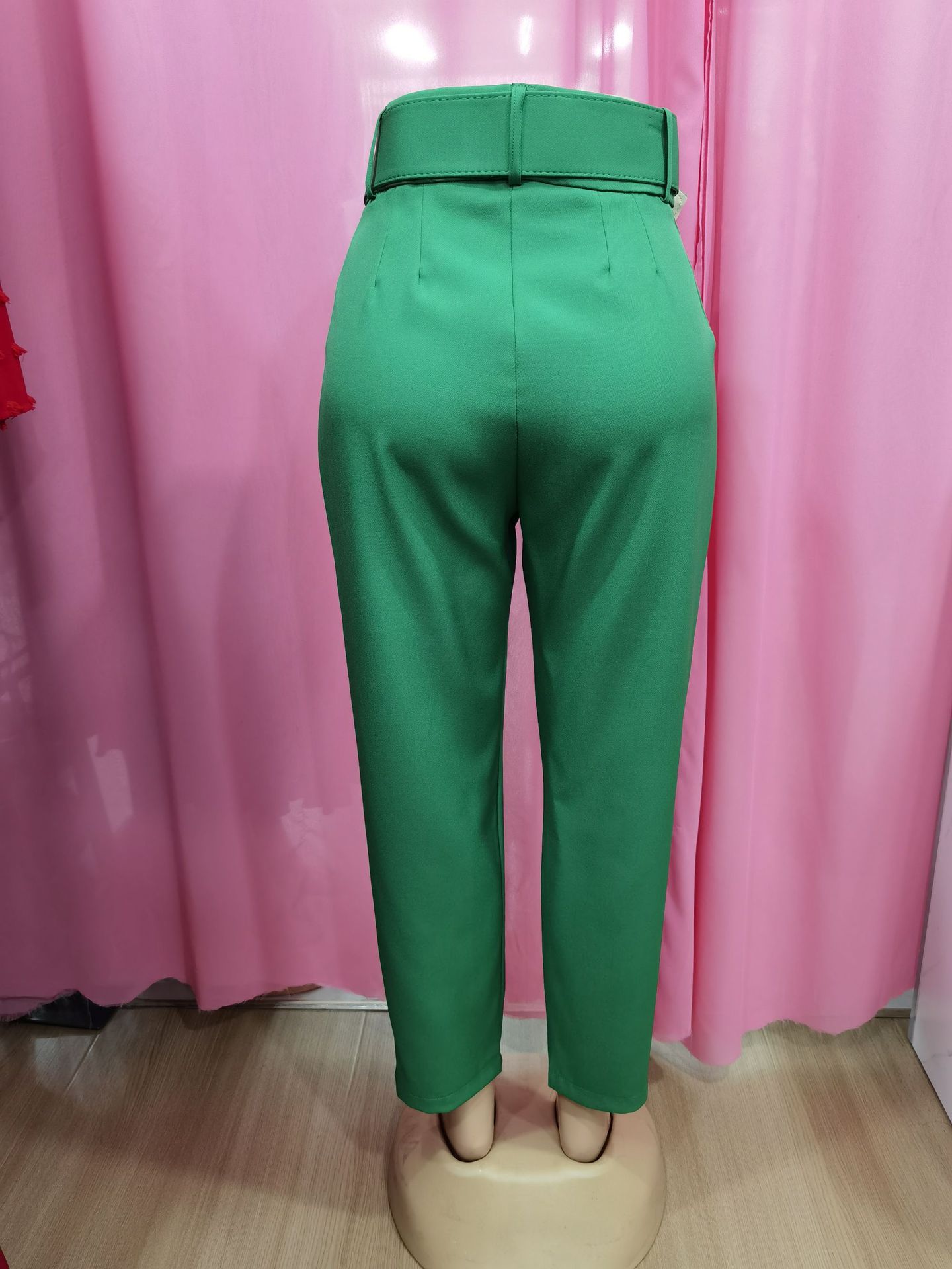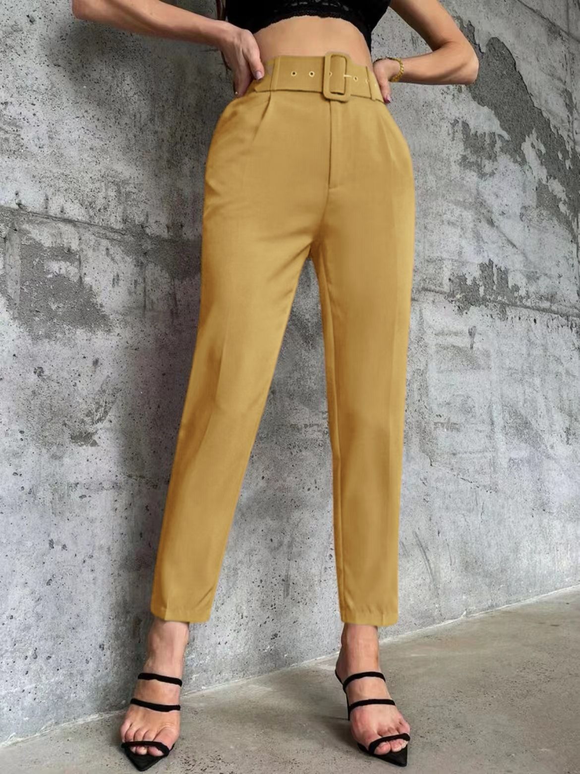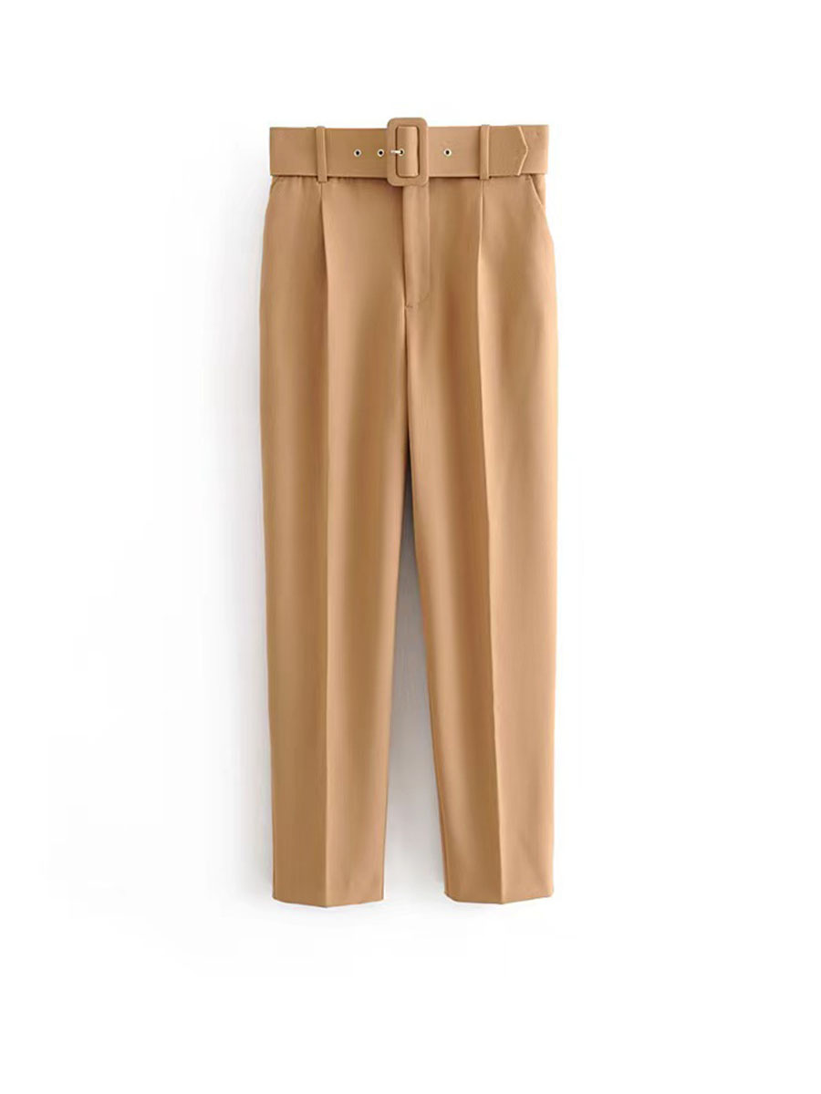 유럽과 미국 스타일 크로스 보더 새로운 캐주얼 바지 마이크로 탄성 슬림 핏 슬리밍 벨트 장식 단색 스트레이트 세트 발목 길이 바지