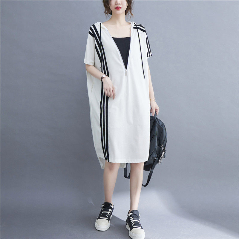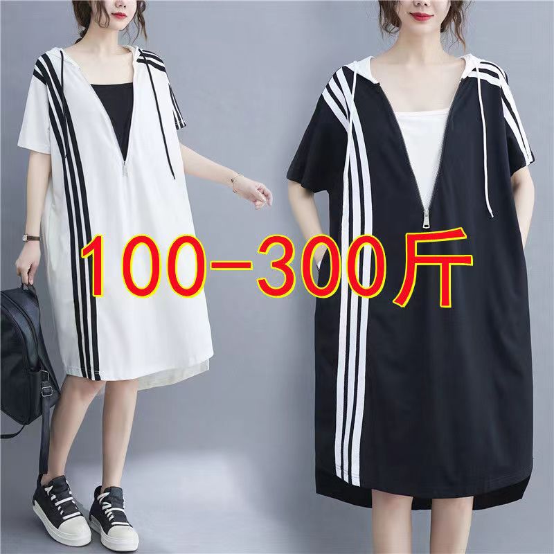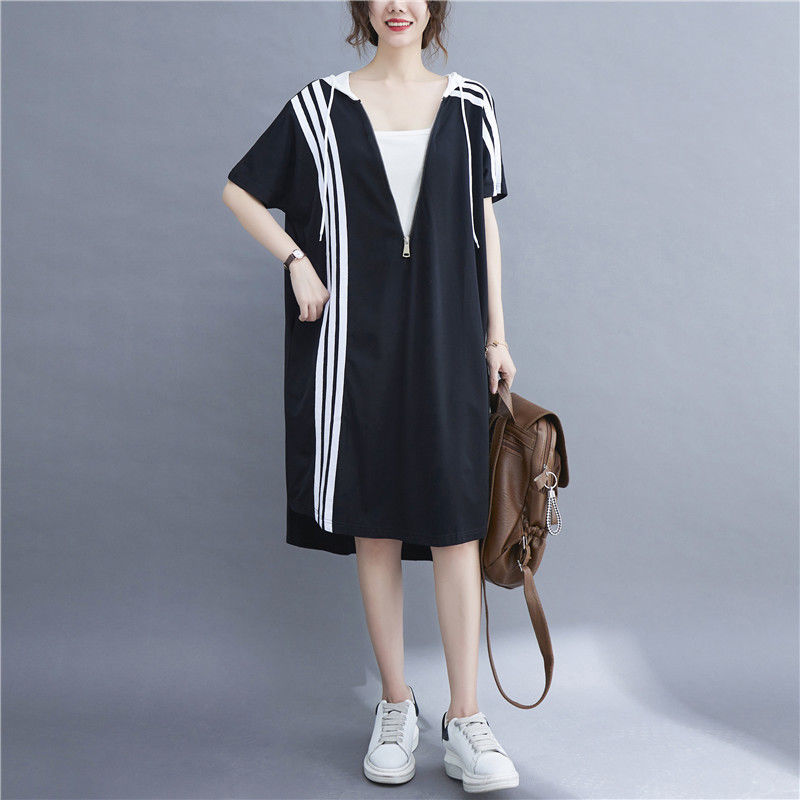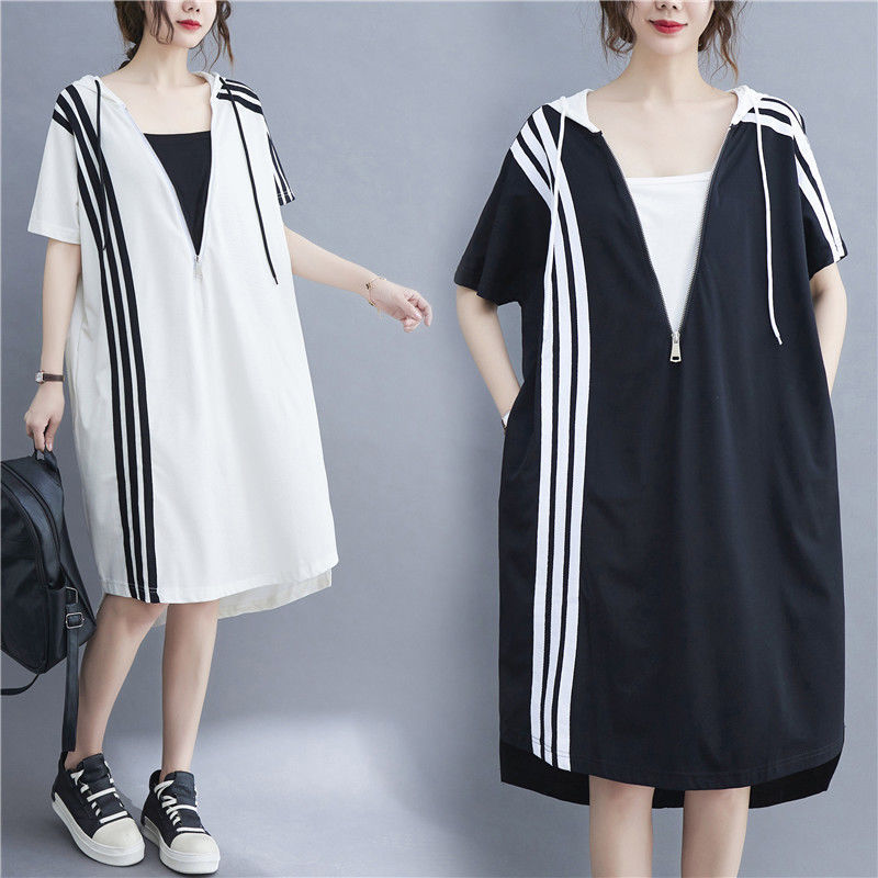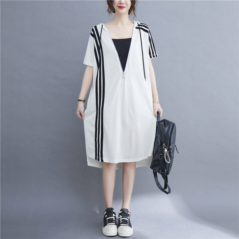 뚱뚱한 여자를 위한 여름 원피스, 큰 사이즈 여성복, 새로운 디자인의 후드가 달린 중간 길이 원피스, 투피스 스타일, 우아한 출퇴근룩