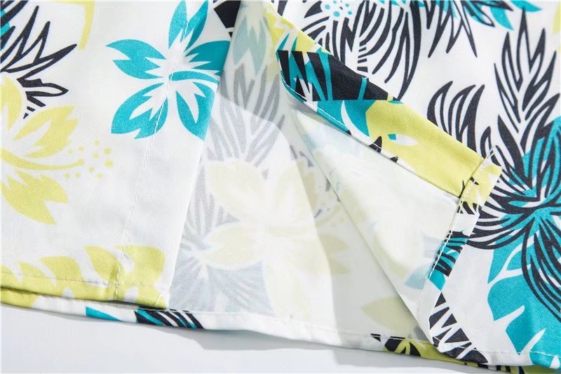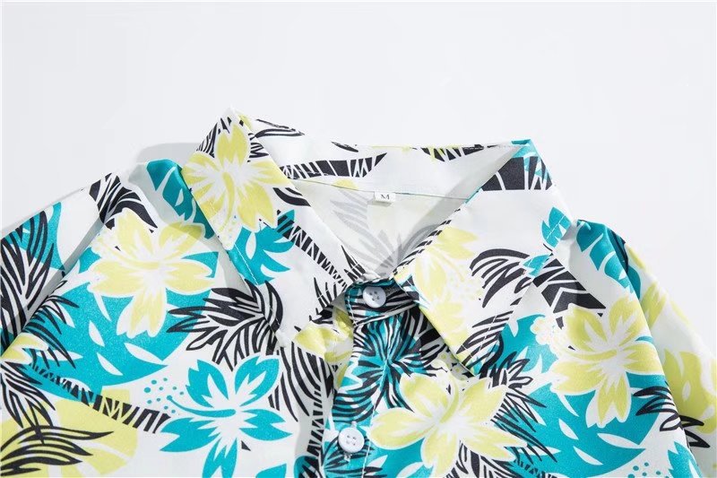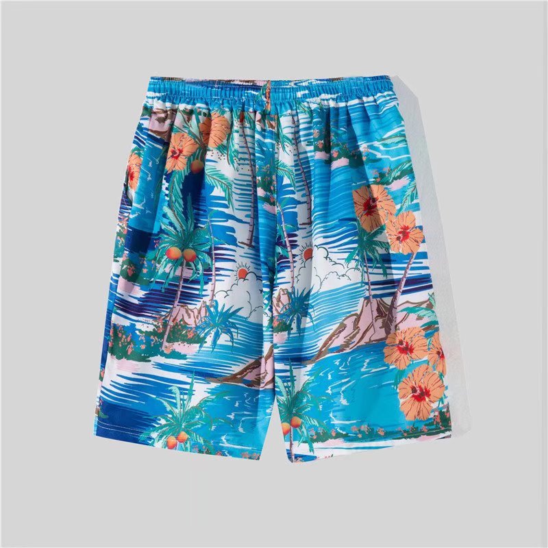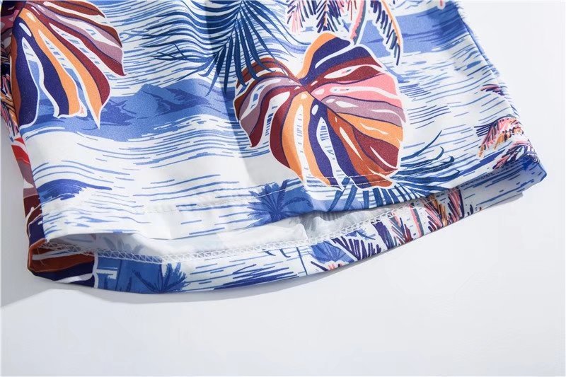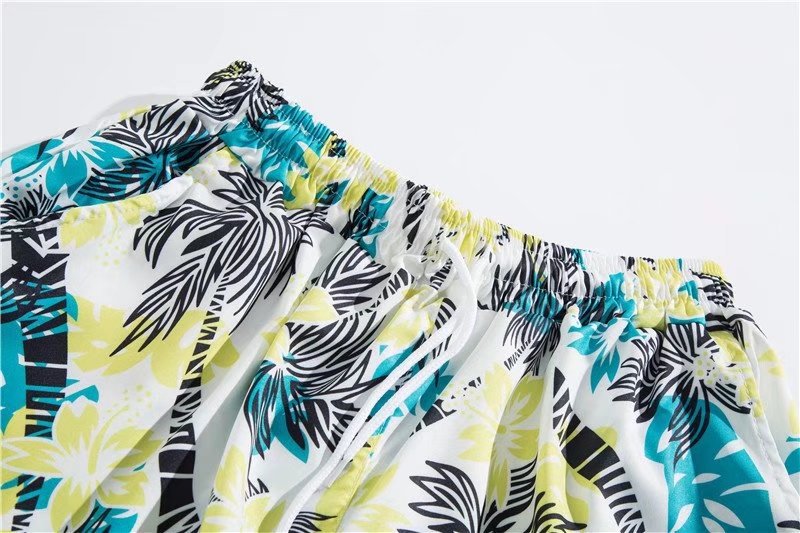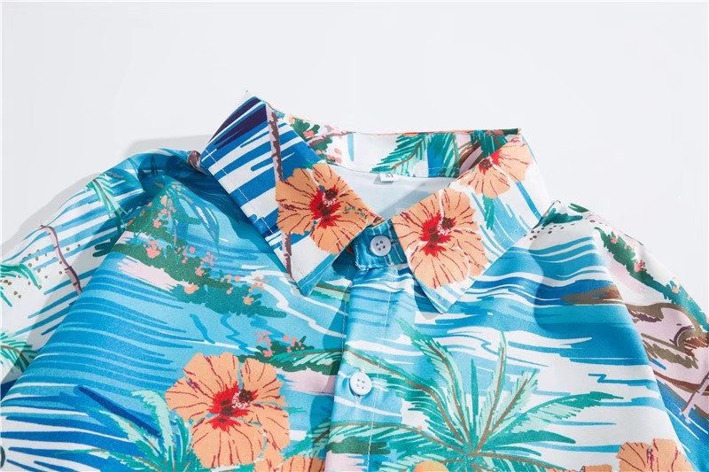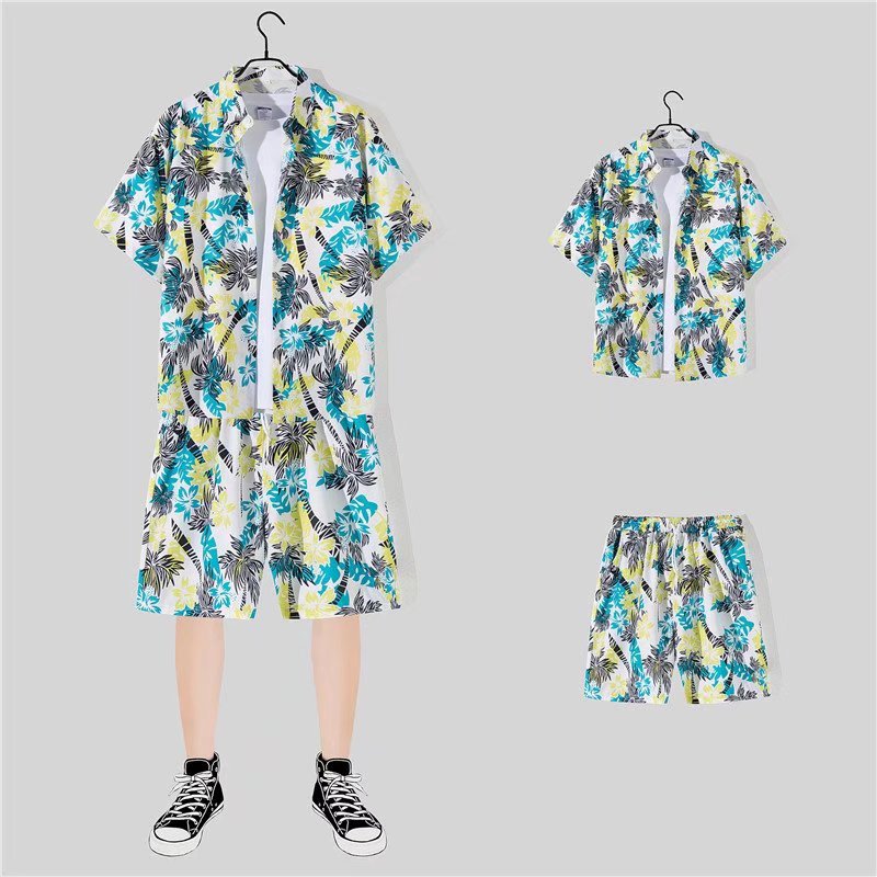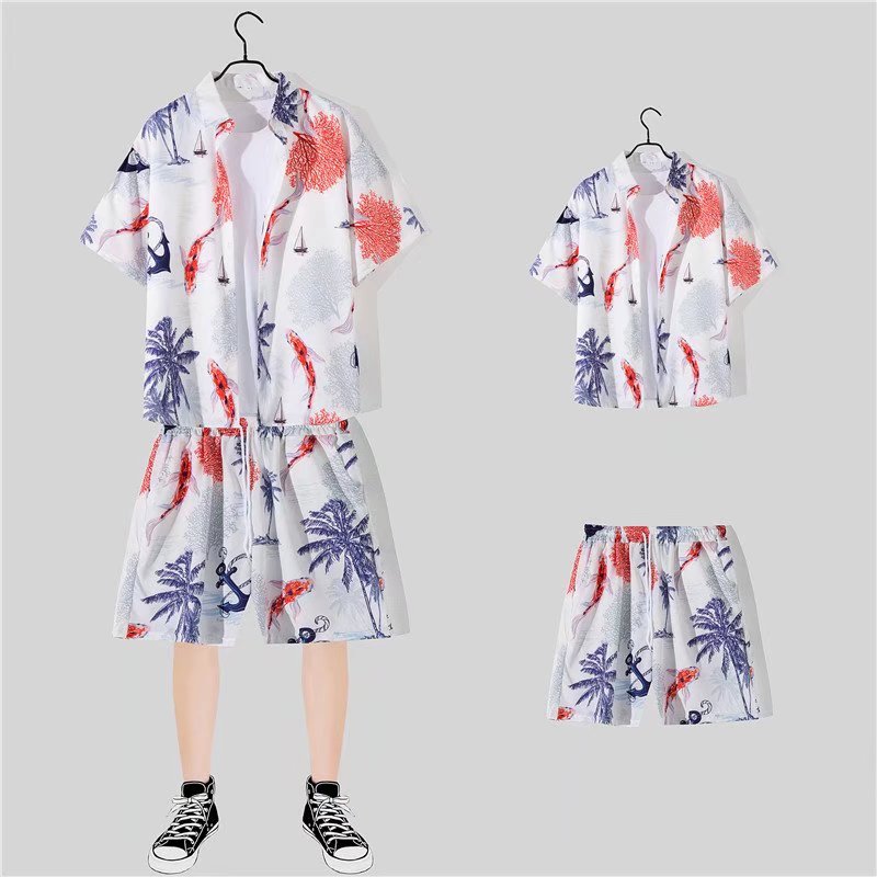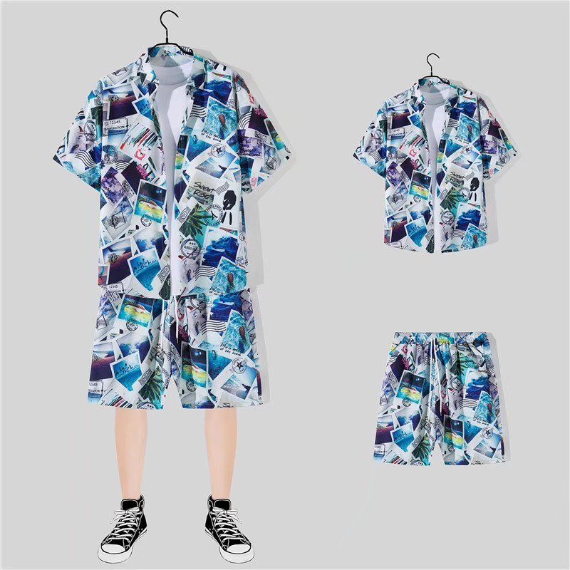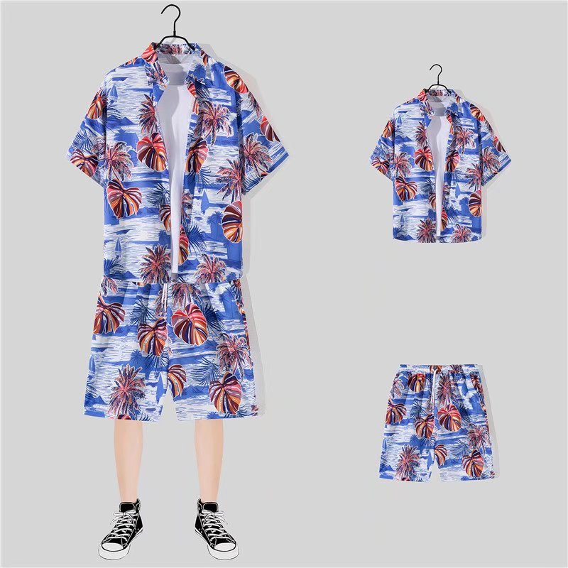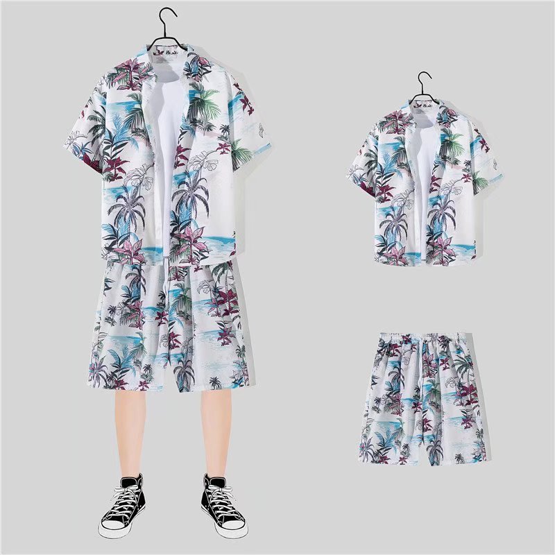 아이스 실크 반팔 꽃 셔츠 세트 남자의 여름 얇은 하와이안 프린트 셔츠 비치 바지 큰 바지 세트 남자