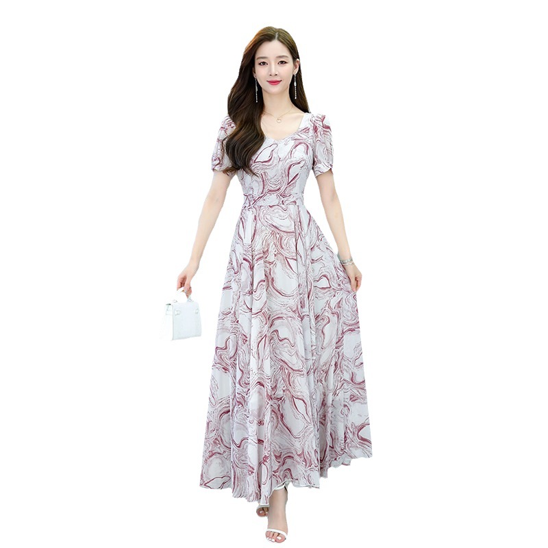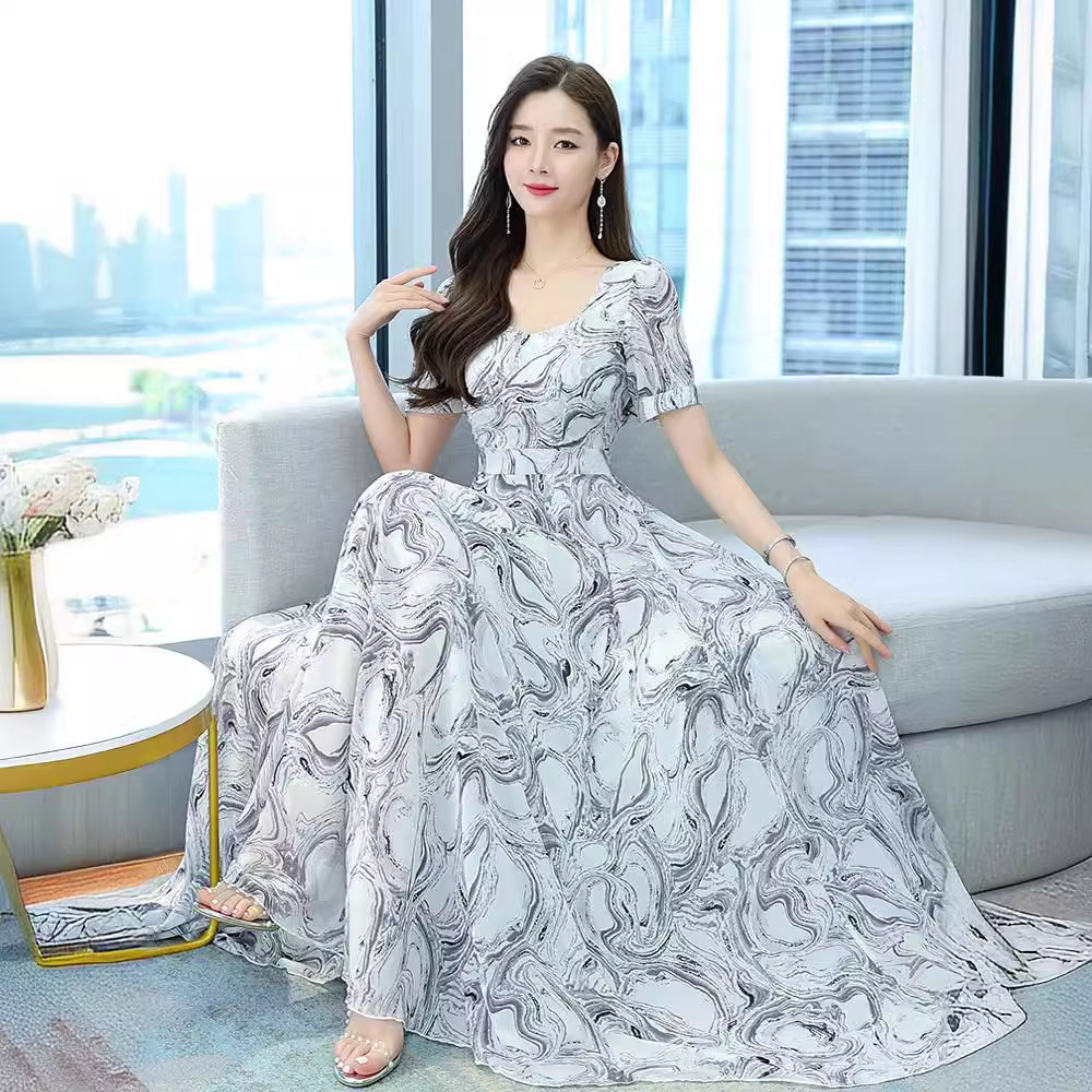모조 아이스 실크 원피스 여자의 여름 산야 해변 휴가 통통한 기질 고급 꽃 우아한 해변 원피스 롱 스커트