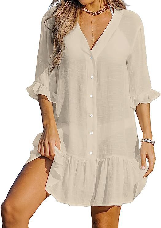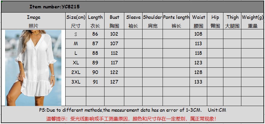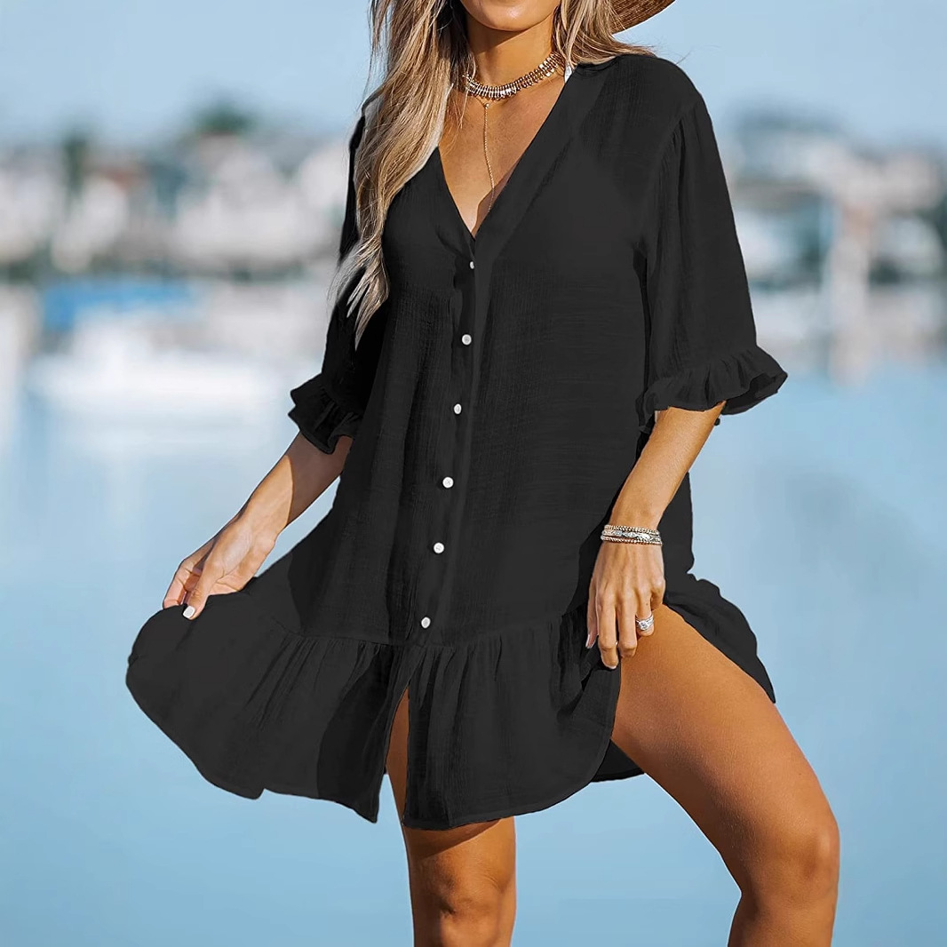 같은 날 배송 유럽과 미국 2023 여름 브이넥 프릴 원피스 아마존 단색 비치 스커트 선 스크린 블라우스 여성