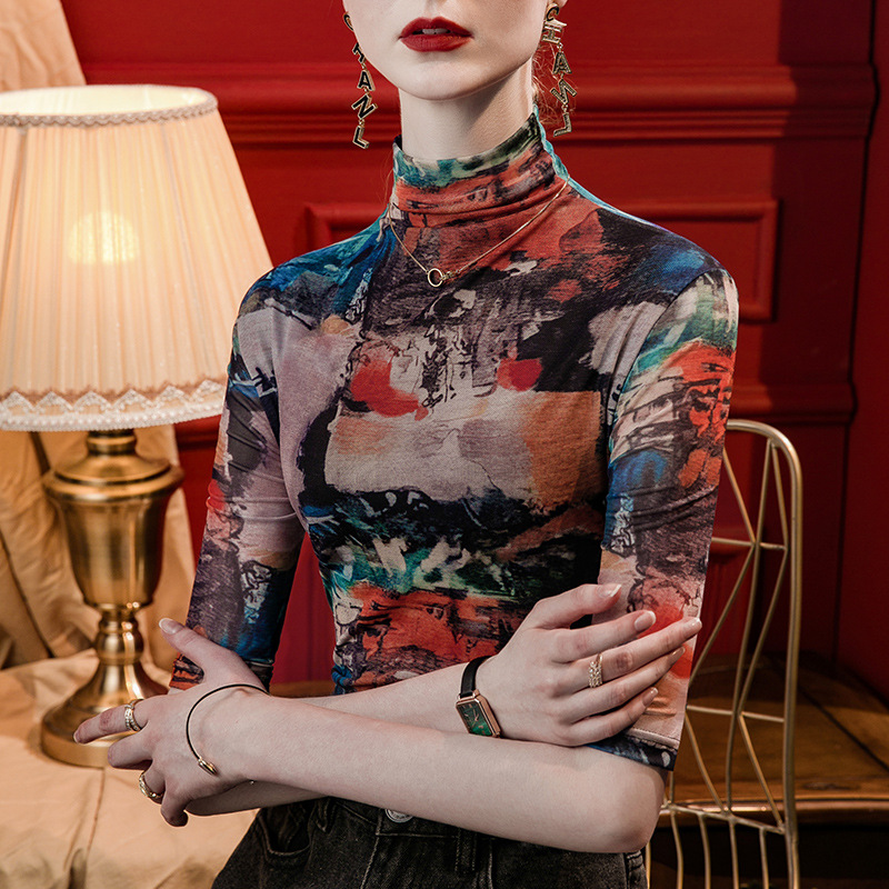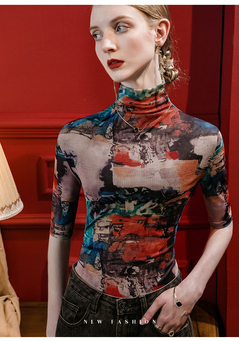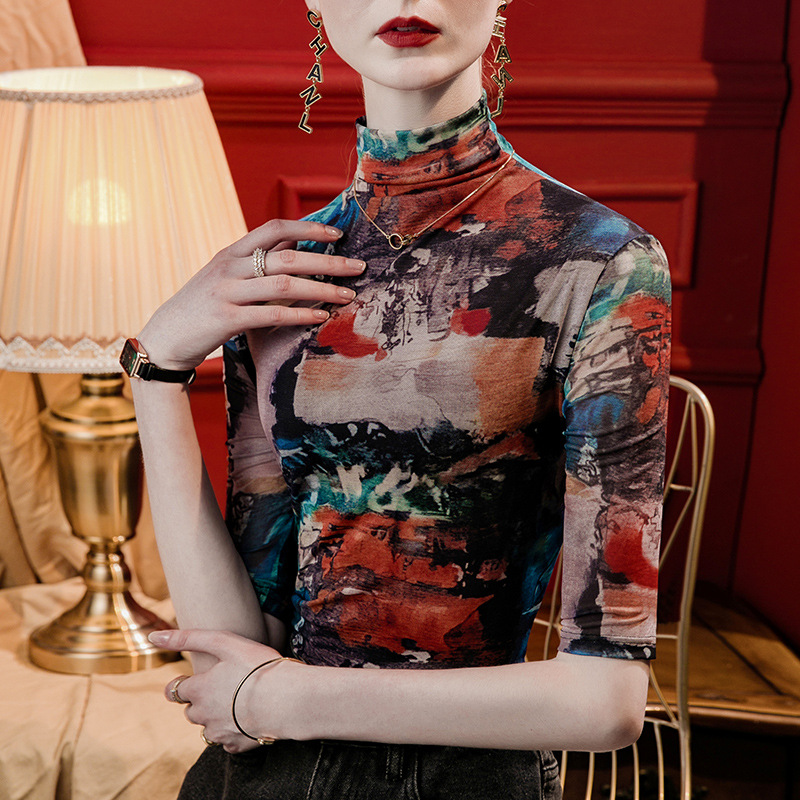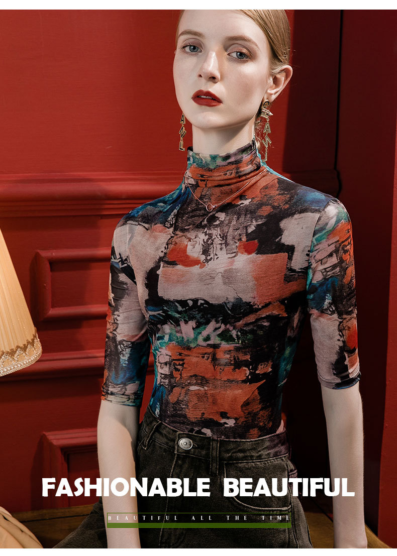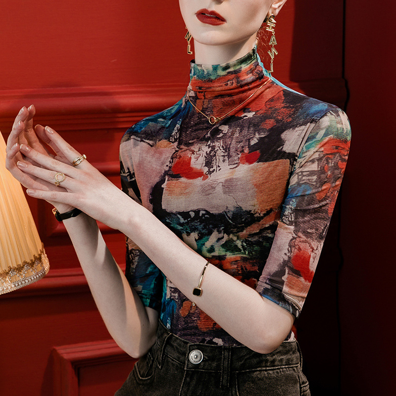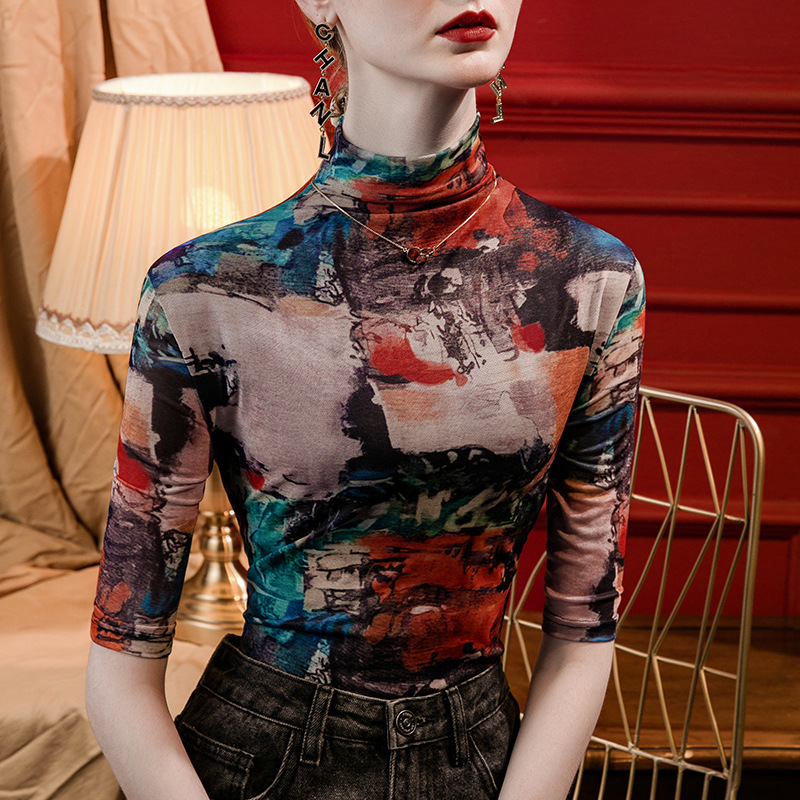 세로 칼라 메쉬 프린트 베이스 레이어 셔츠 여성용 반소매 슬림핏 2023 가을 중간 소매 스타일리시 탑 올매치 스몰 셔츠