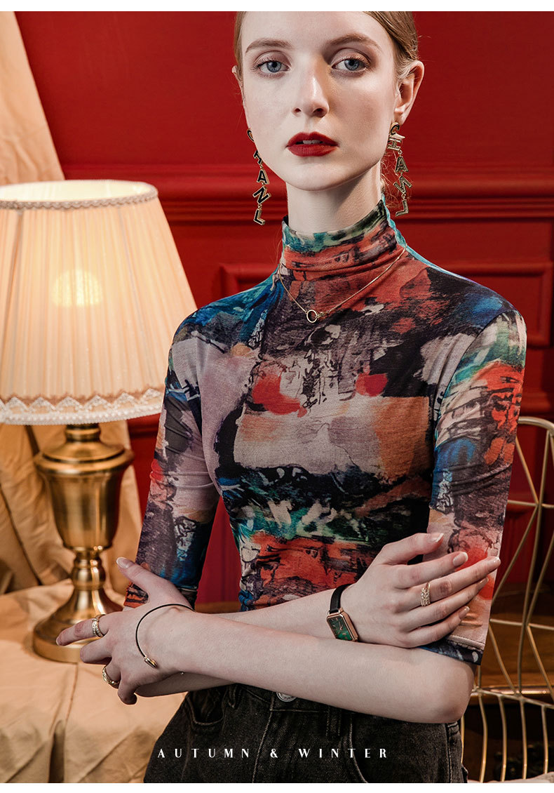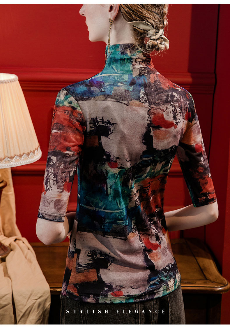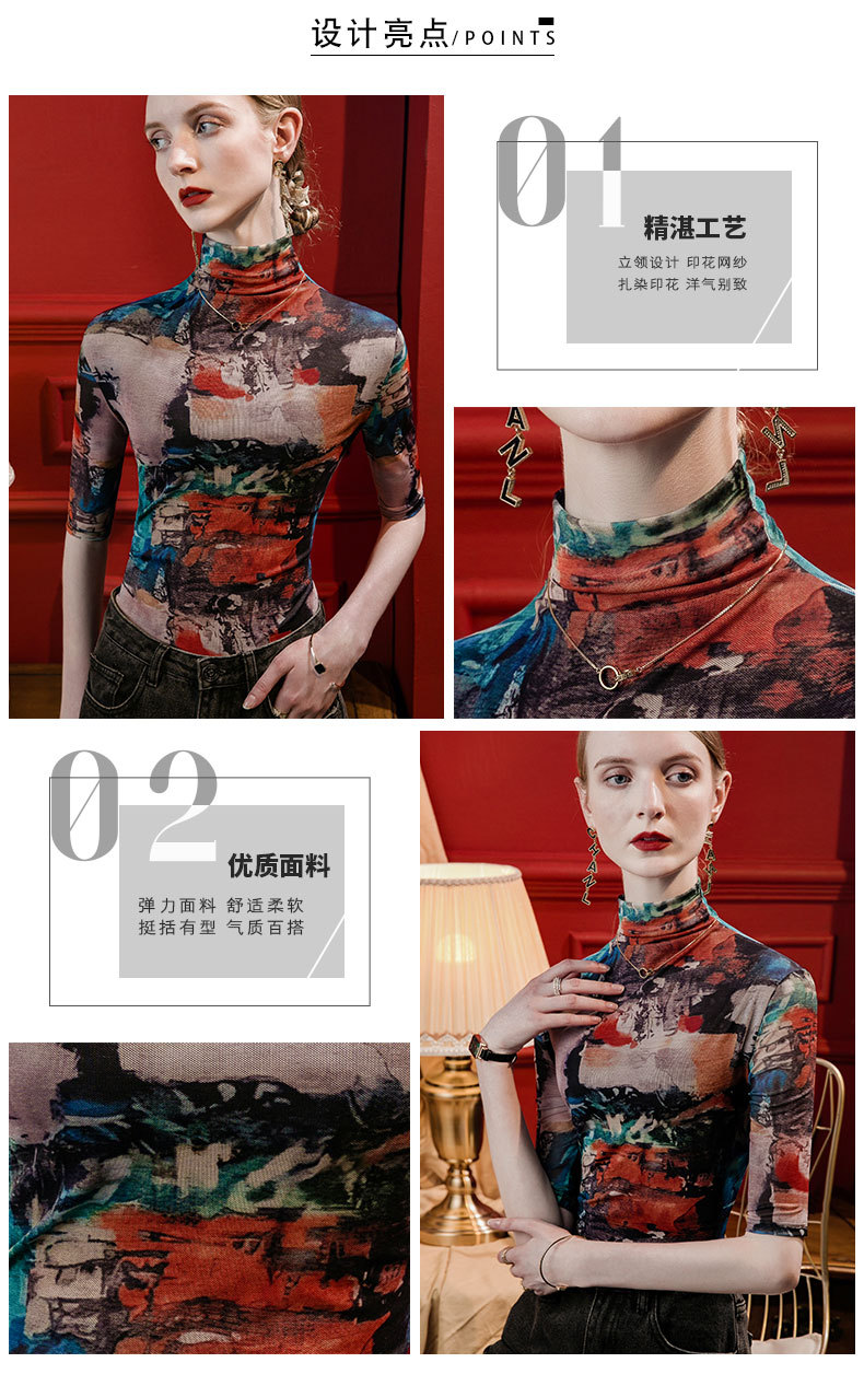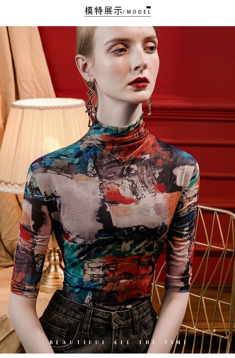 세로 칼라 메쉬 프린트 베이스 레이어 셔츠 여성용 반소매 슬림핏 2023 가을 중간 소매 스타일리시 탑 올매치 스몰 셔츠