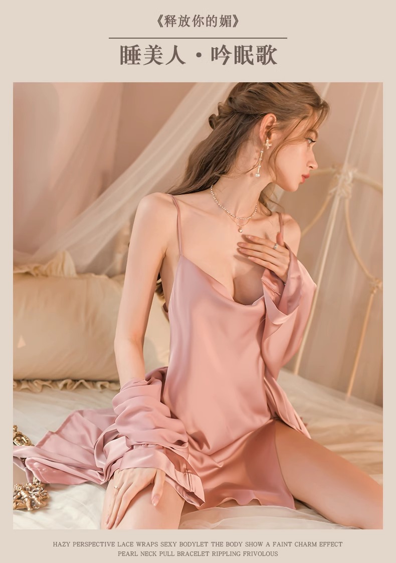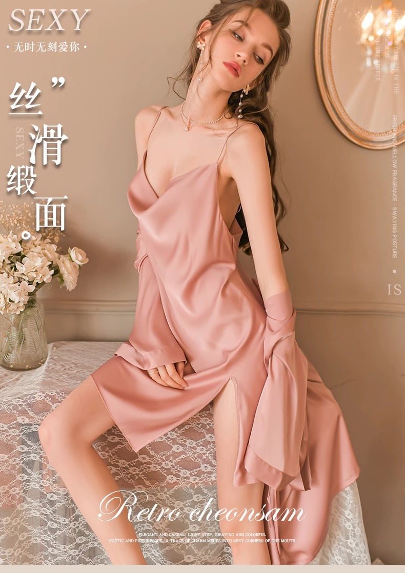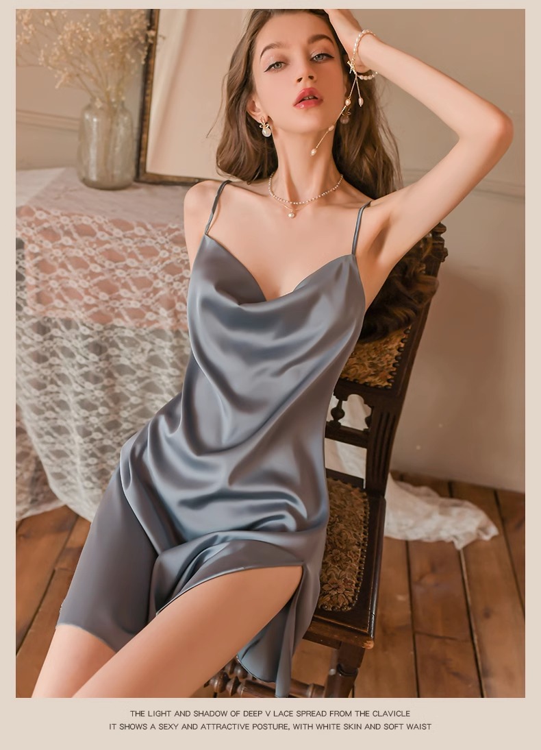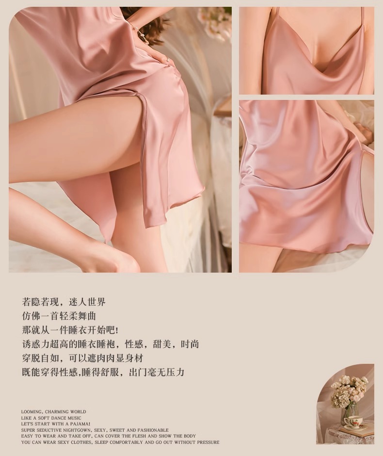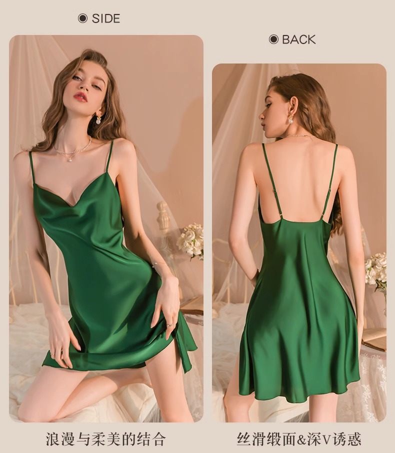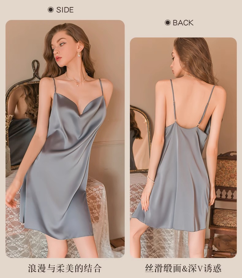 잠옷 여자의 여름 섹시한 얼음 실크 슬링 잠옷 짧은 치마 등이없는 스윙 칼라 분할 고급 실크 홈웨어 얇은