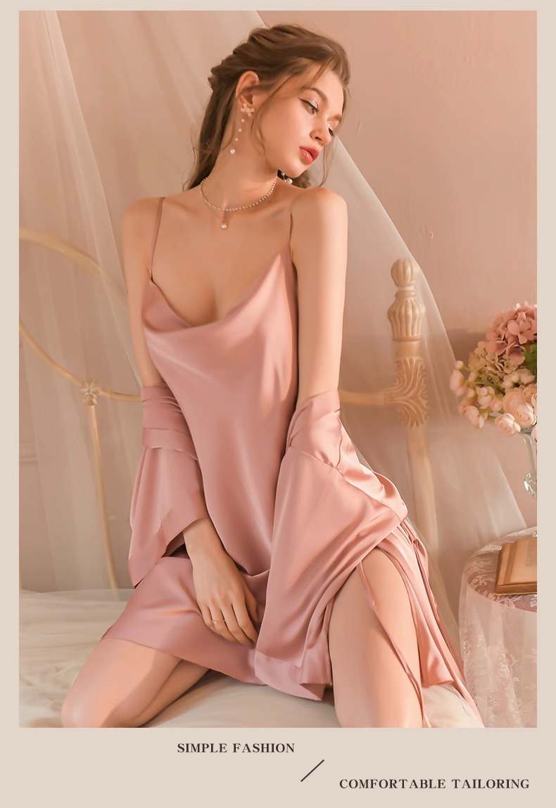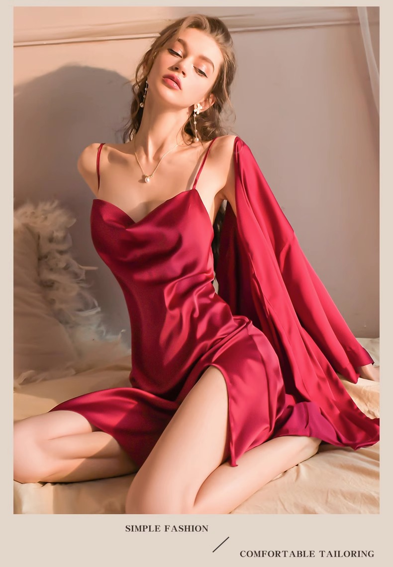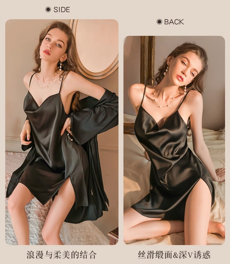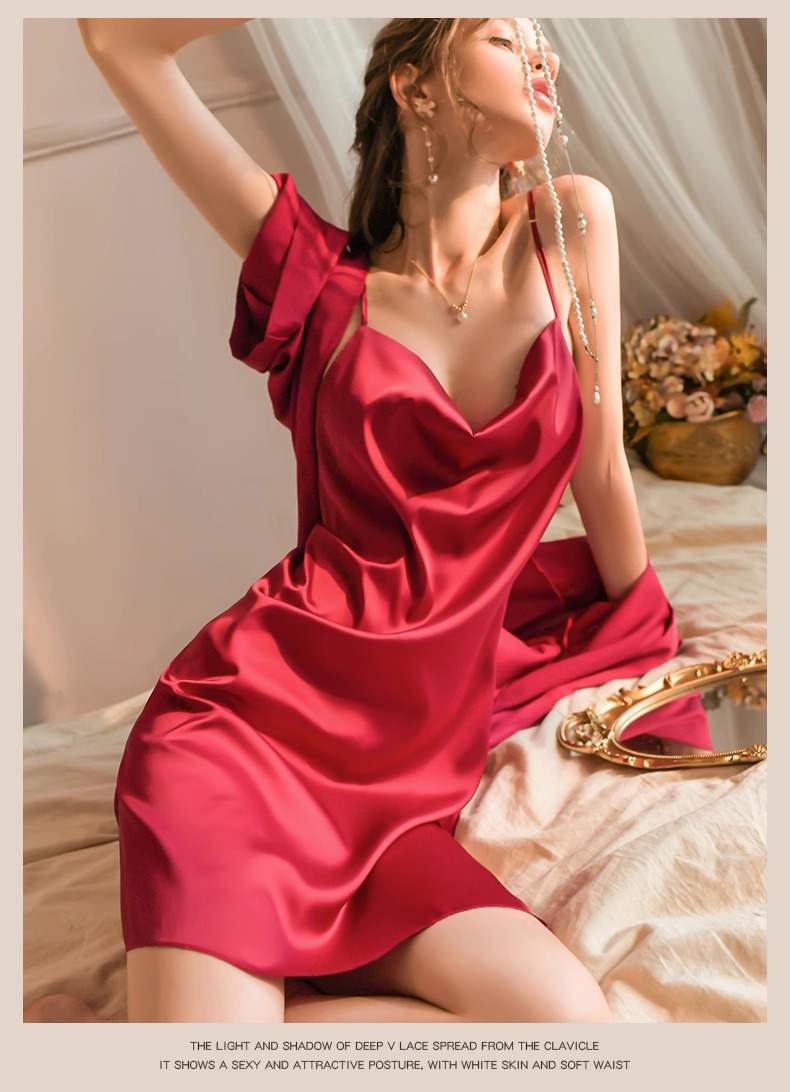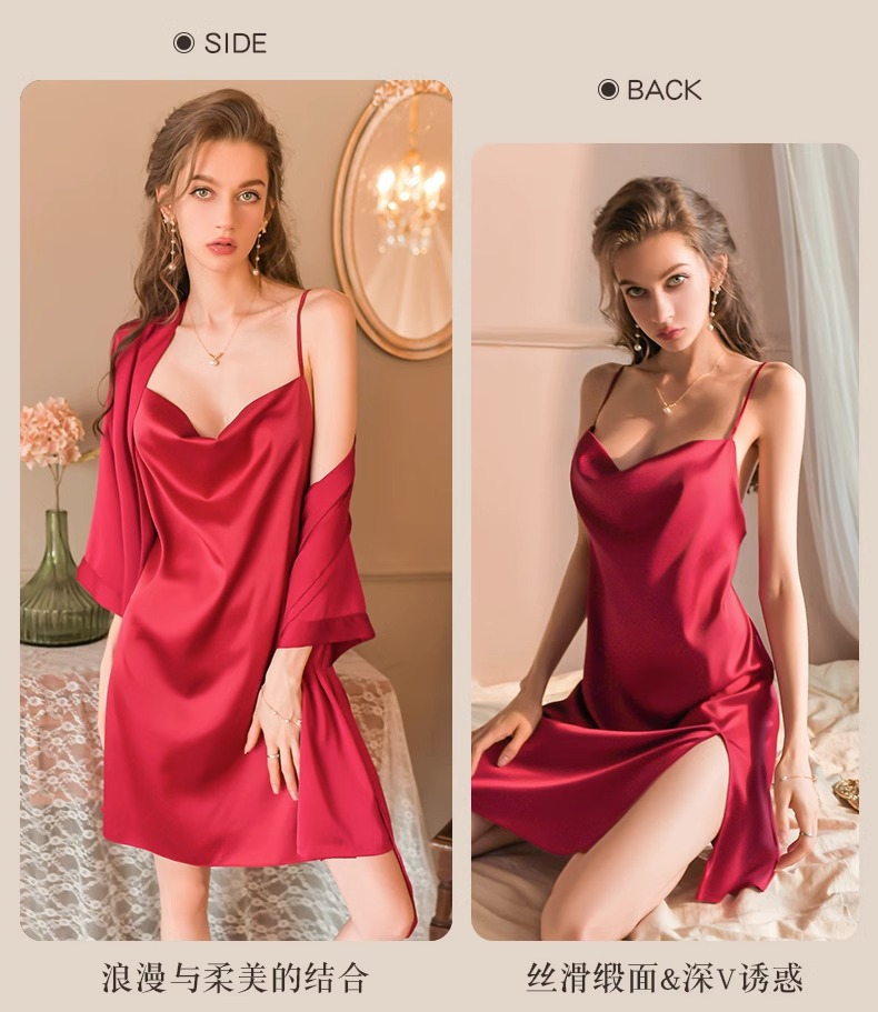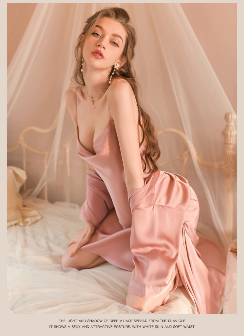 잠옷 여자의 여름 섹시한 얼음 실크 슬링 잠옷 짧은 치마 등이없는 스윙 칼라 분할 고급 실크 홈웨어 얇은