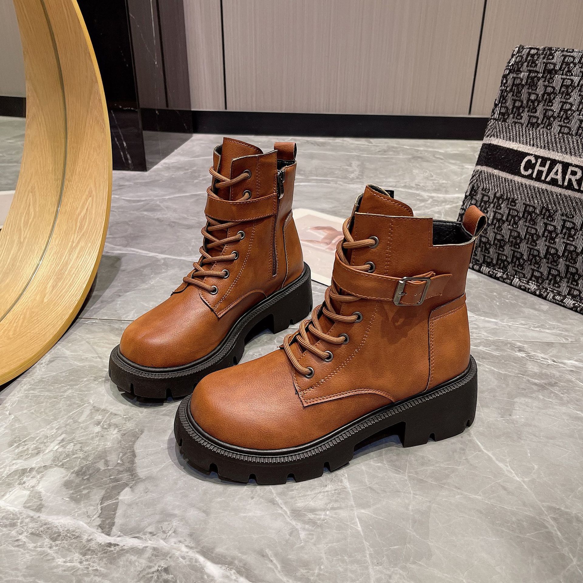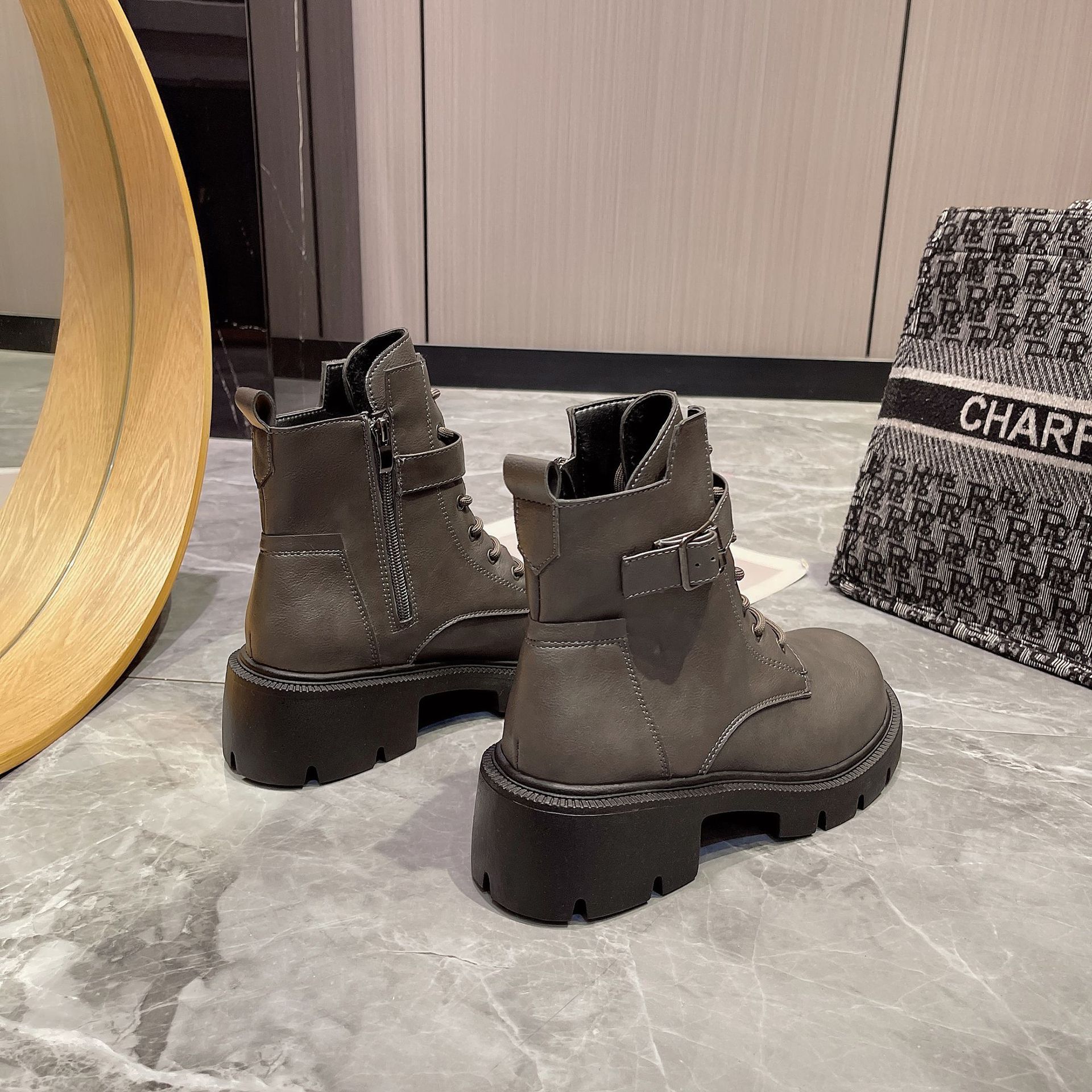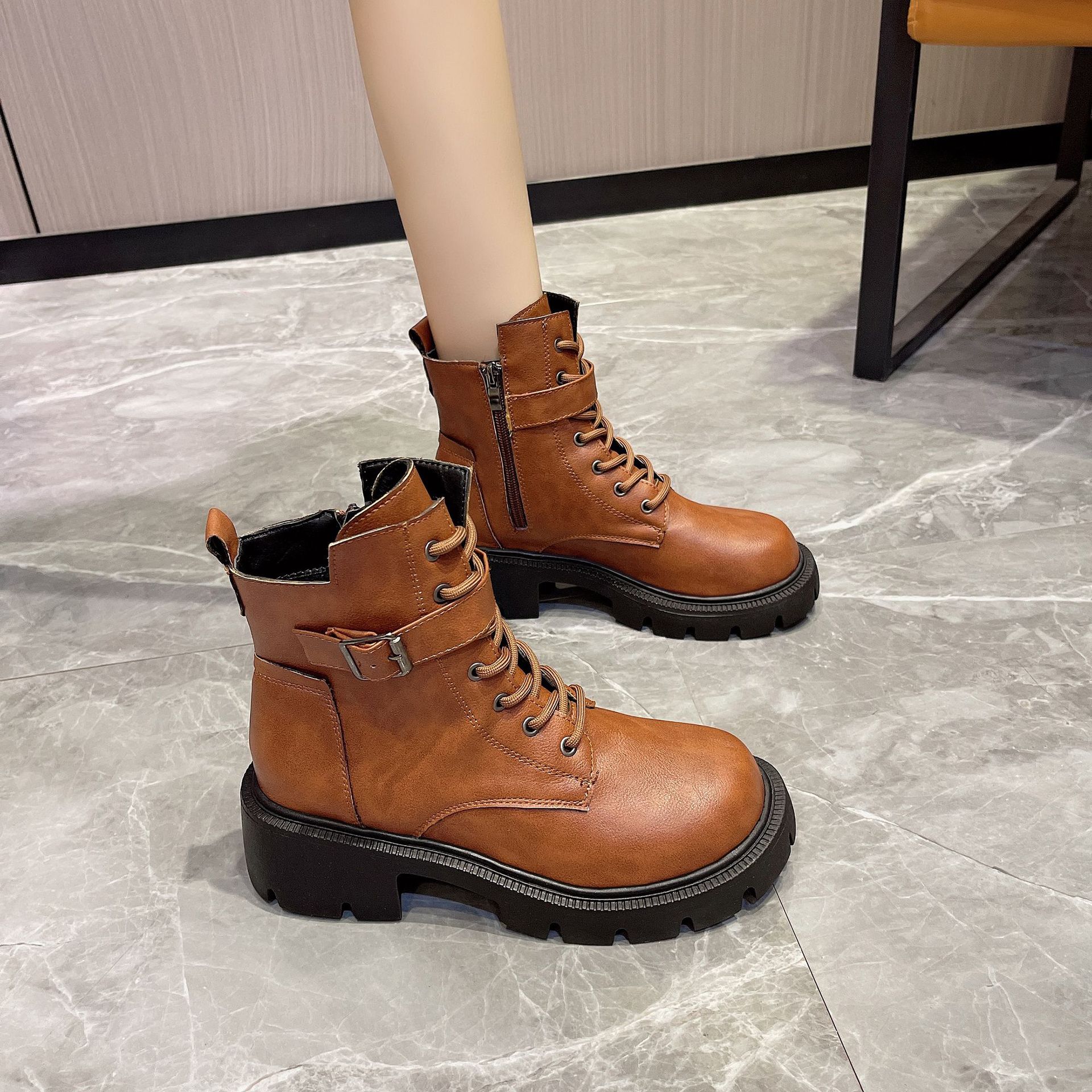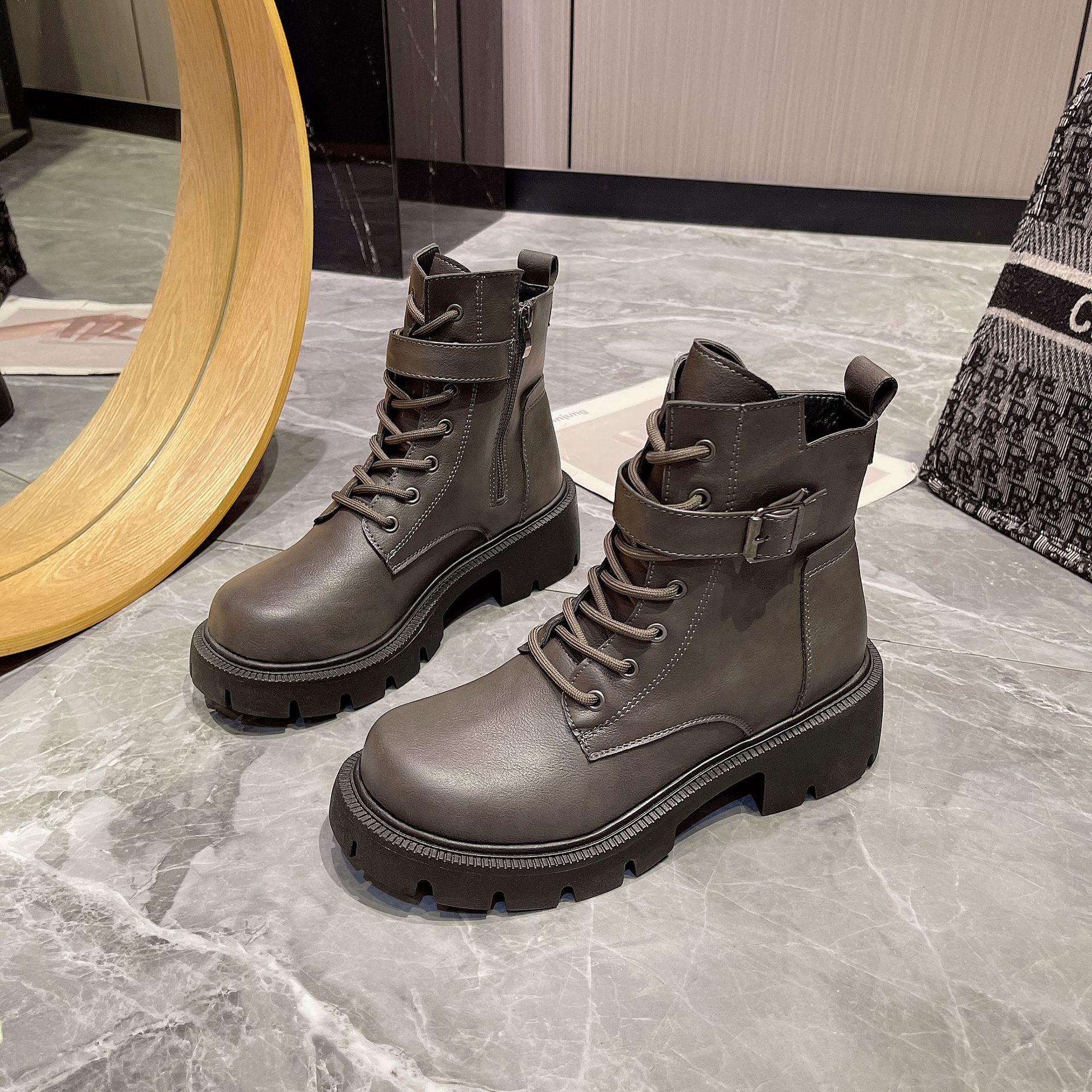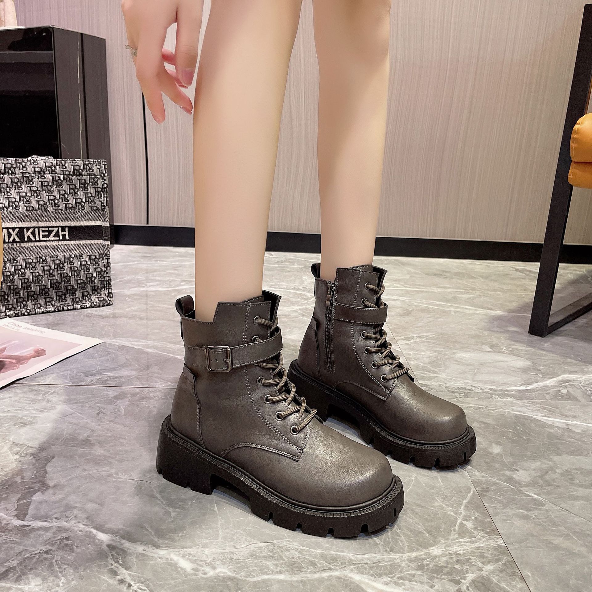마틴 부츠 여자의 2023 새로운 가을과 겨울 영국 스타일 오토바이 부츠 두꺼운 바닥 벨트 버클 복고풍 짧은 부츠 플러스 사이즈 부츠