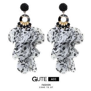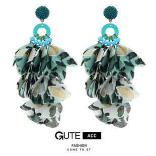 古特跨境爆款手工布艺花卉耳环女 欧美时尚夸张豹纹流苏耳饰批发