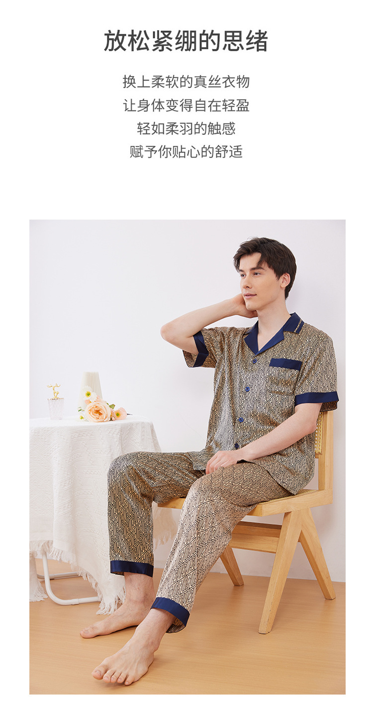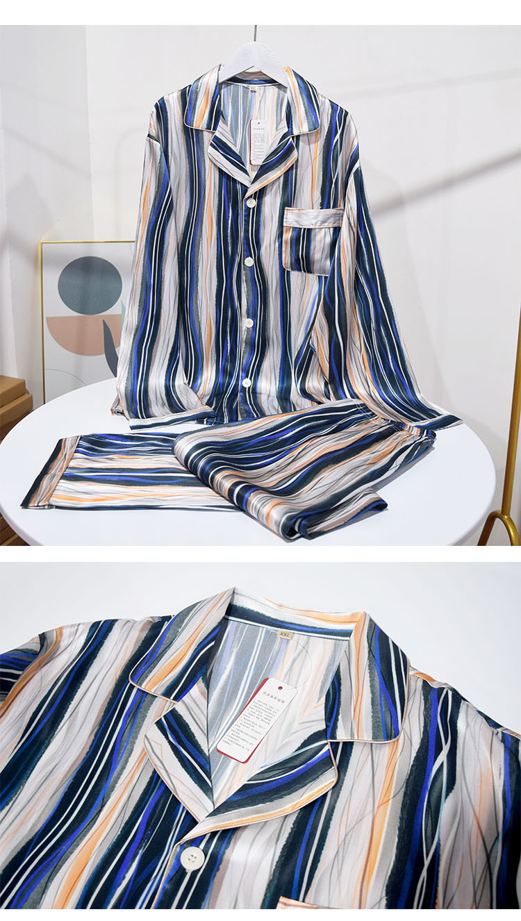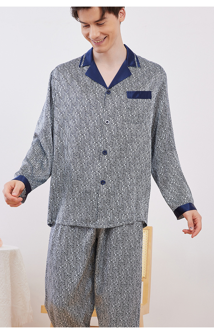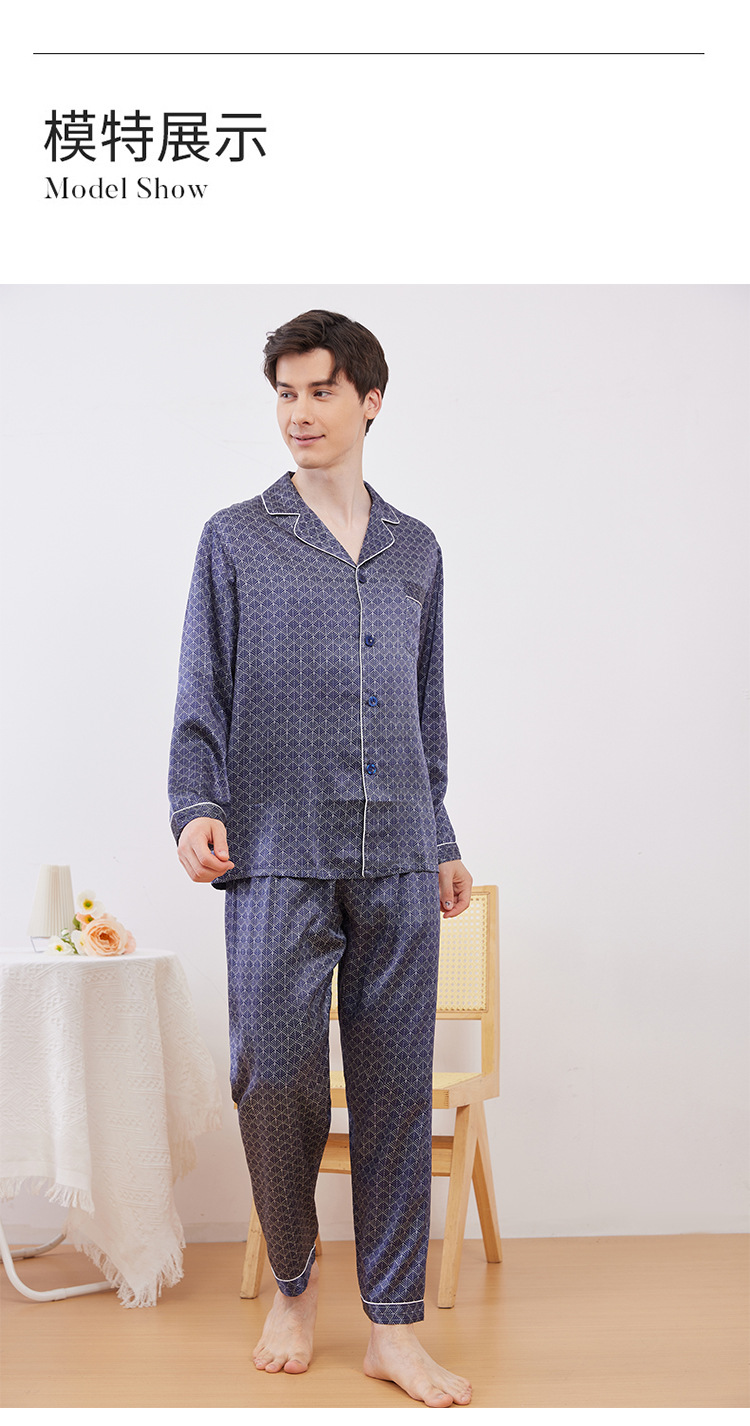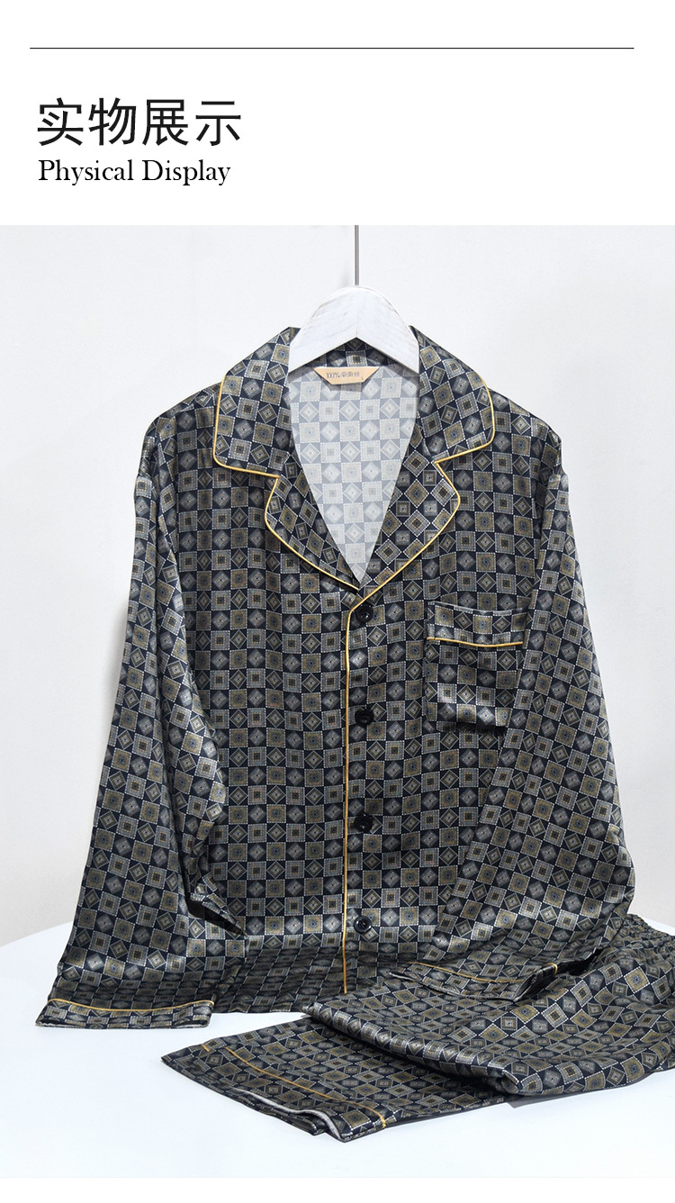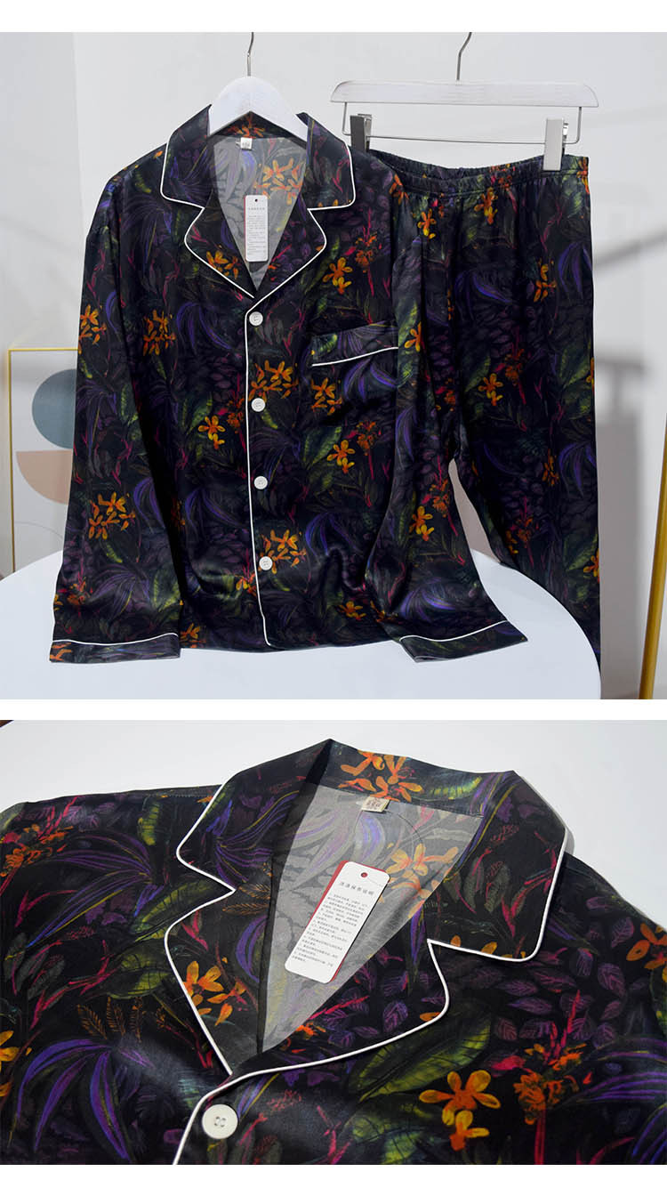 男士喷绘印花重磅真丝睡衣套装100%桑蚕丝家居服时尚绅士长袖长裤两件套装春秋季起居服多款花色可选4XL加大码胖子跨境直播一件代发