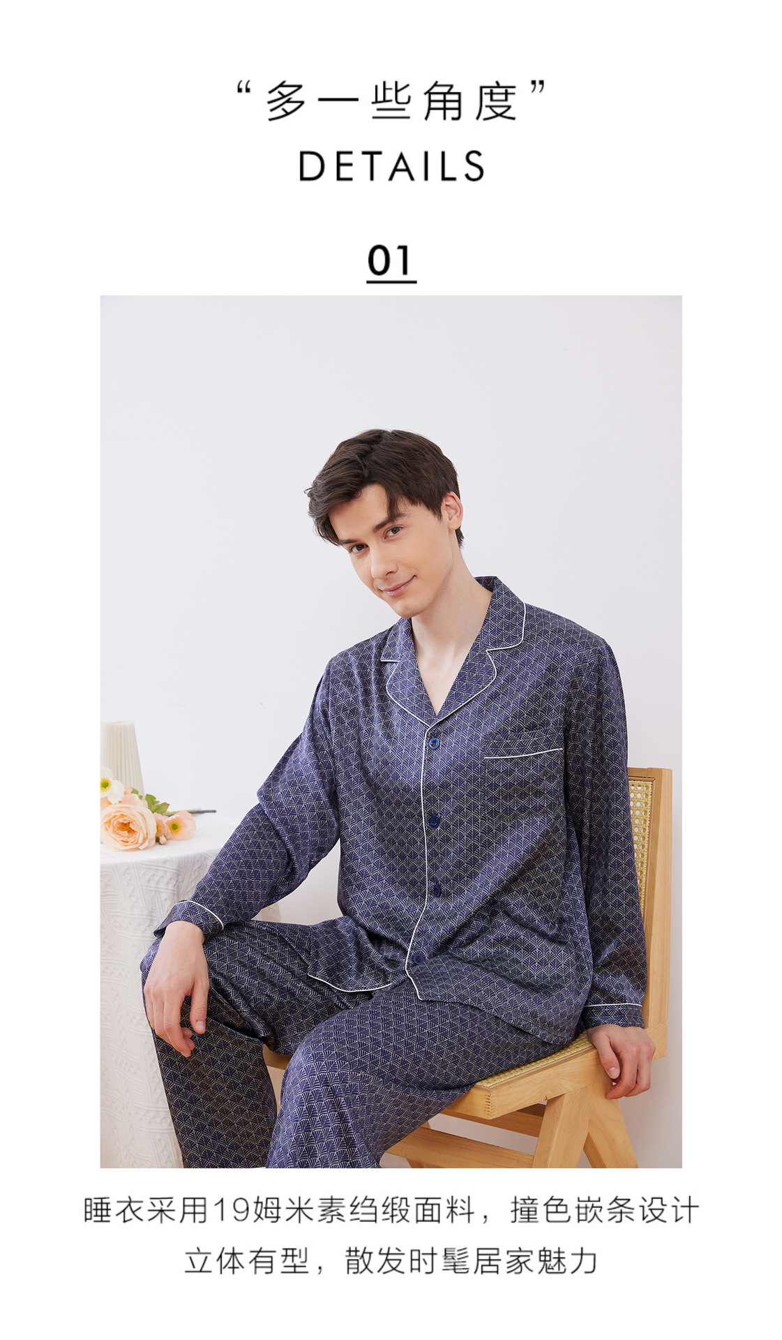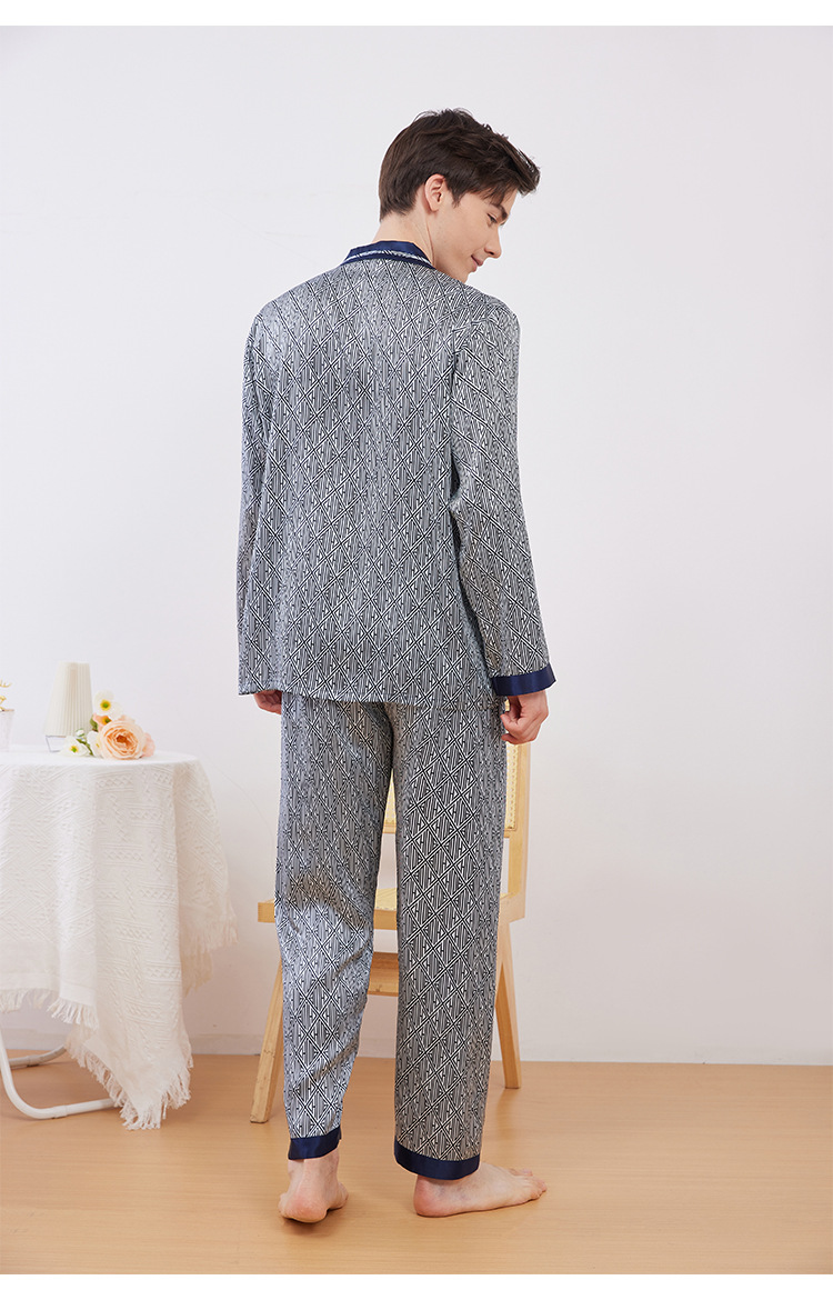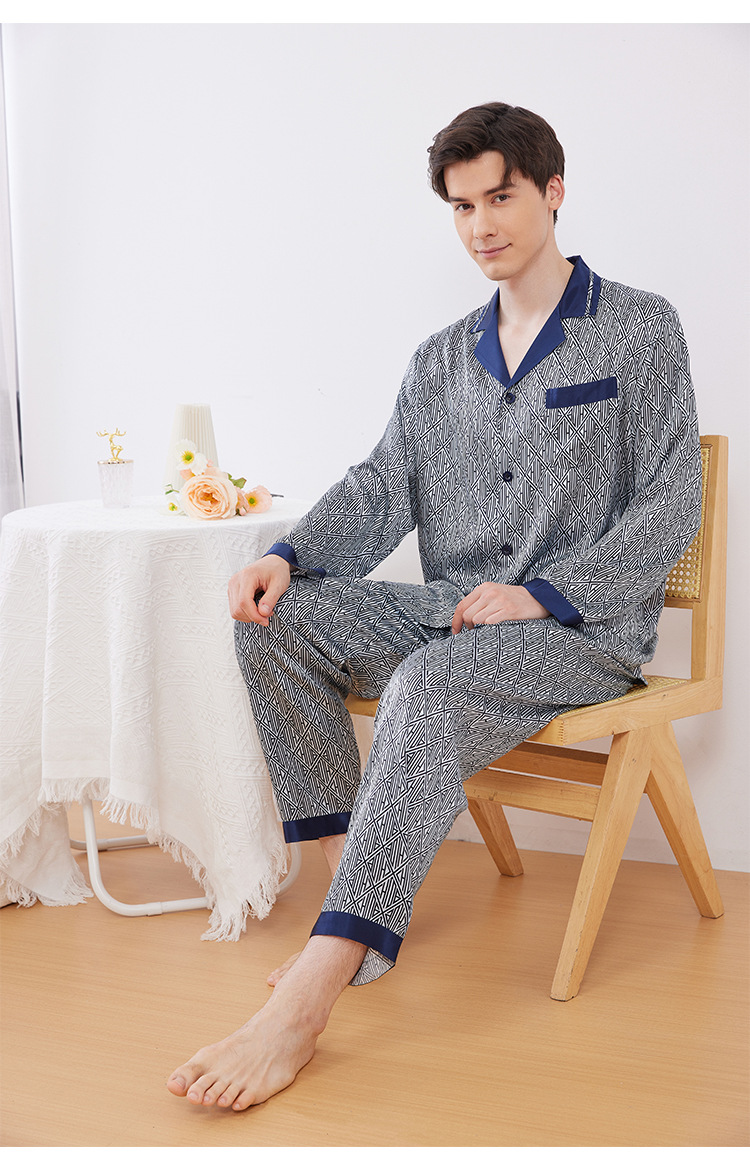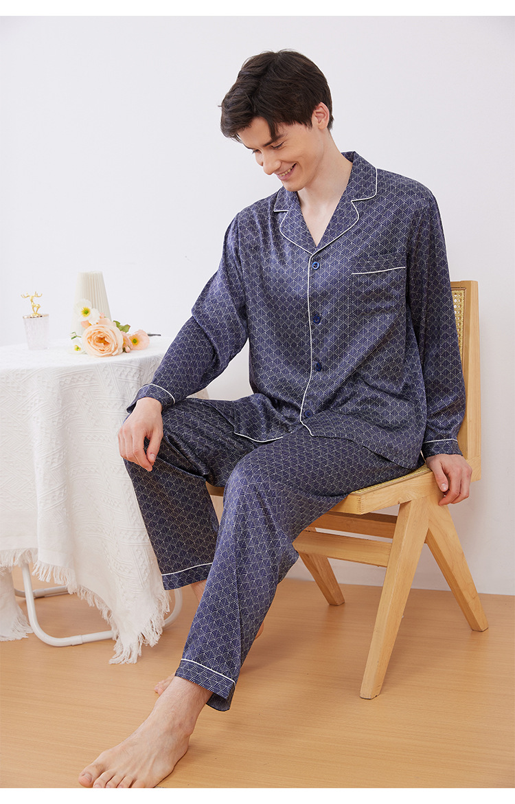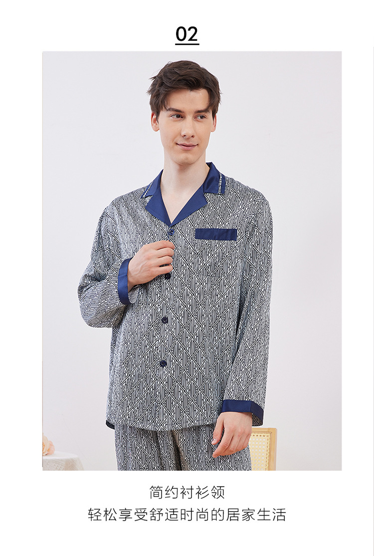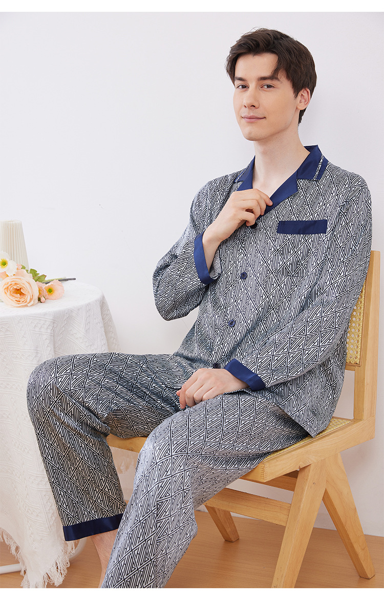 男士喷绘印花重磅真丝睡衣套装100%桑蚕丝家居服时尚绅士长袖长裤两件套装春秋季起居服多款花色可选4XL加大码胖子跨境直播一件代发