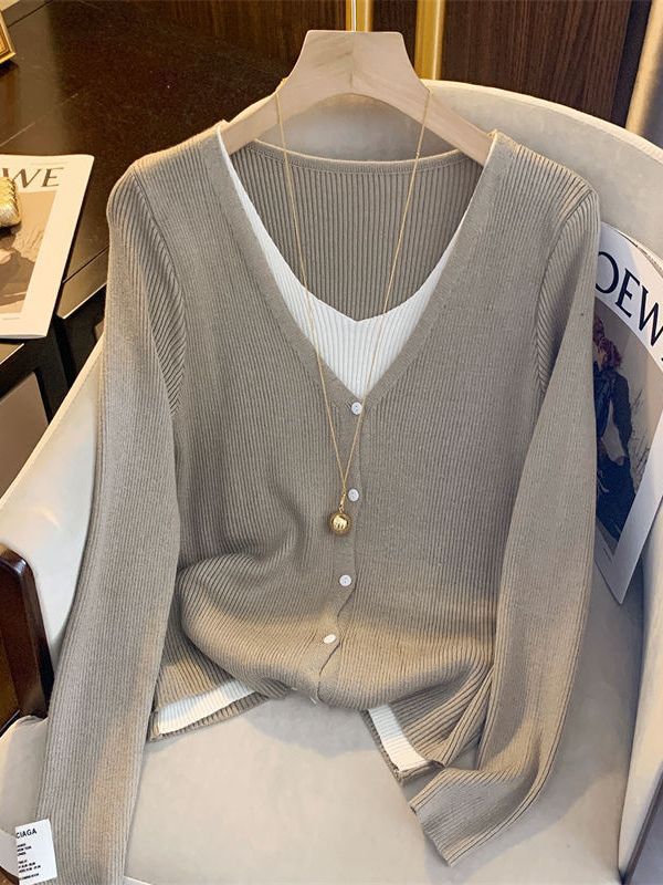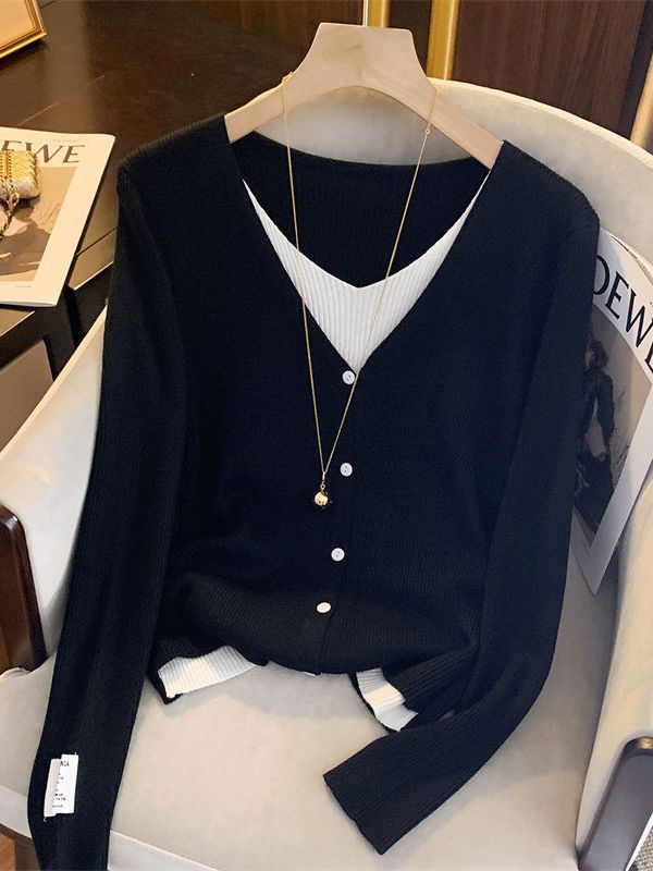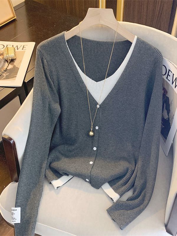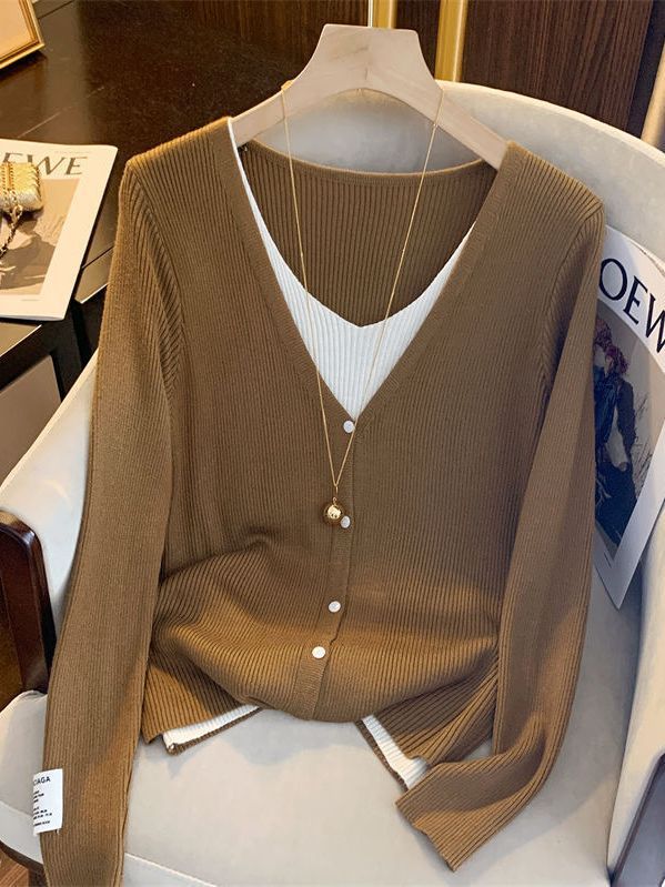 2023 새로운 가짜 투피스 니트 스웨터 코트 여성용 슬리밍 긴팔 우아한 V-넥 니트 가을 스웨터 탑