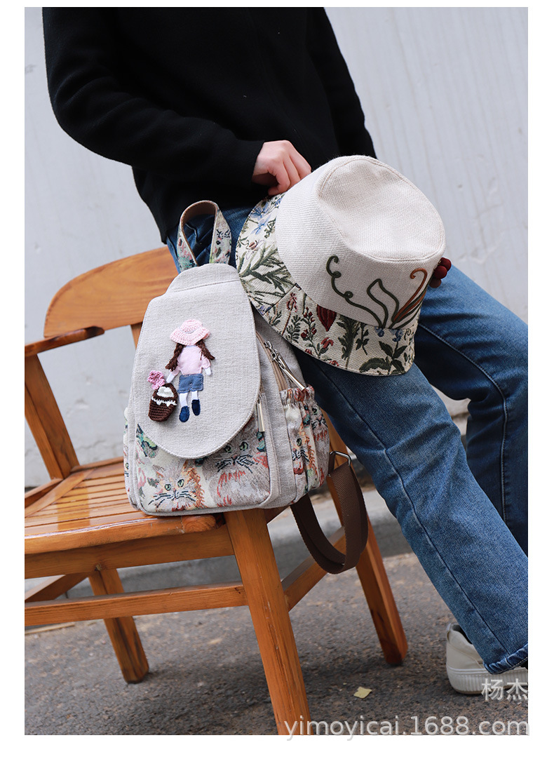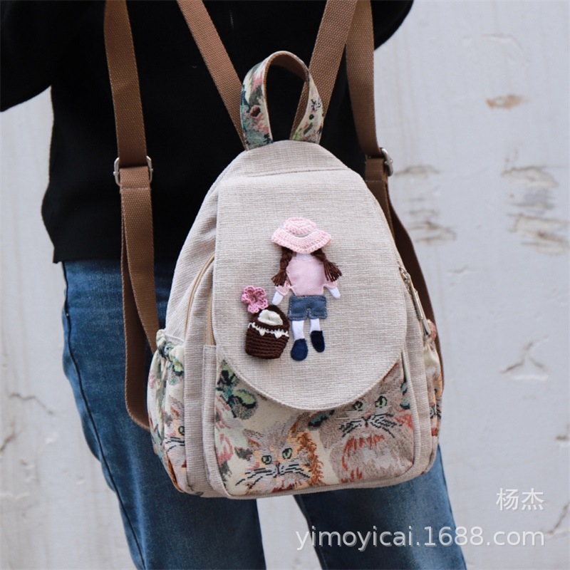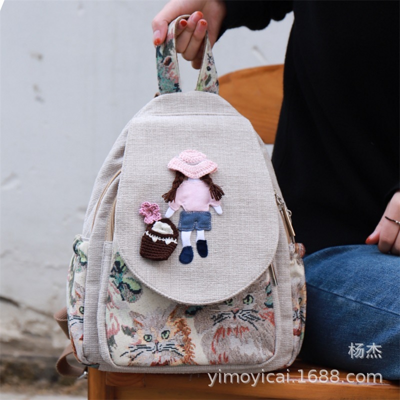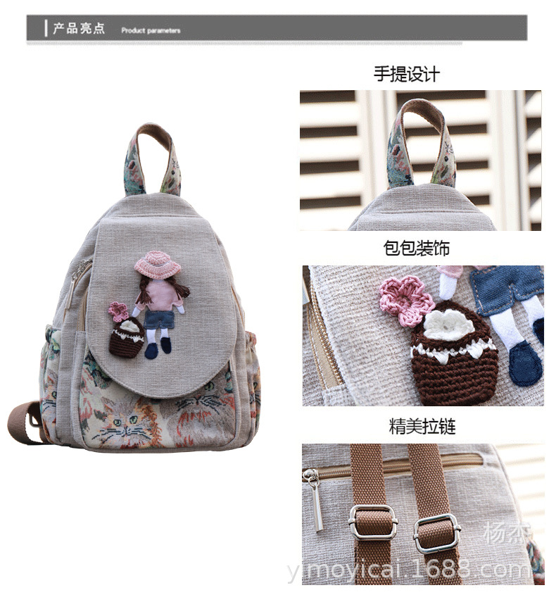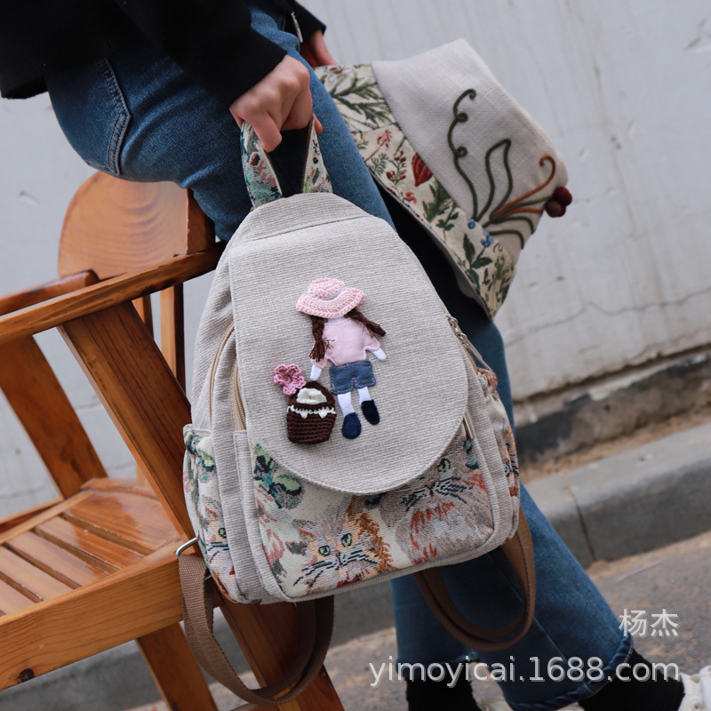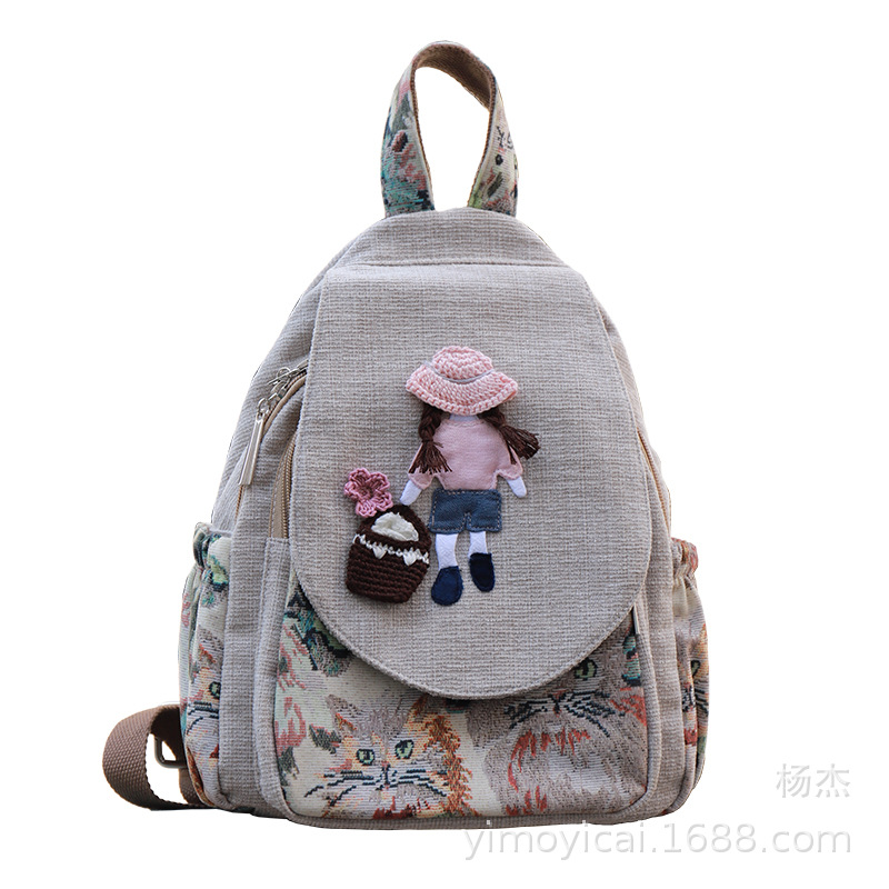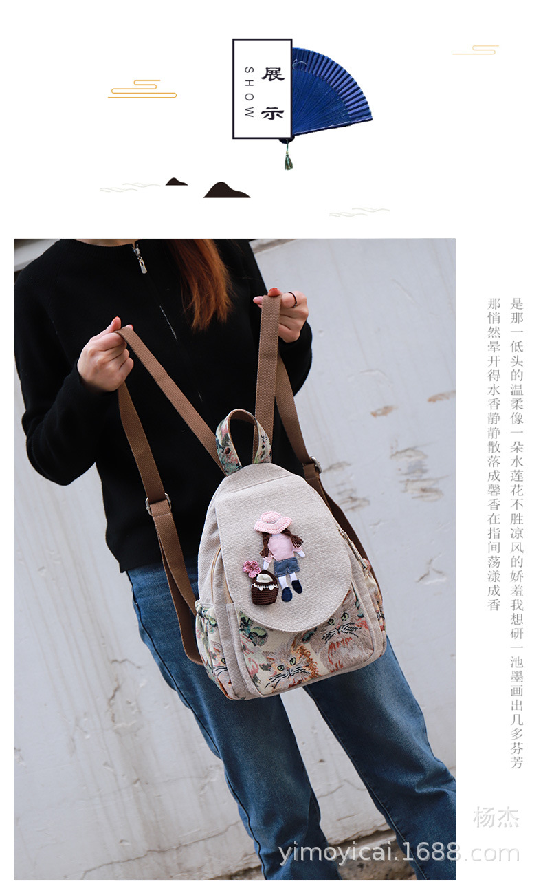 예술적 캔버스 더블 레이어 작은 배낭 캐주얼 작은 신선한 Hanfu 여성 배낭 편리한 매일 나가는 배낭