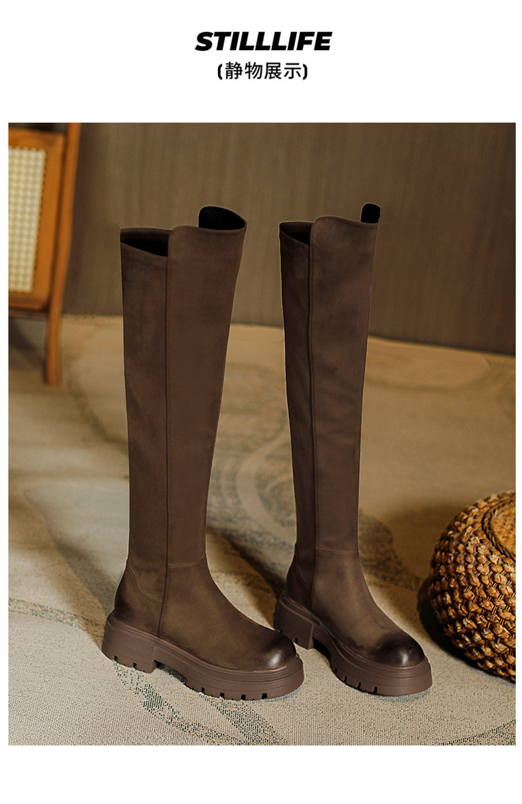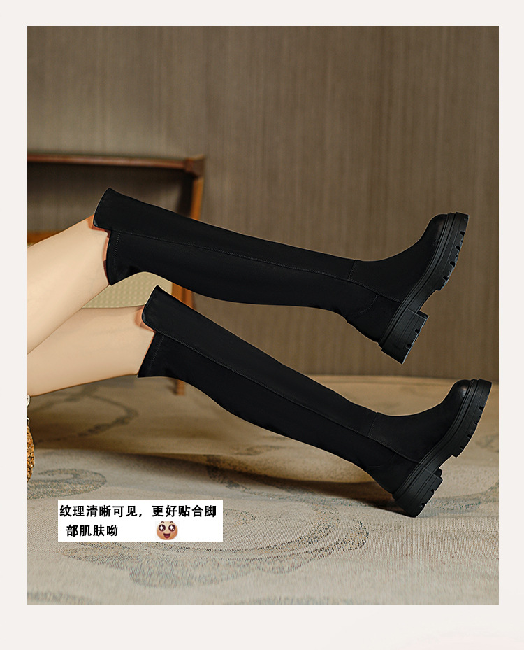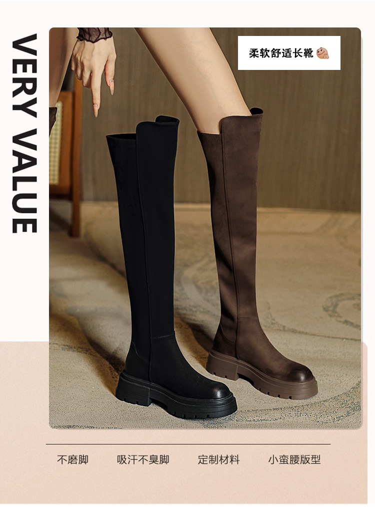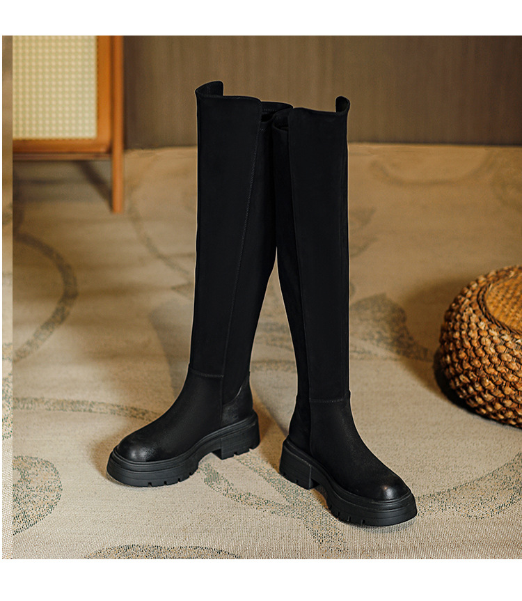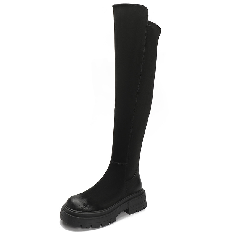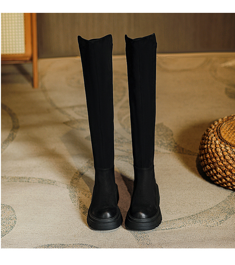 블랙 무릎 높이 부츠 여성용 2023 겨울 새 스웨이드 라운드 헤드 두꺼운 바닥 두꺼운 뒤꿈치 슈퍼 얇은 탄성 부츠 도매