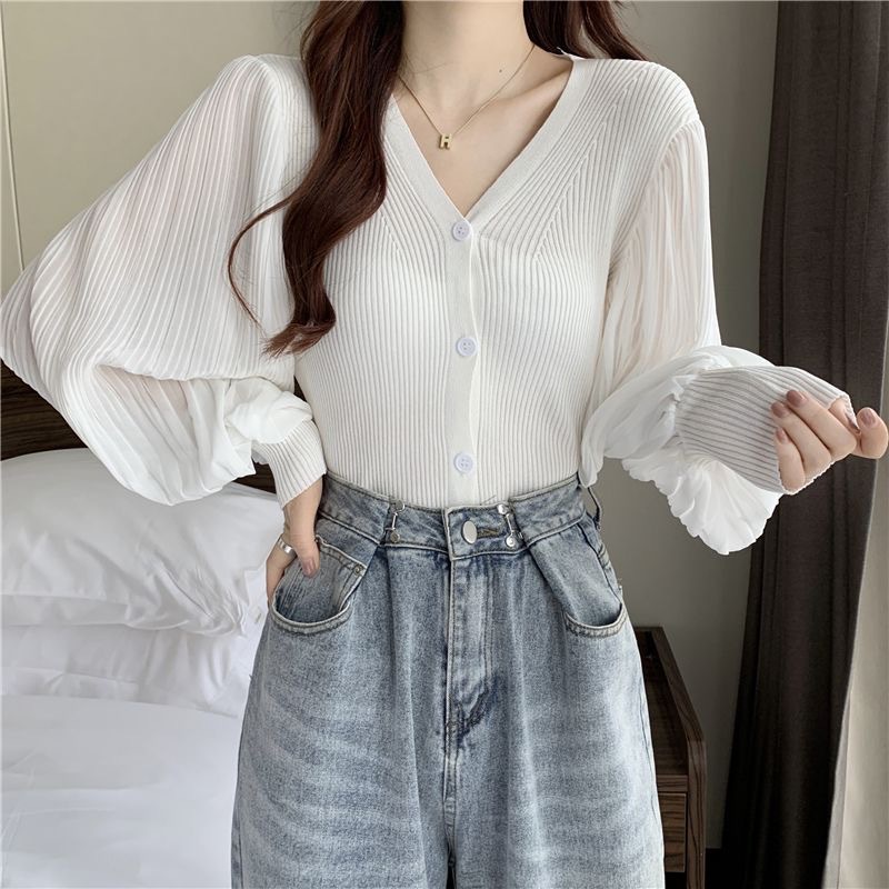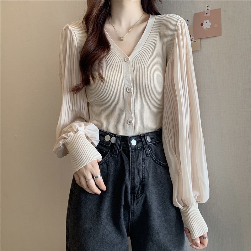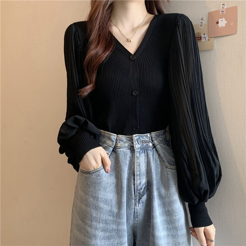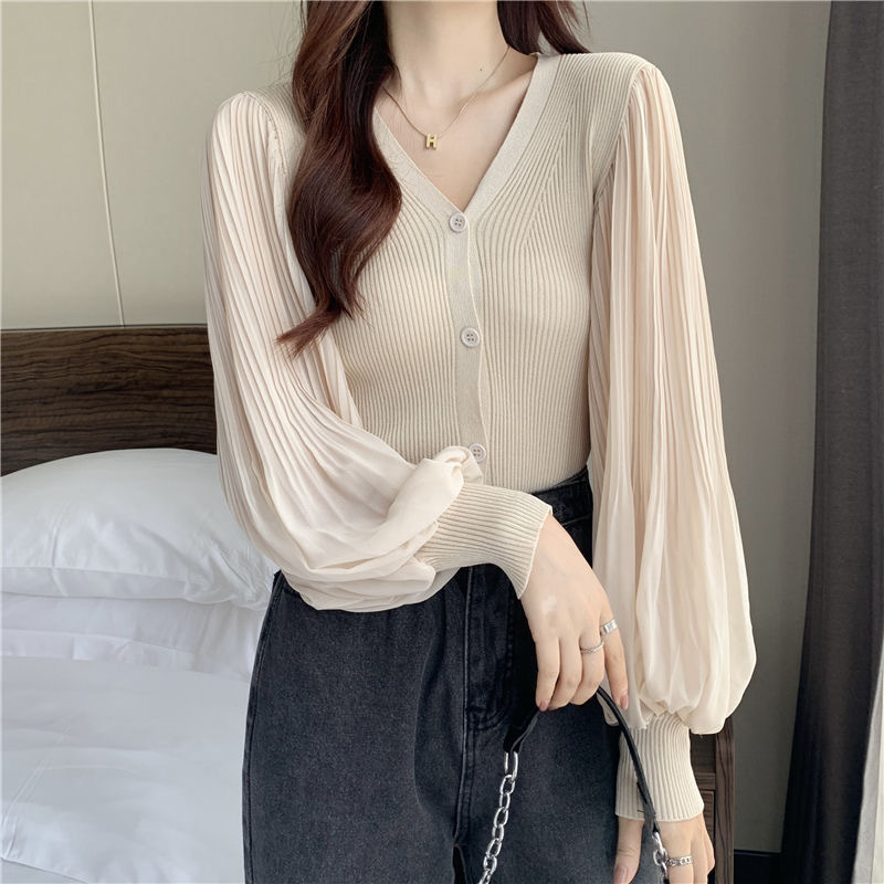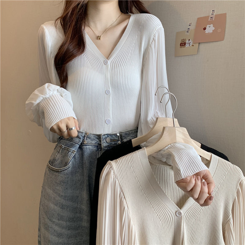 브이넥 랜턴 슬리브 쉬폰 스티칭 우아한 여성 여름 2023 싱글 브레스트 한국식 슬림 니트 가디건 탑