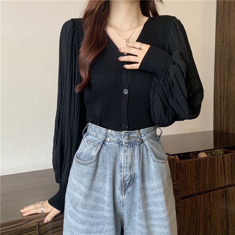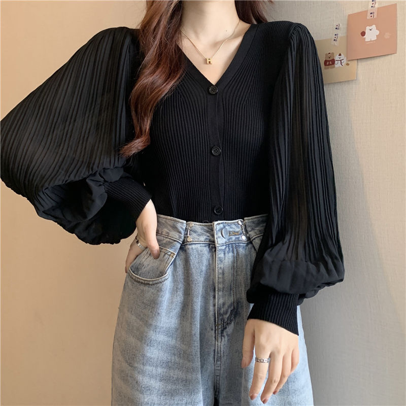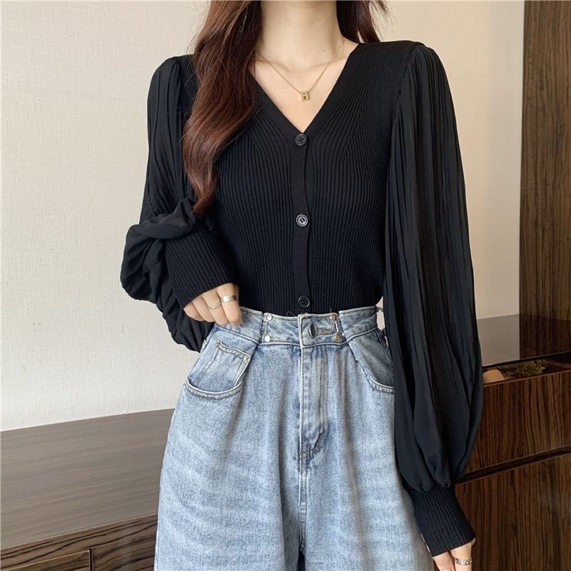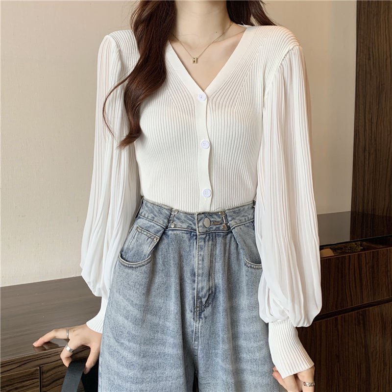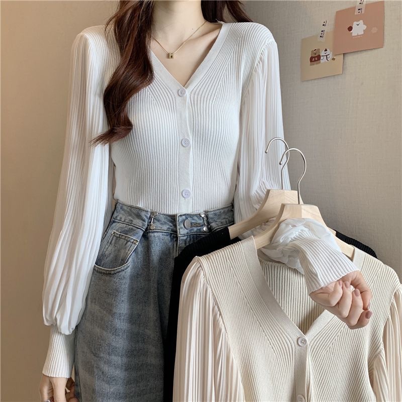 브이넥 랜턴 슬리브 쉬폰 스티칭 우아한 여성 여름 2023 싱글 브레스트 한국식 슬림 니트 가디건 탑