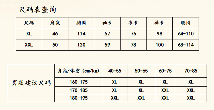 男士尺码表