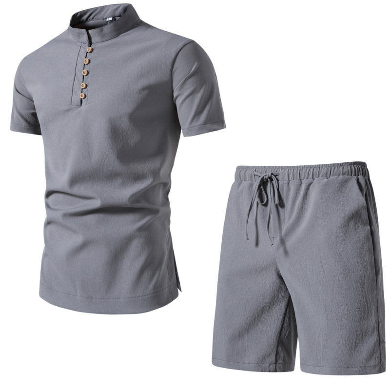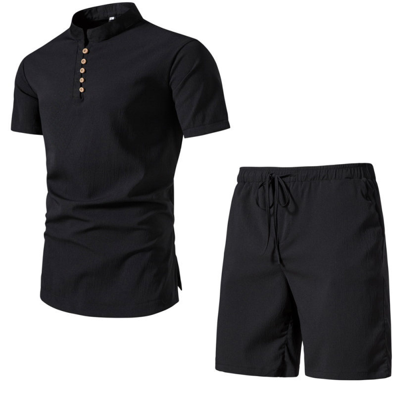 대외 무역 세트 남자의 2023 여름 남자의 중국 스타일 플러스 사이즈 짧은 소매 복고풍 셔츠 단색 비치 바지 반바지 세트