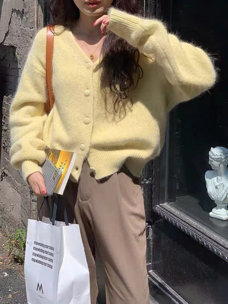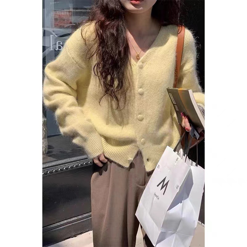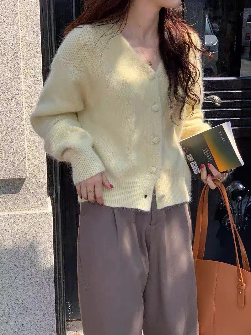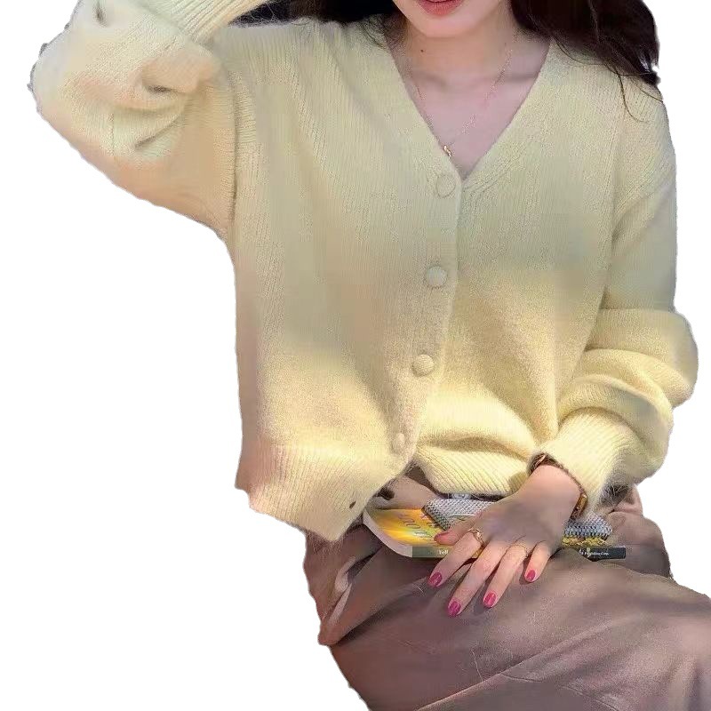 黄色浣熊绒v领针织开衫女秋冬慵懒软糯短款羊绒毛衣外套冬季加厚