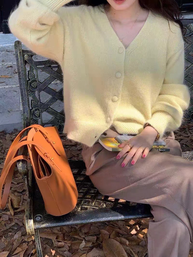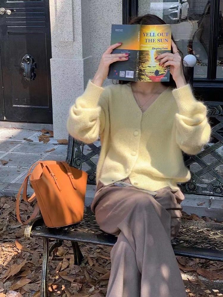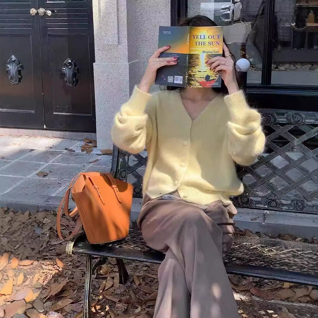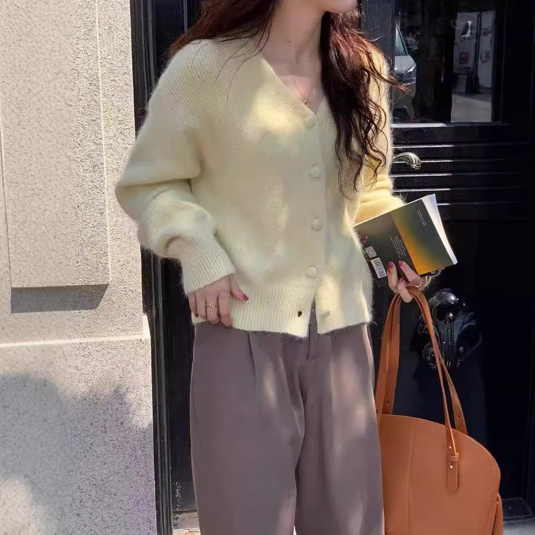 黄色浣熊绒v领针织开衫女秋冬慵懒软糯短款羊绒毛衣外套冬季加厚