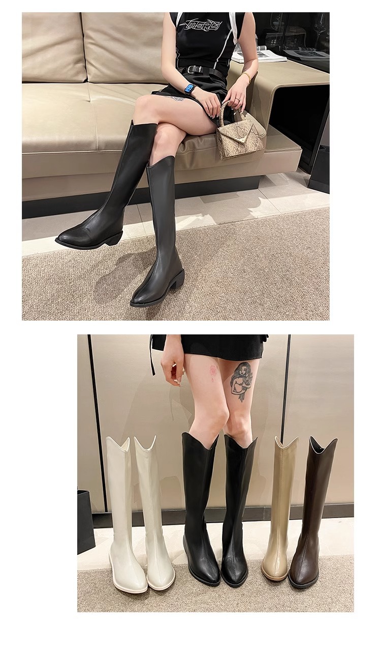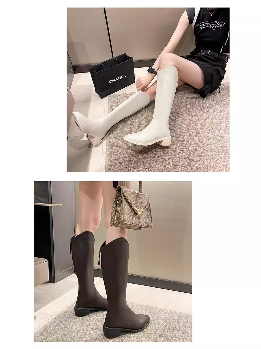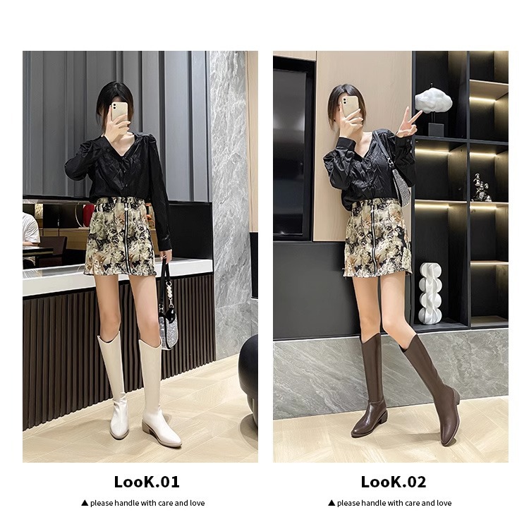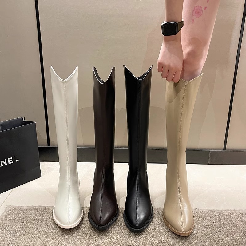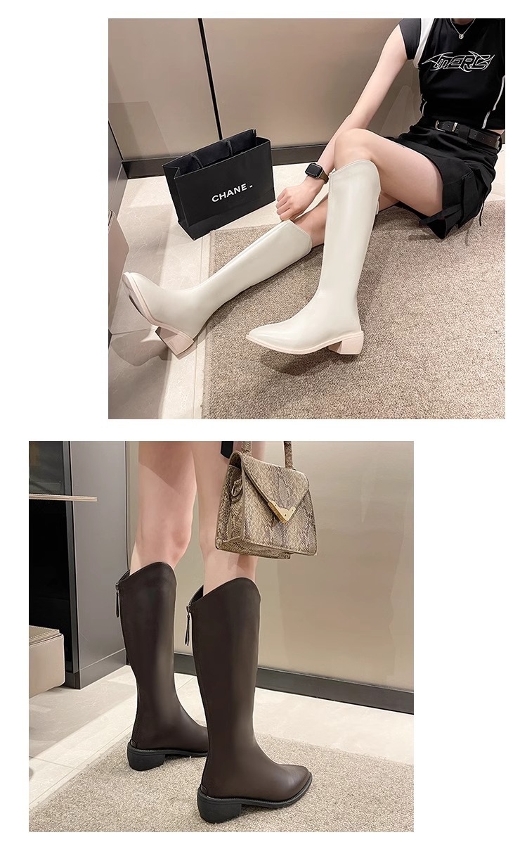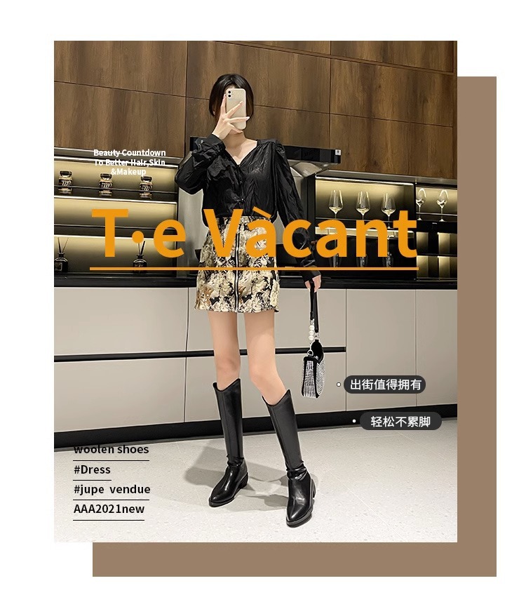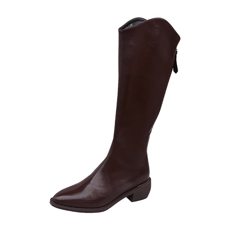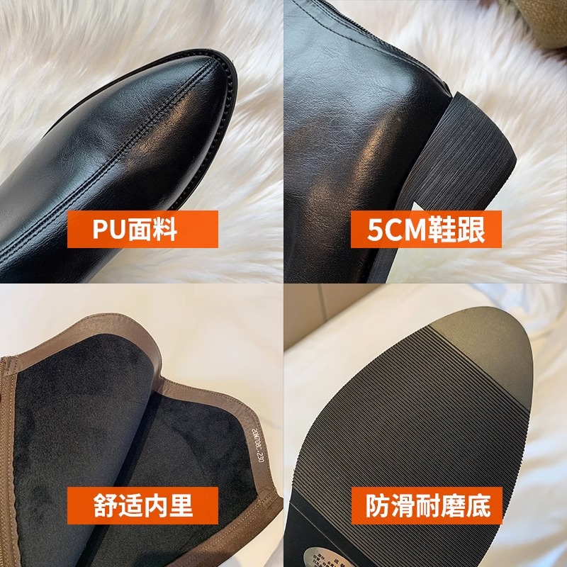 정품 가죽 부츠 V 입 밀크 티 컬러 브라운 봄, 가을 두꺼운 굽 부츠 여성 겨울 새로운 스타일 작은 하이 부츠