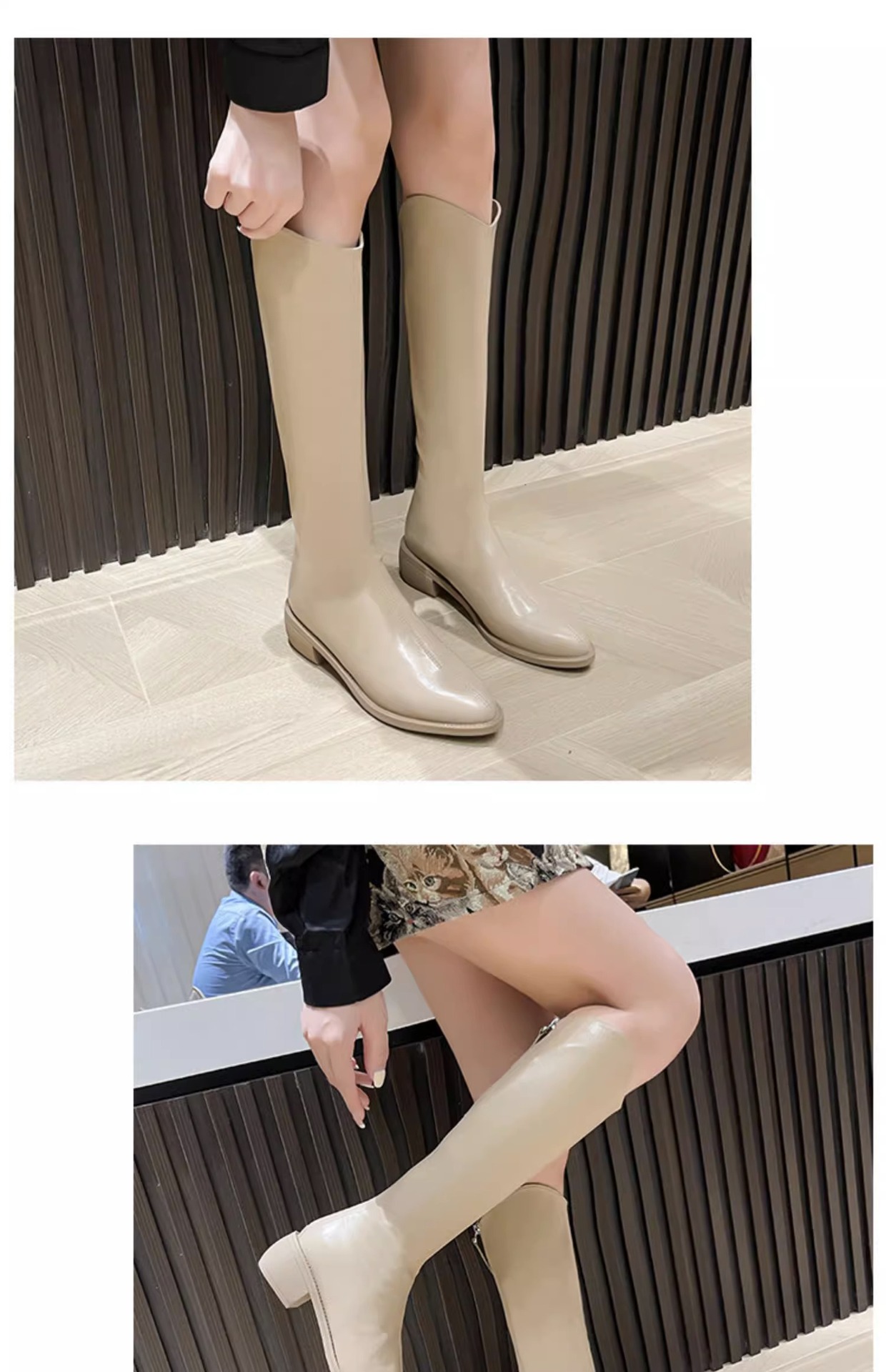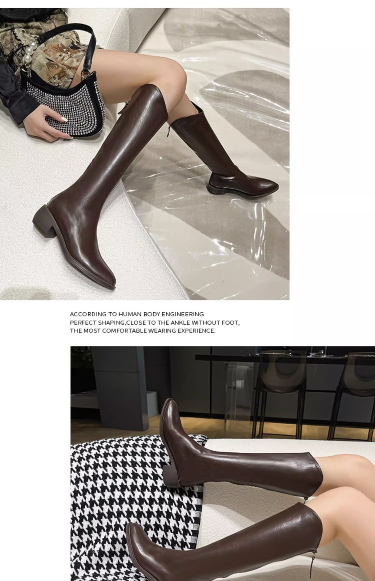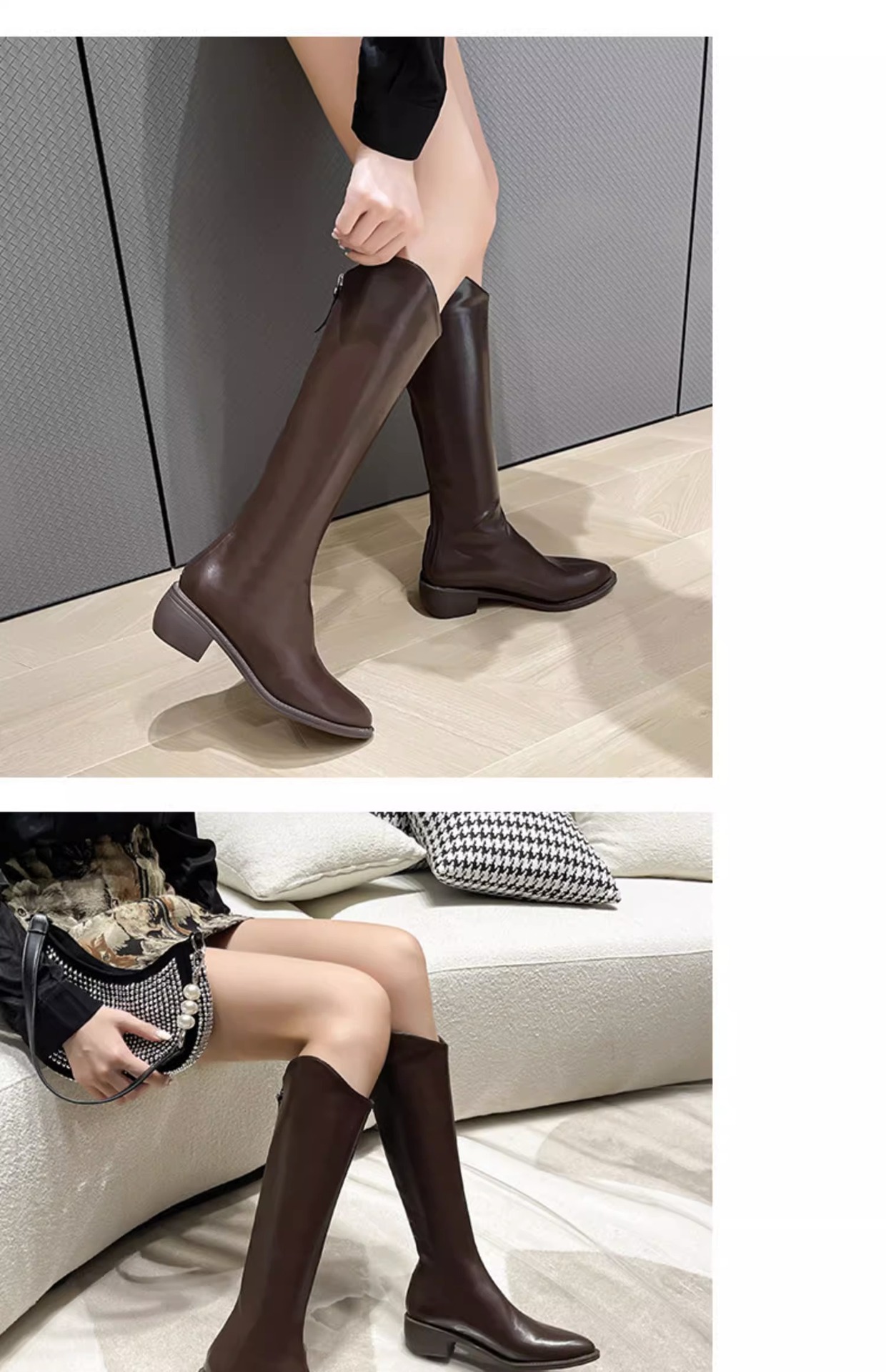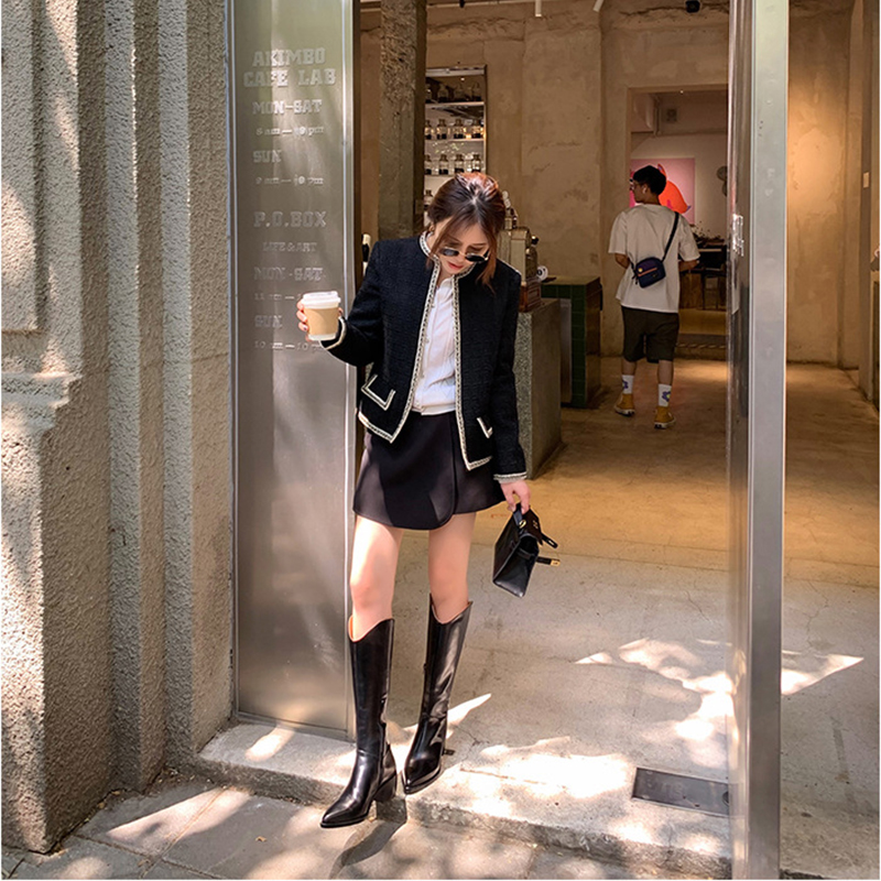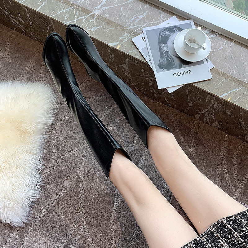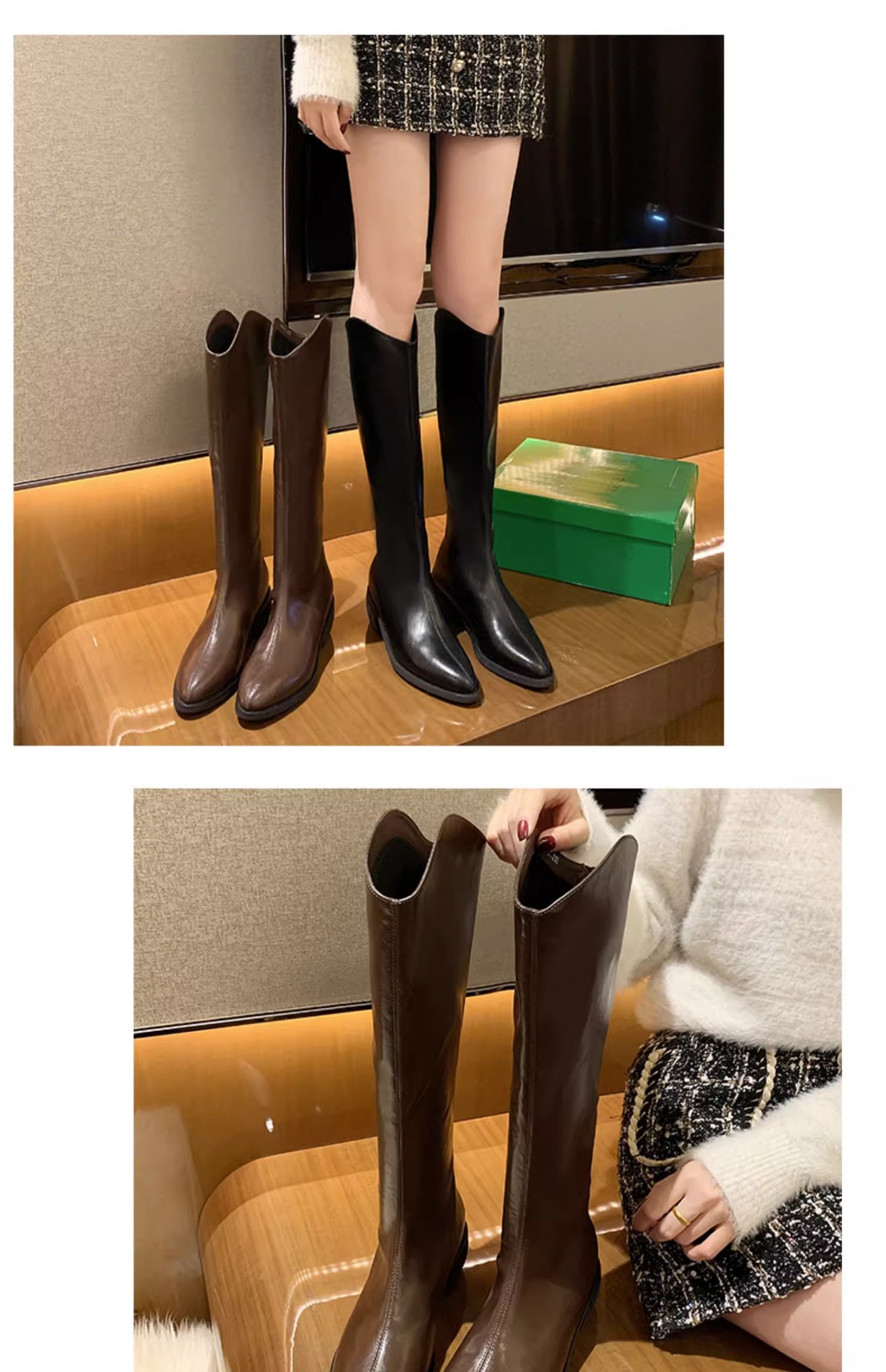 정품 가죽 부츠 V 입 밀크 티 컬러 브라운 봄, 가을 두꺼운 굽 부츠 여성 겨울 새로운 스타일 작은 하이 부츠