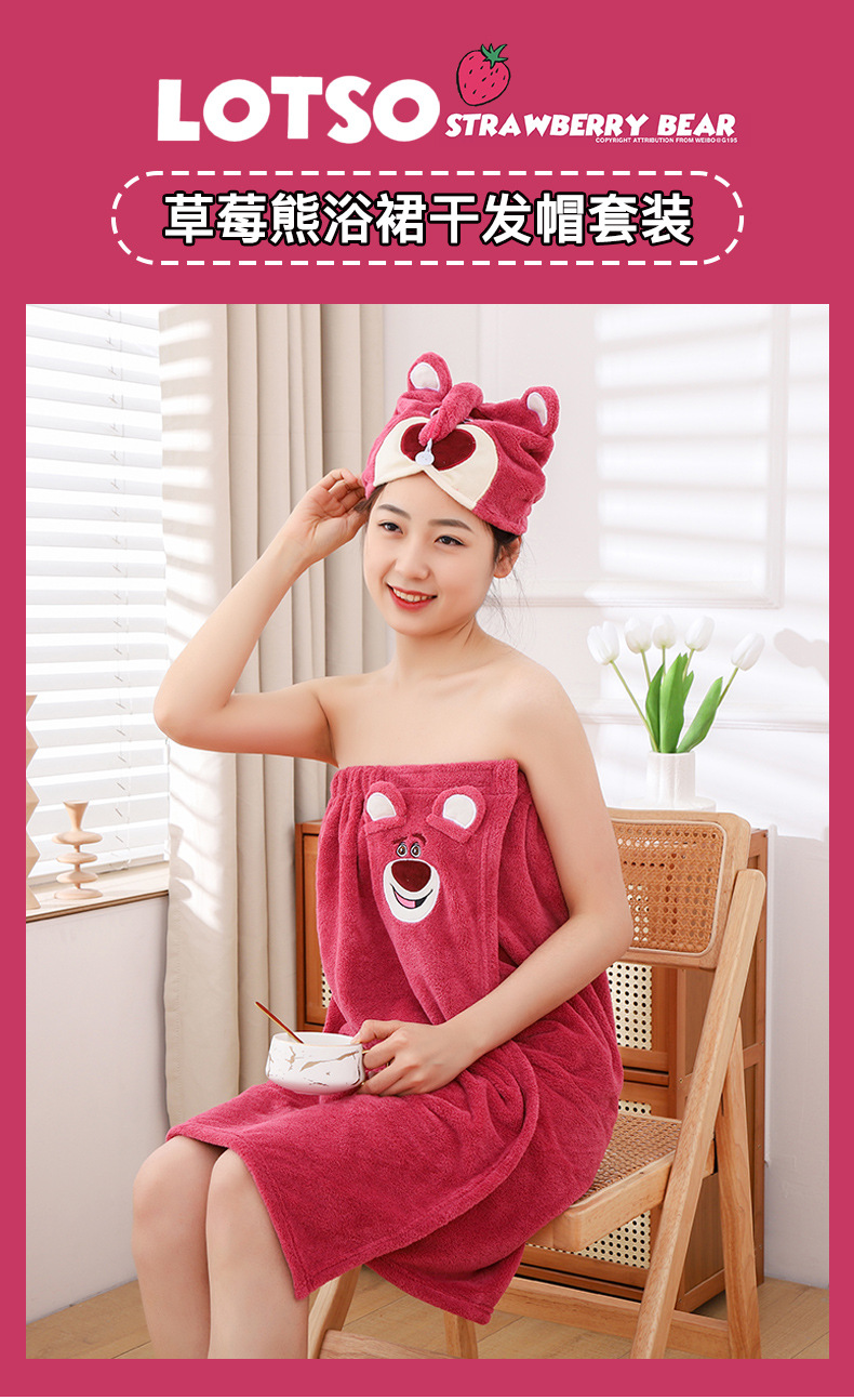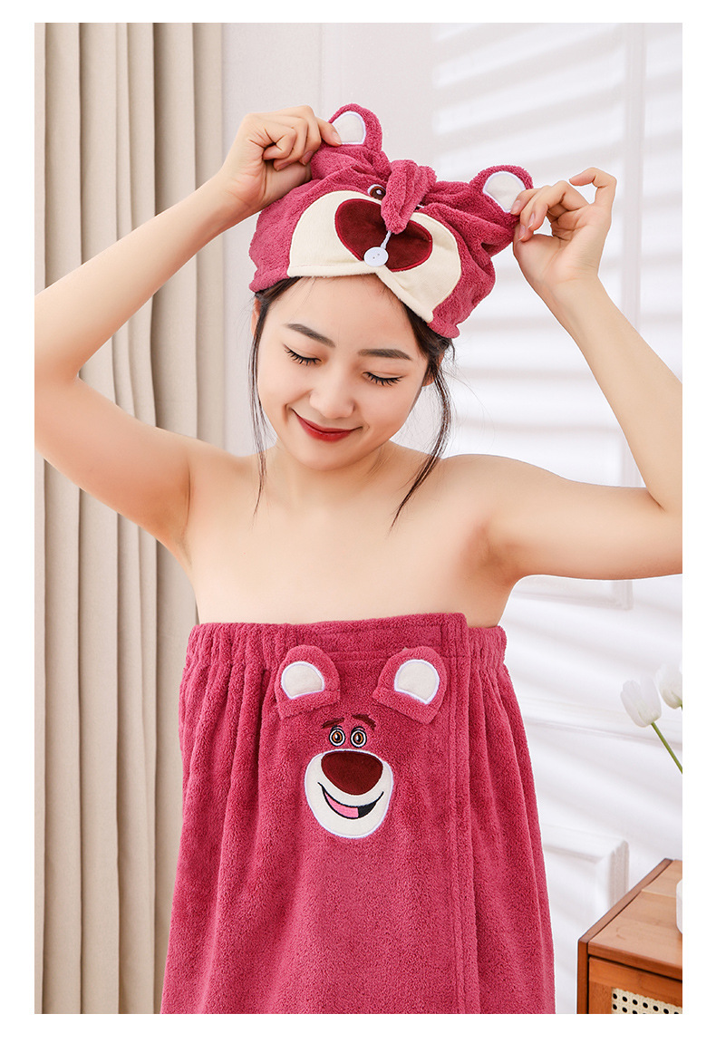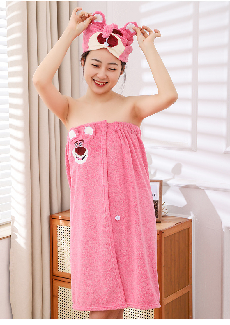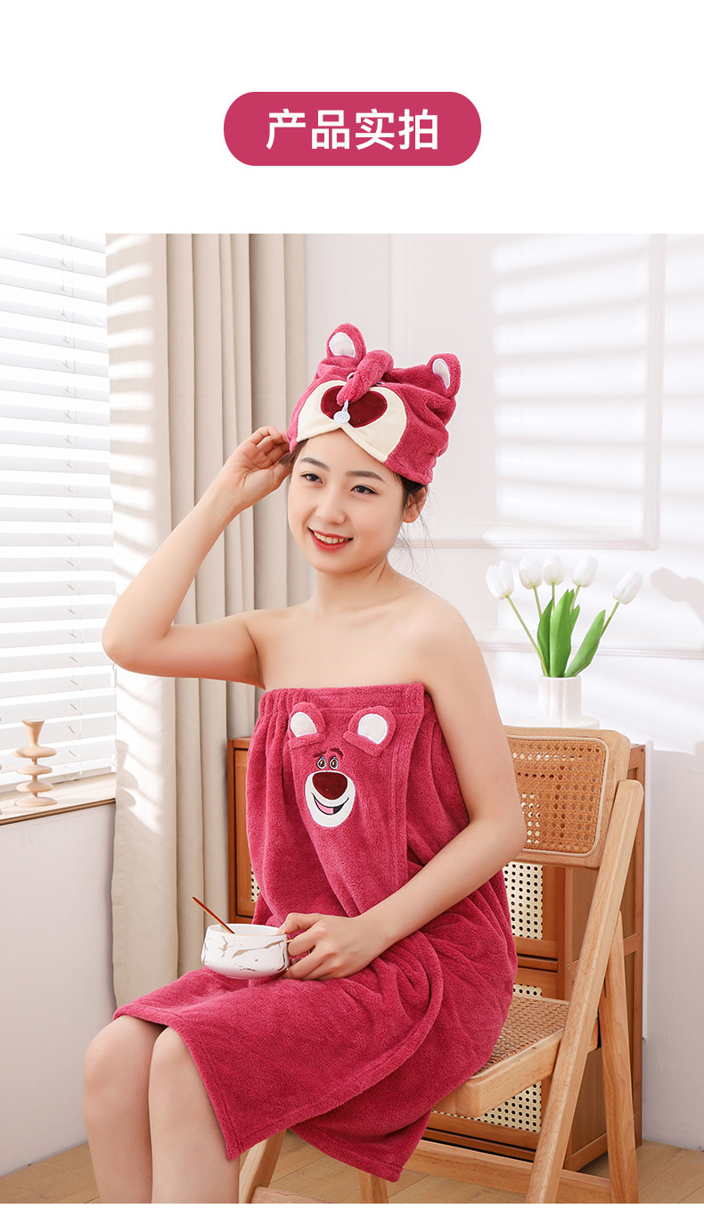 딸기 곰 목욕 원피스 흡수성 두꺼운 머리없는 목욕 타월 대형 여성용 웨어러블 랩 긴 목욕 가운 빠른 헤어 후드