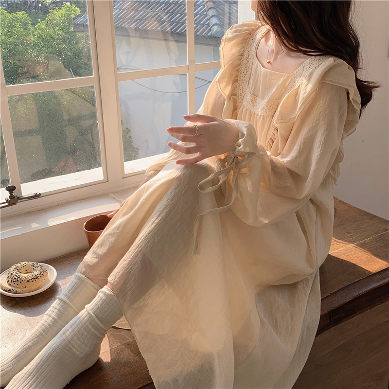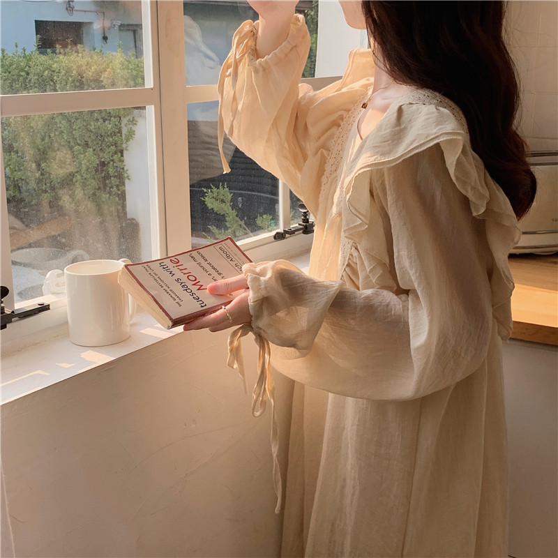 궁전 스타일 긴 소매 잠옷 인터넷 인기 가을과 겨울 잠옷 여자의 봄과 가을 새로운 단색 가정 의류 여자의 겨울