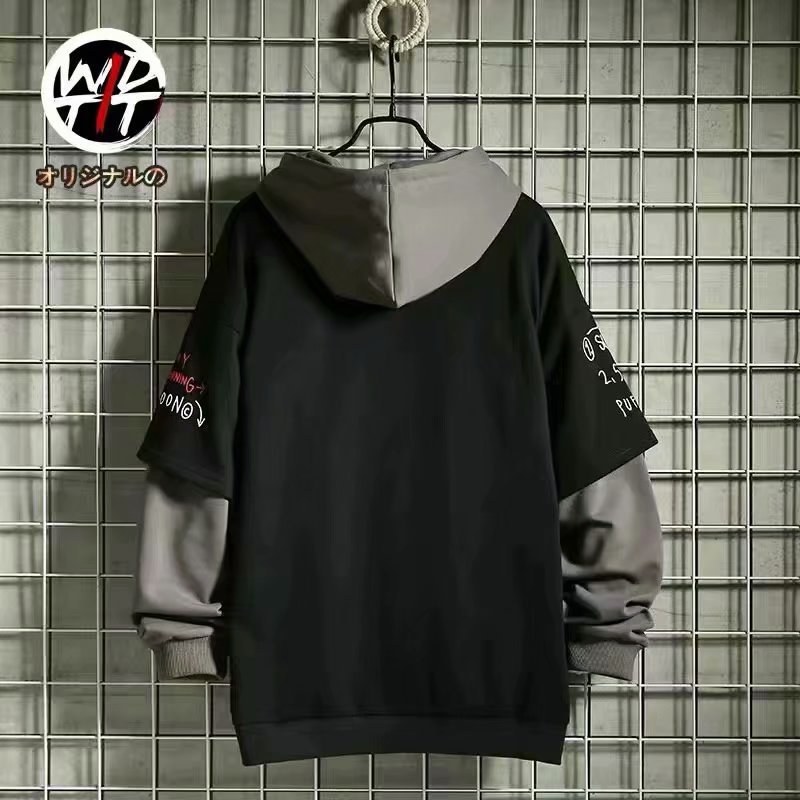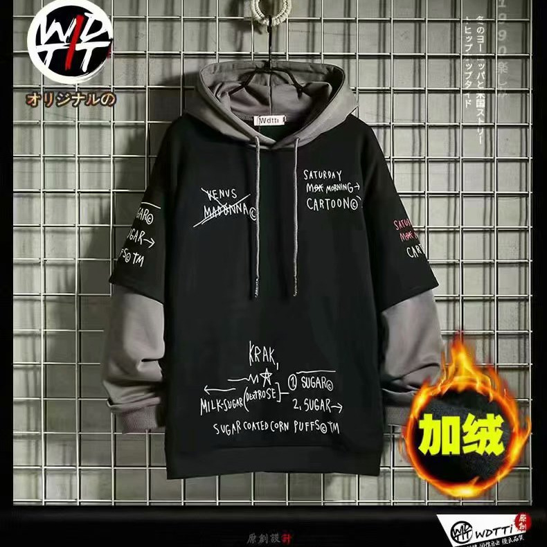 秋冬季日系复古潮牌潮流假两件加绒卫衣男ins拼色韩版宽松连帽衫