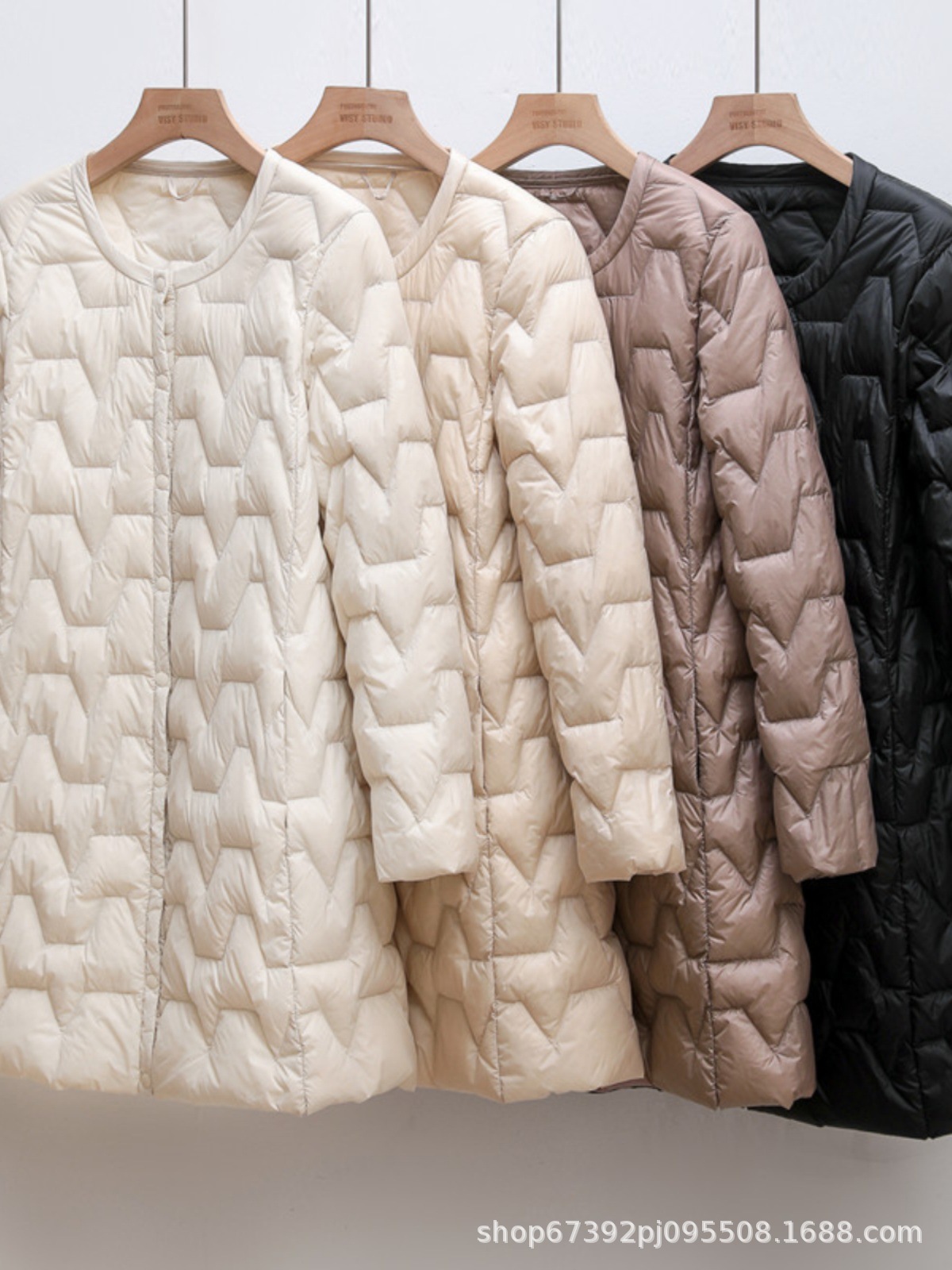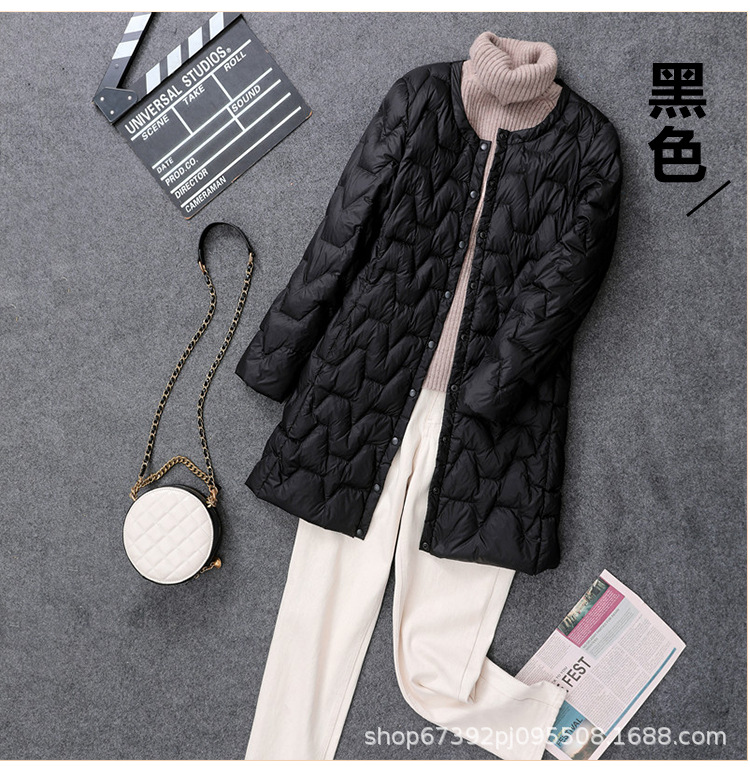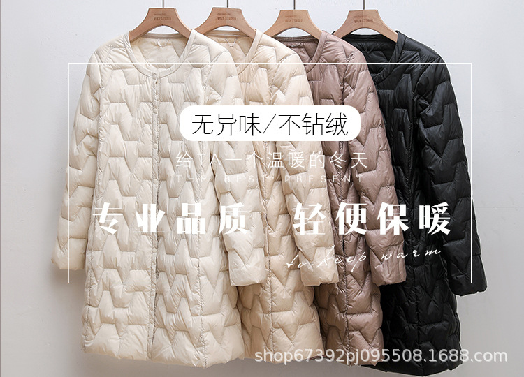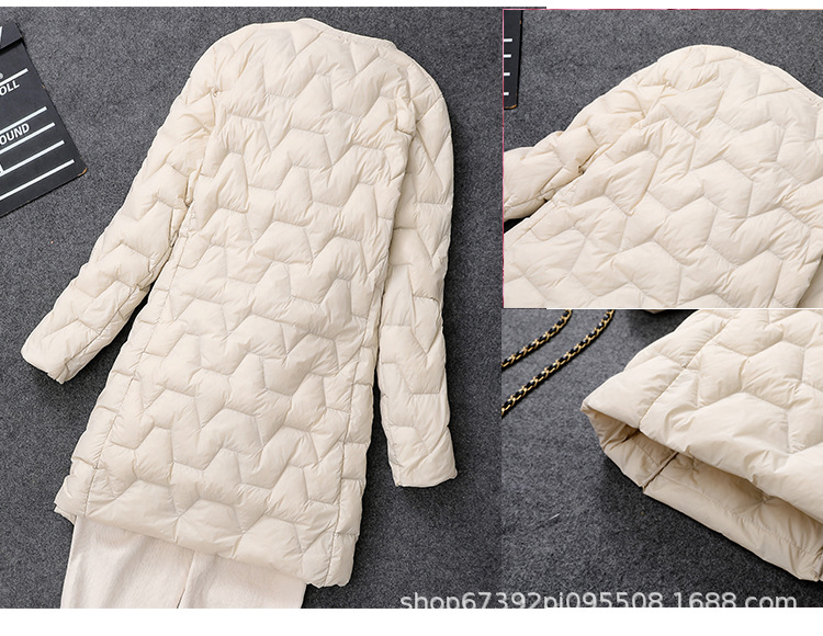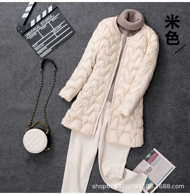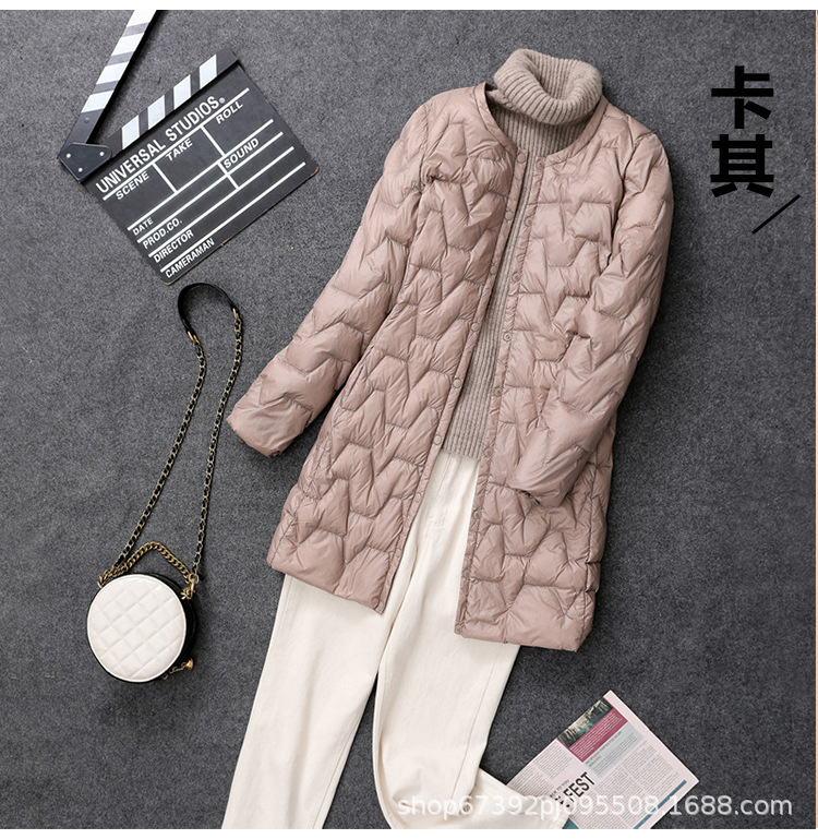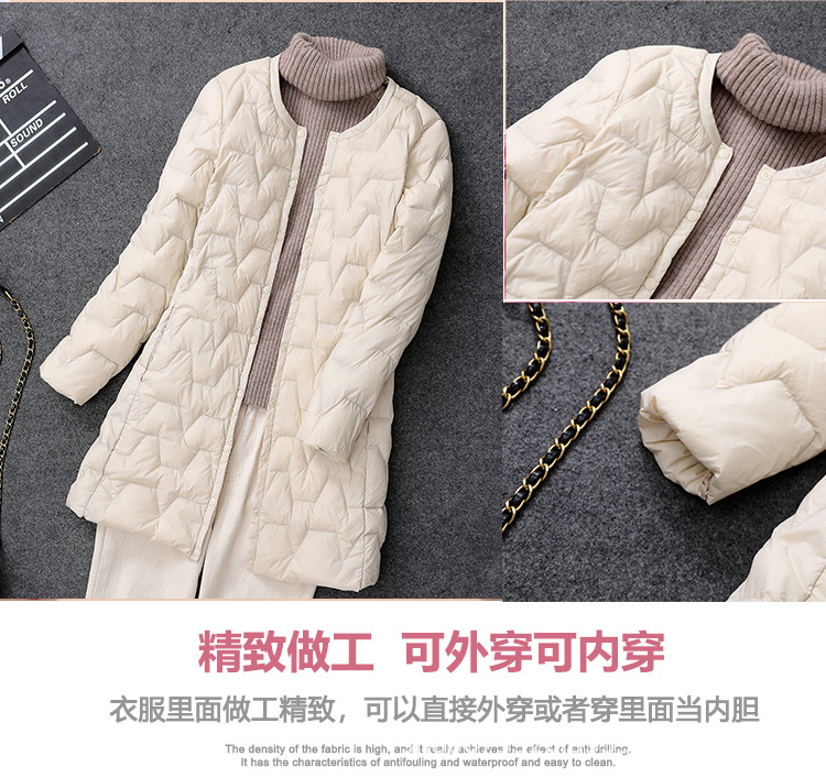 가을 겨울 여성용 칼라 없는 중간 길이 다운 재킷, 내부에 코트를 입는 형태로 가볍고 라운드넥 이너 레이어, 크로스보더 슬림핏