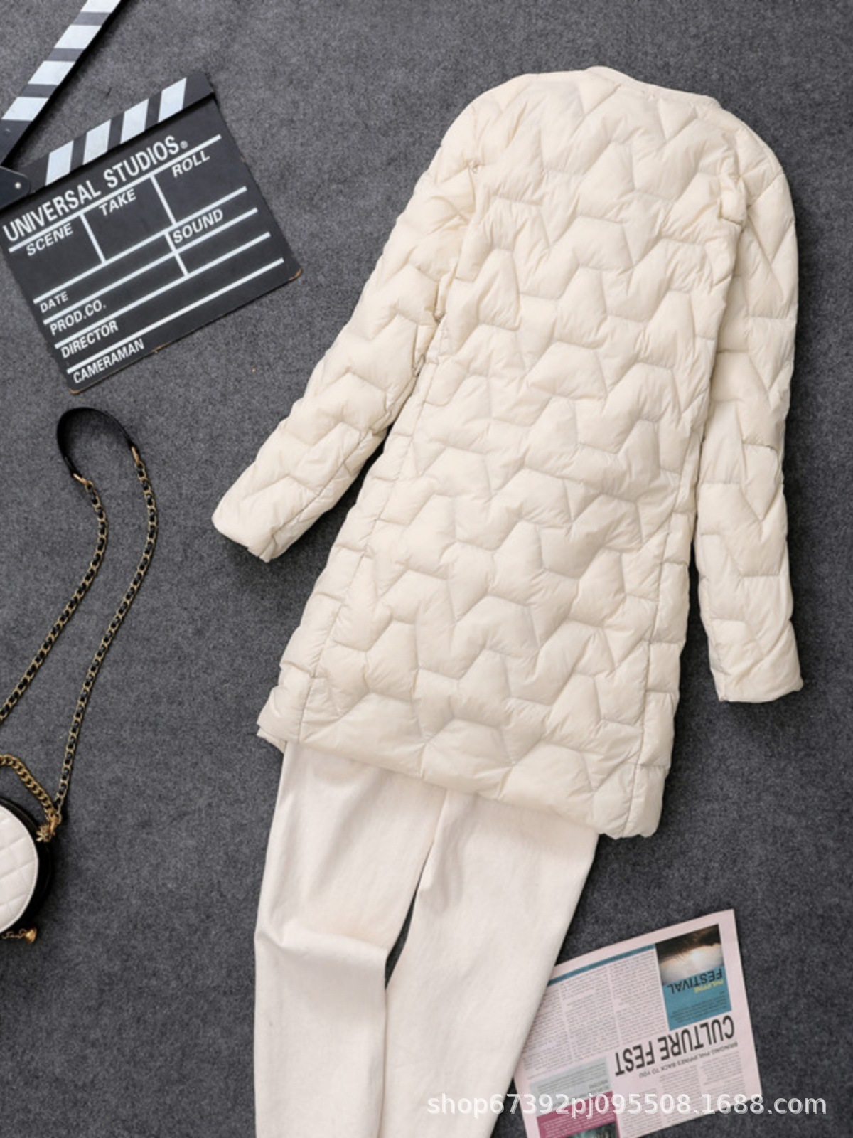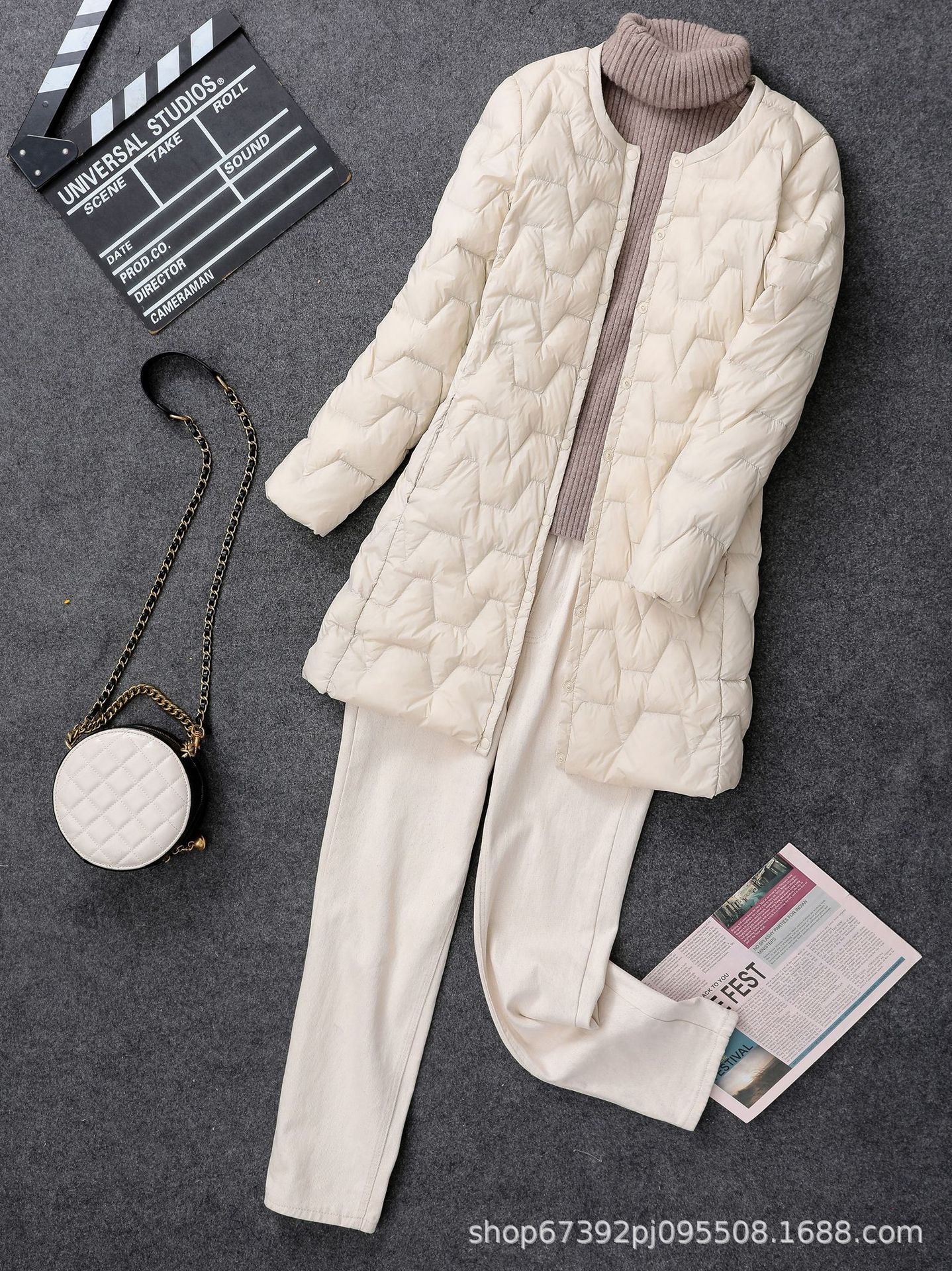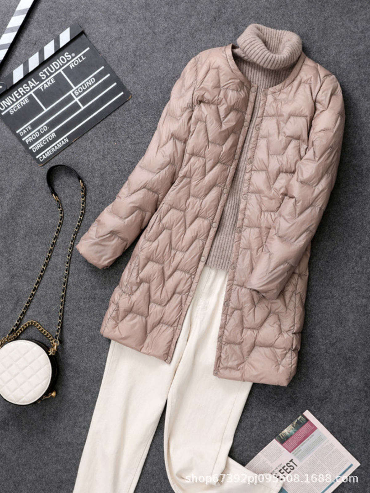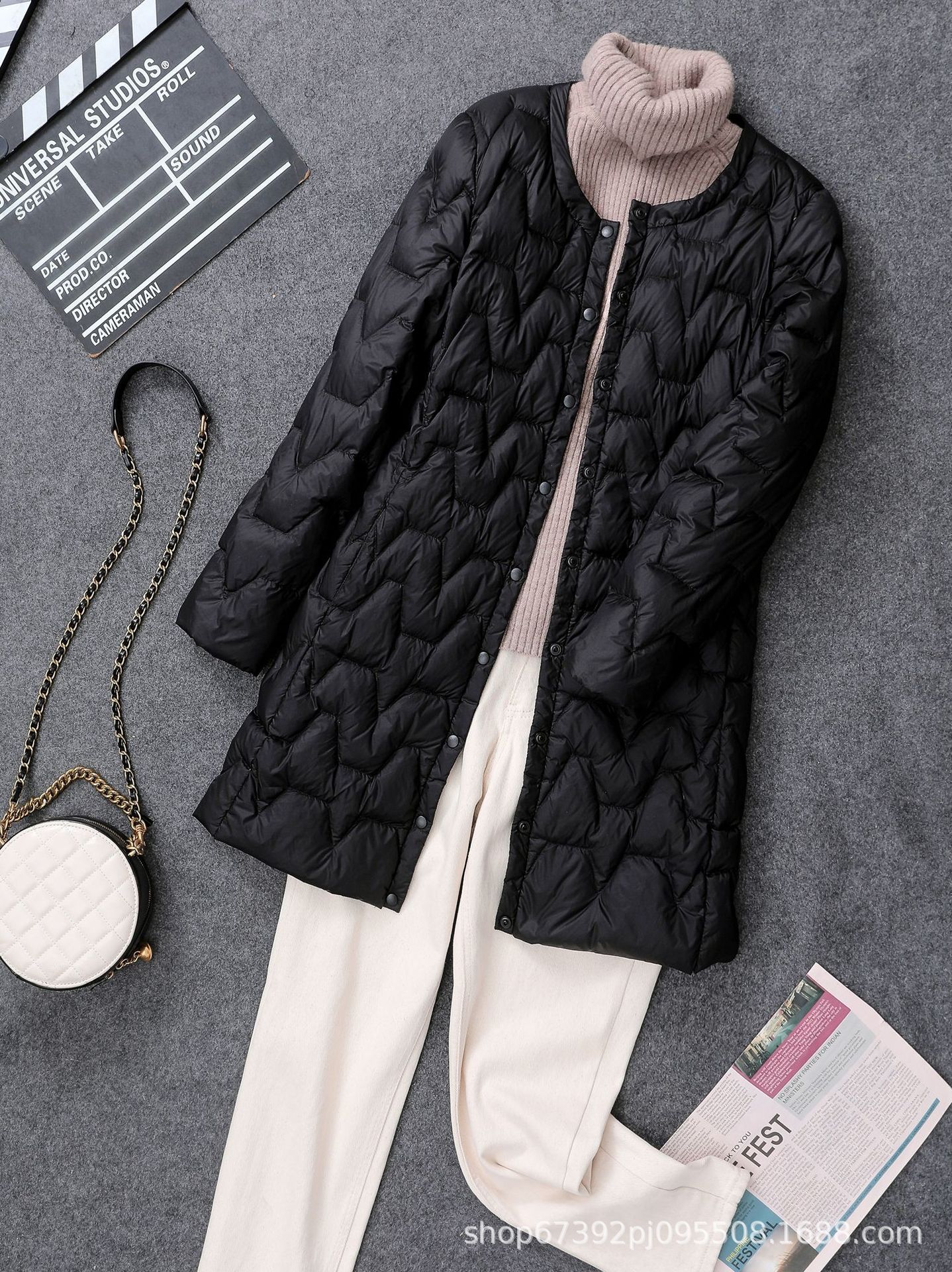 가을 겨울 여성용 칼라 없는 중간 길이 다운 재킷, 내부에 코트를 입는 형태로 가볍고 라운드넥 이너 레이어, 크로스보더 슬림핏