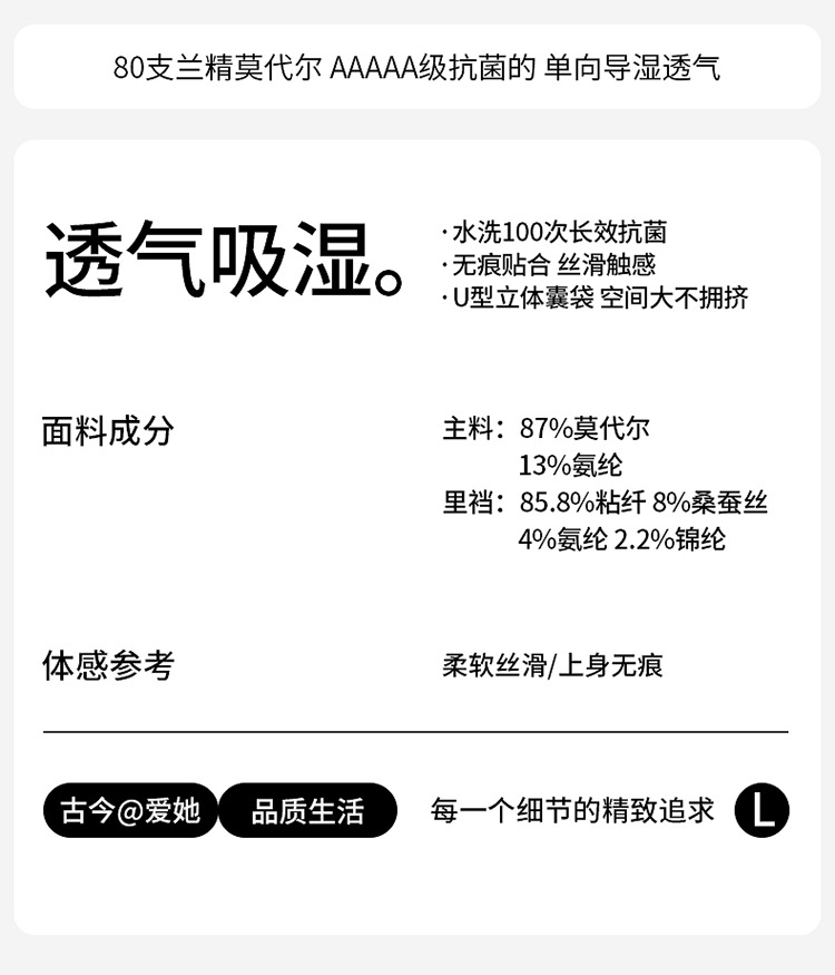 직물: 87% 모달 13% 스판덱스; 라이닝: 85.8 viscose 8% 뽕나무 실크 4% 스판덱스 2.2 나일론