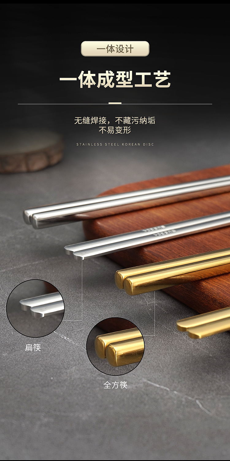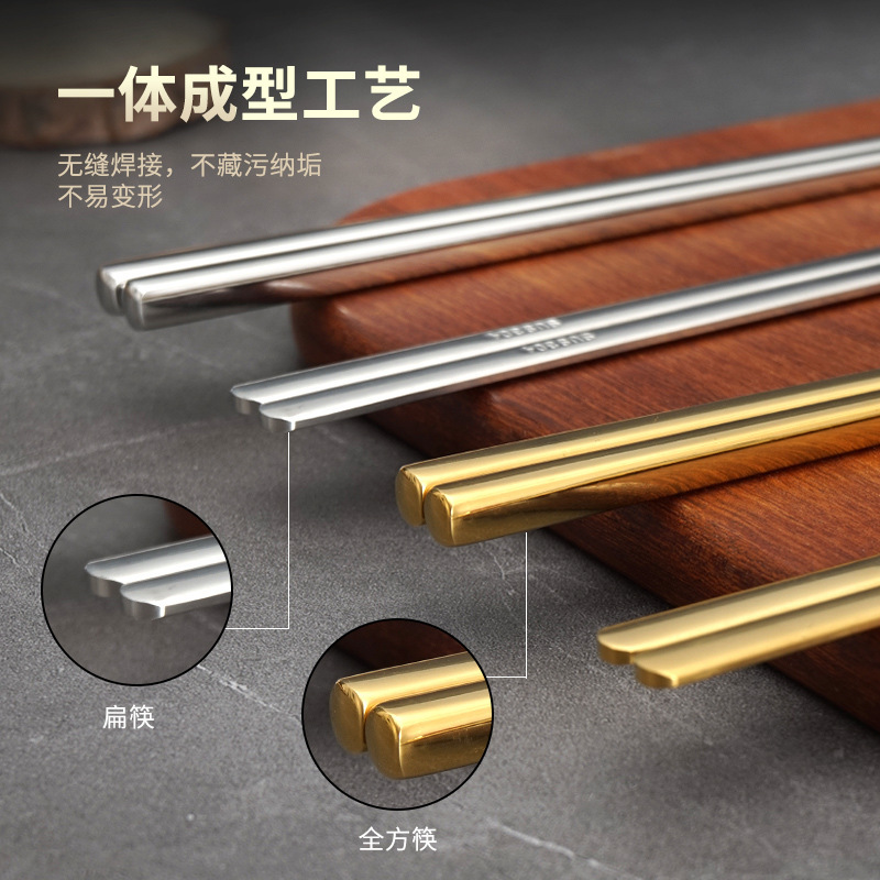 한국식 304 스테인레스 스틸 젓가락 미끄럼 방지 식품 등급 골든 솔리드 플랫 젓가락 스푼 바베큐 식기 상업