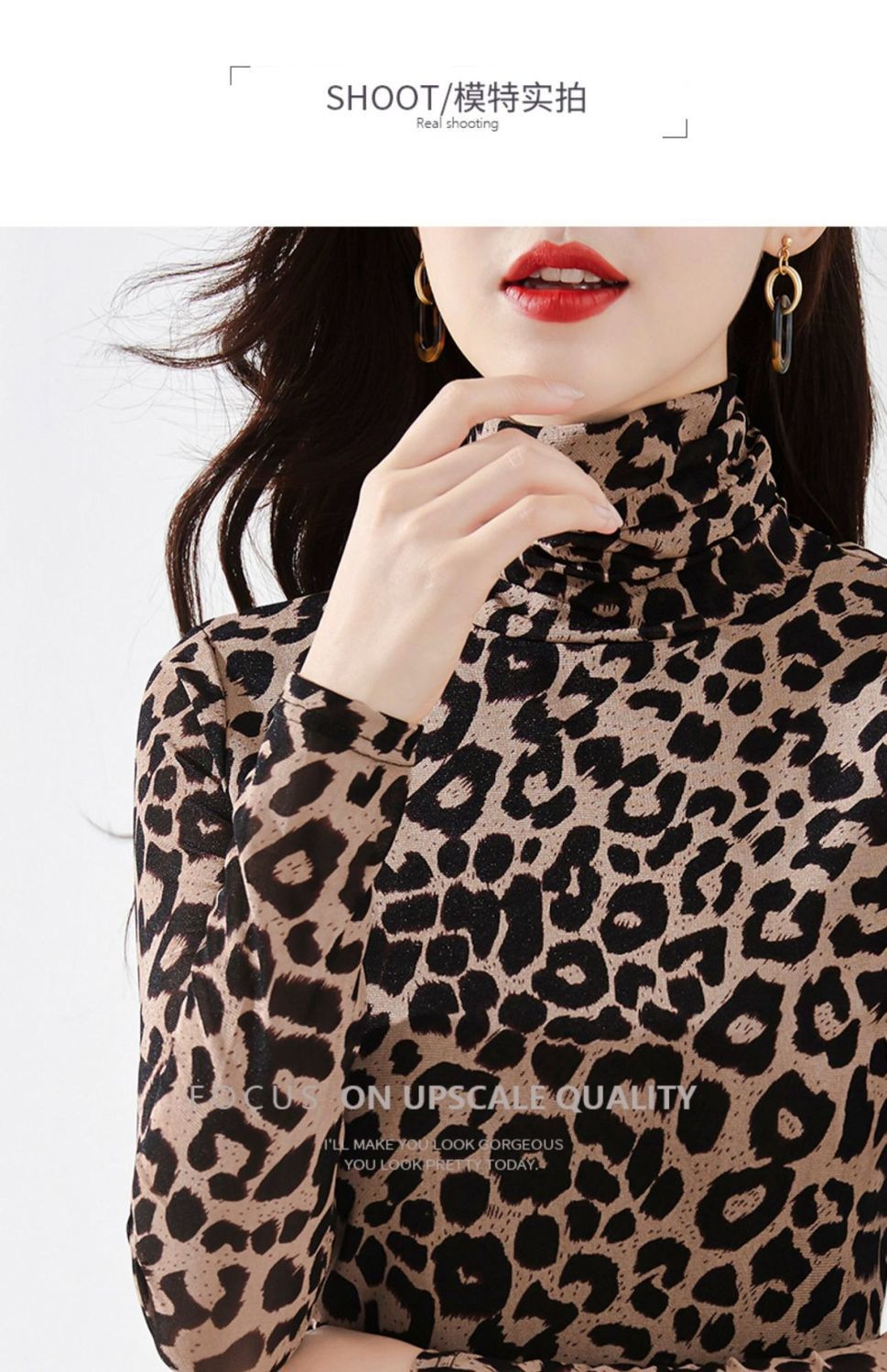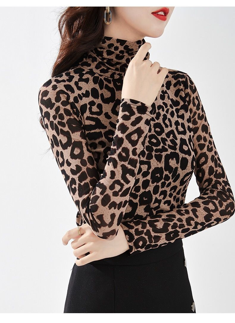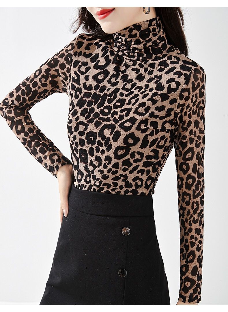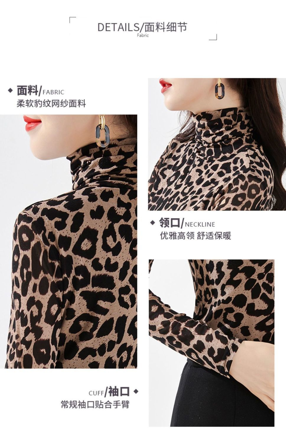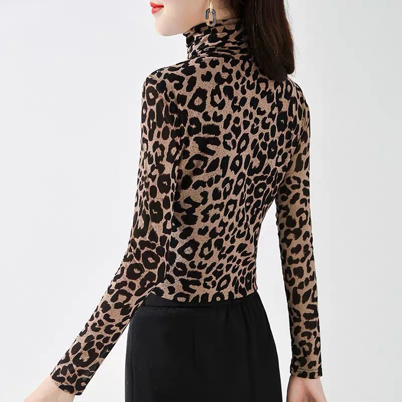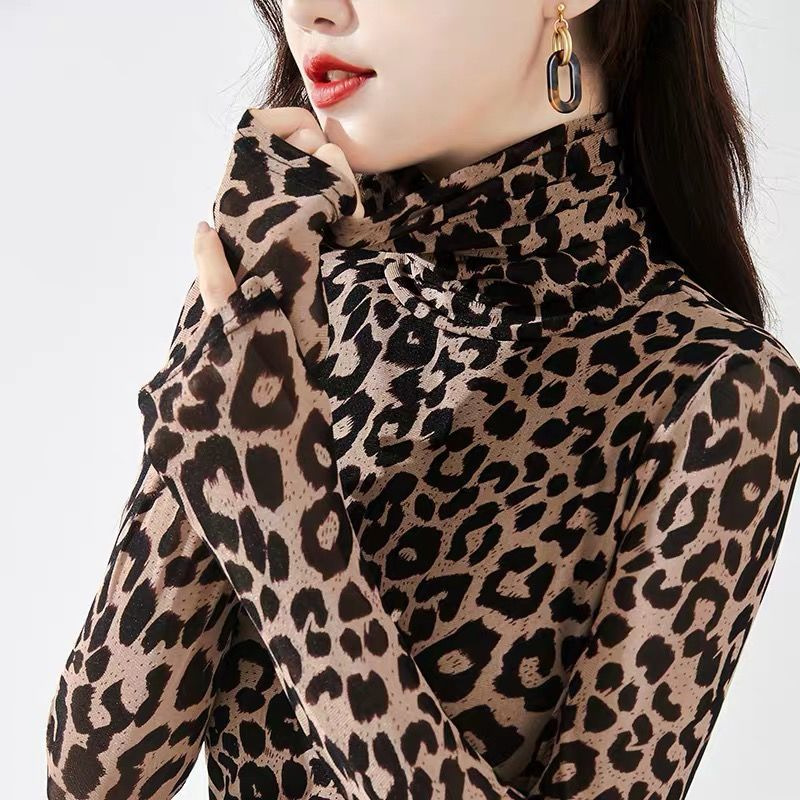 하이 칼라 레오파드 무늬 메쉬 얇은 베이스 셔츠 여성의 2023 가을과 겨울 새로운 티셔츠 스타일 내부 탑 트렌디