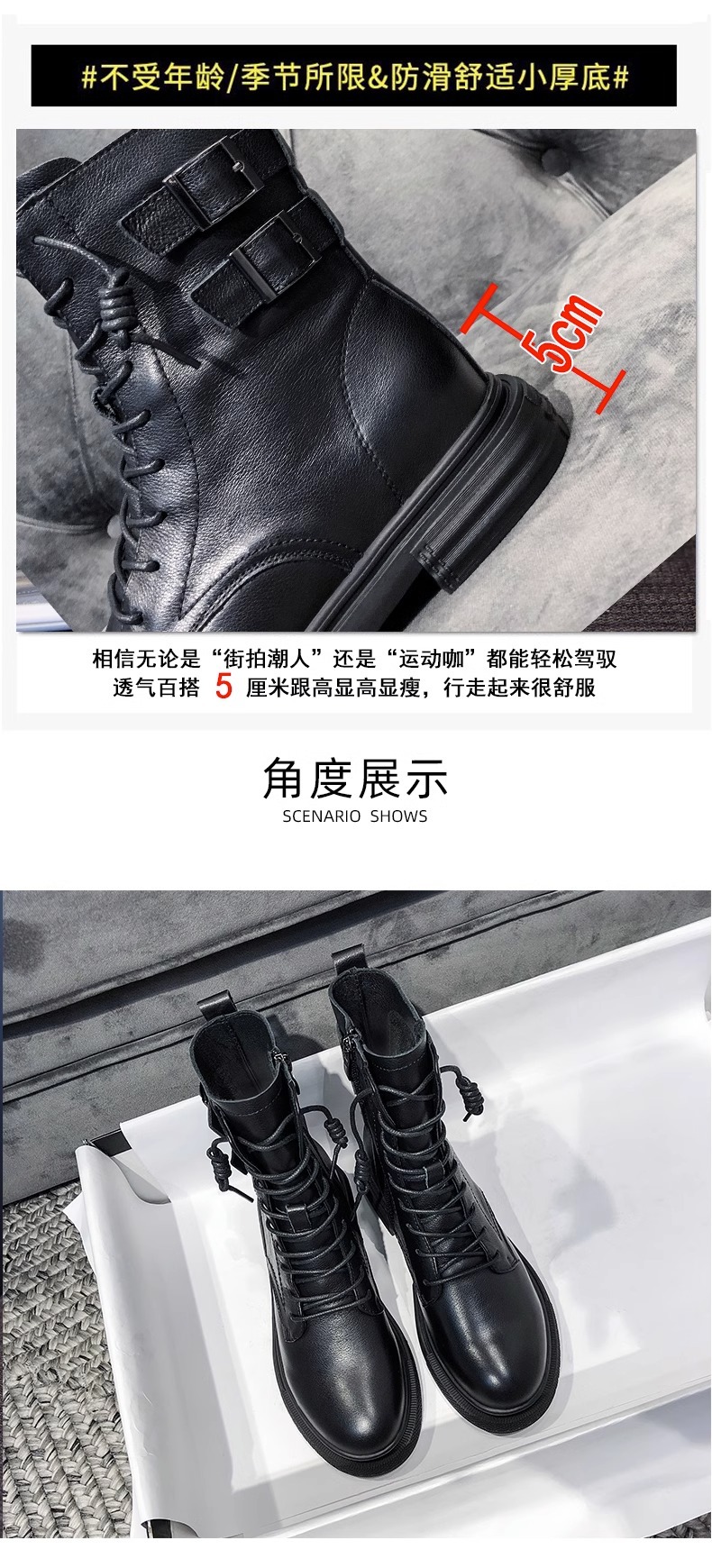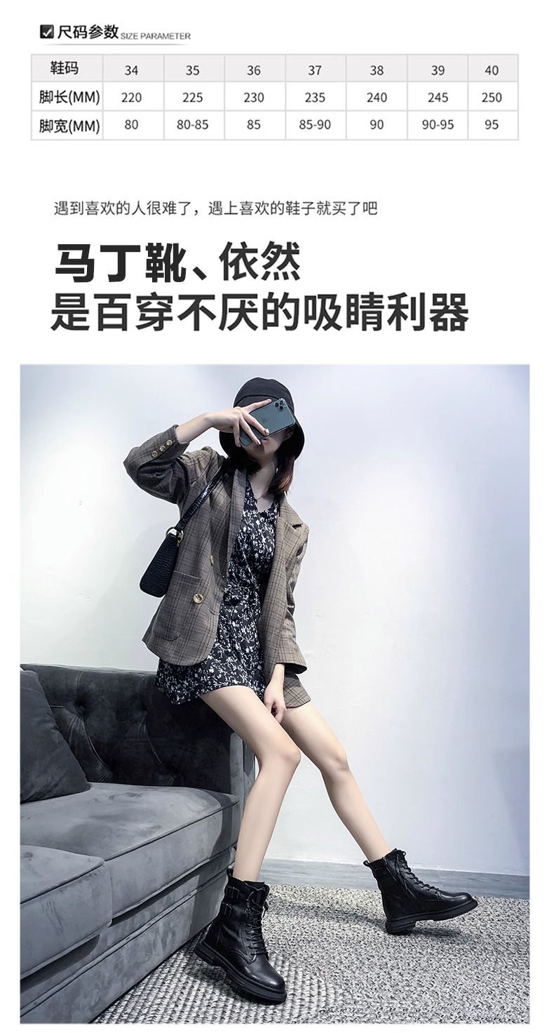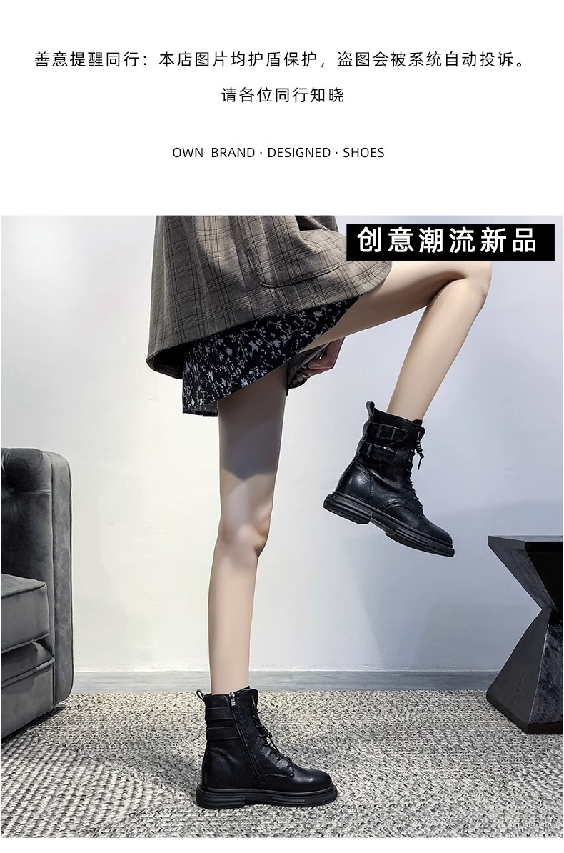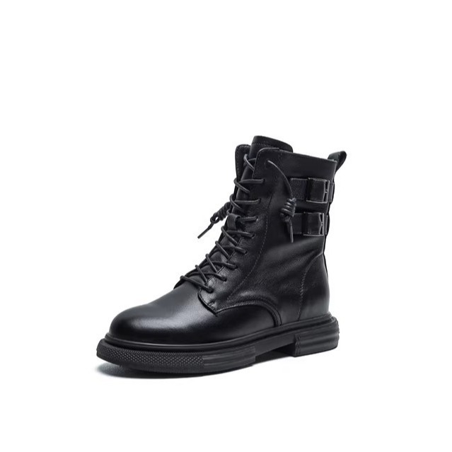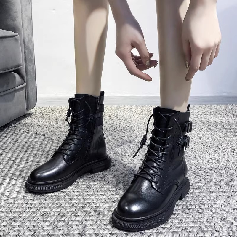여성용 천연 가죽 플랫 마틴 부츠 2025년 가을 신상 다용도 부드러운 밑창 블랙 숏부츠 중간 길이 더블 버튼 부츠