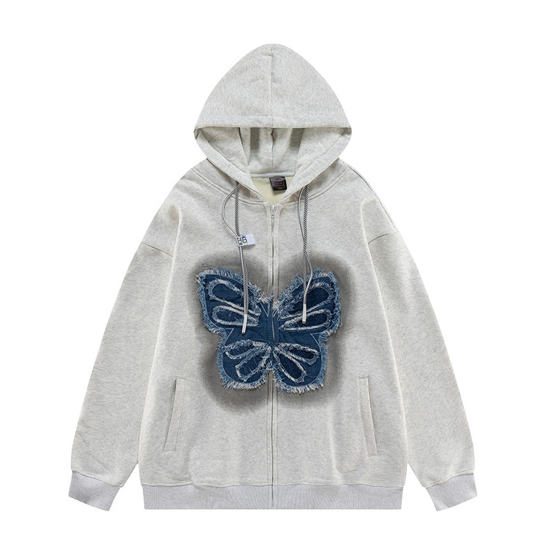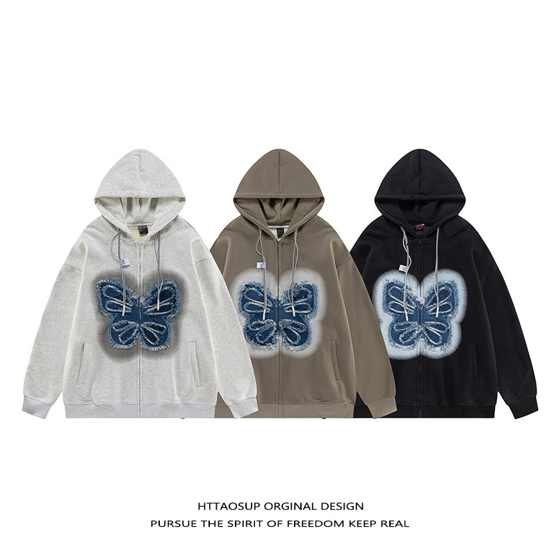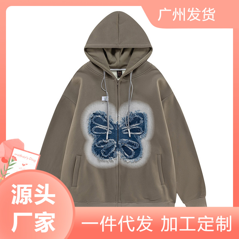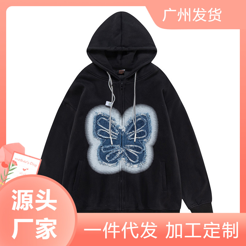 포장 마차의 13 줄 재고 도매 복고풍 나비 패치 후드 스웨터 소년과 소녀 기모 특대 코트