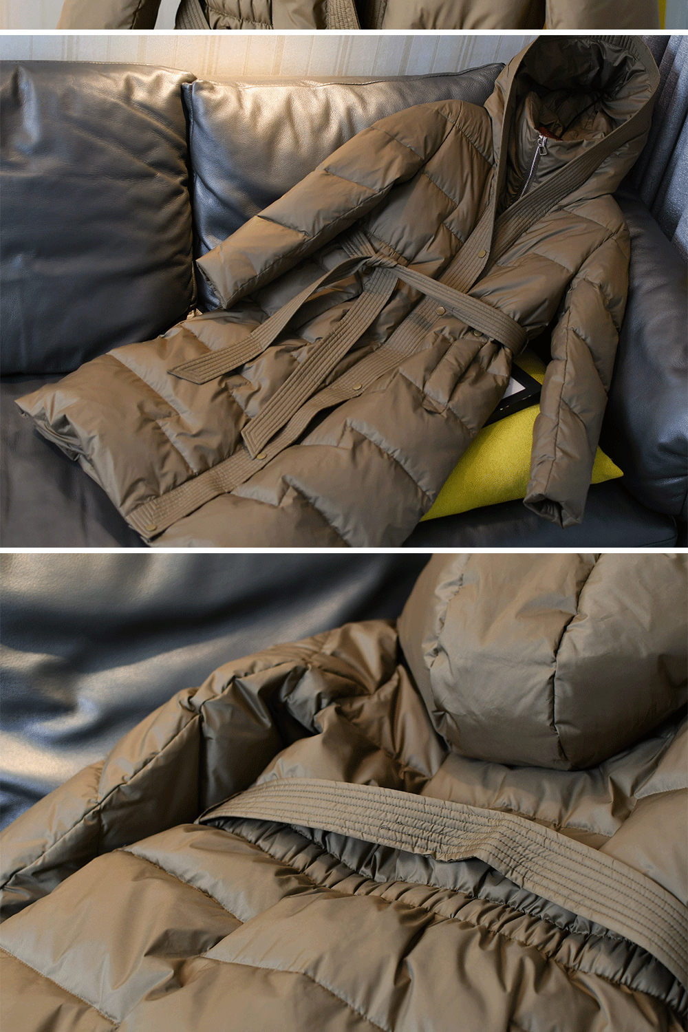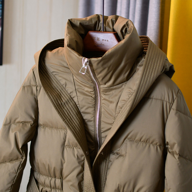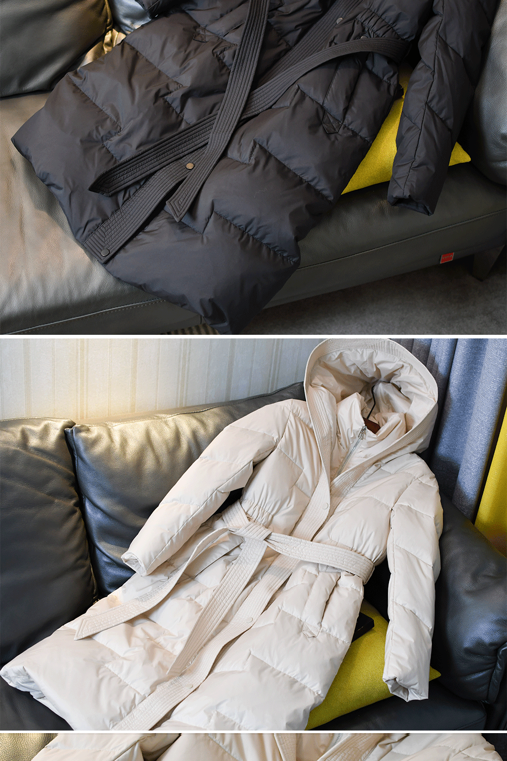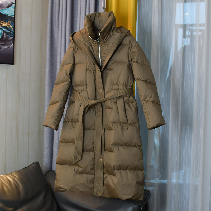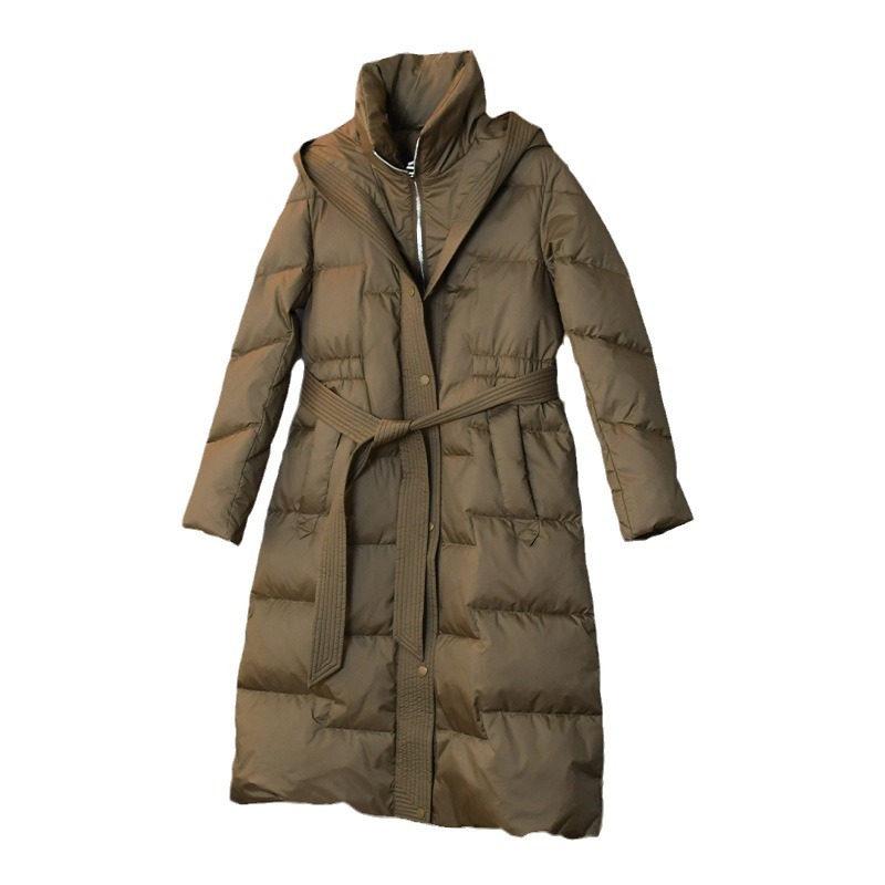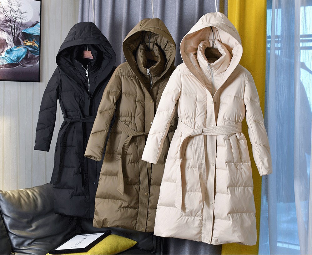 2024년 신상 후드 다운 재킷 여성용 우아한 슬림핏 중간 길이 무릎 아래까지 오는 허리 조임 두꺼운 흰색 오리털 코트 트렌디