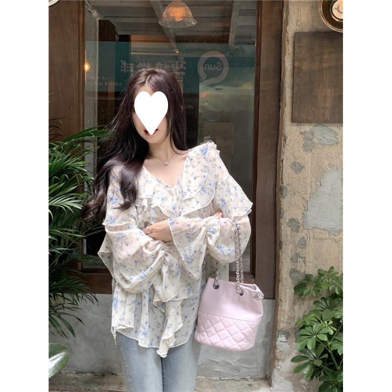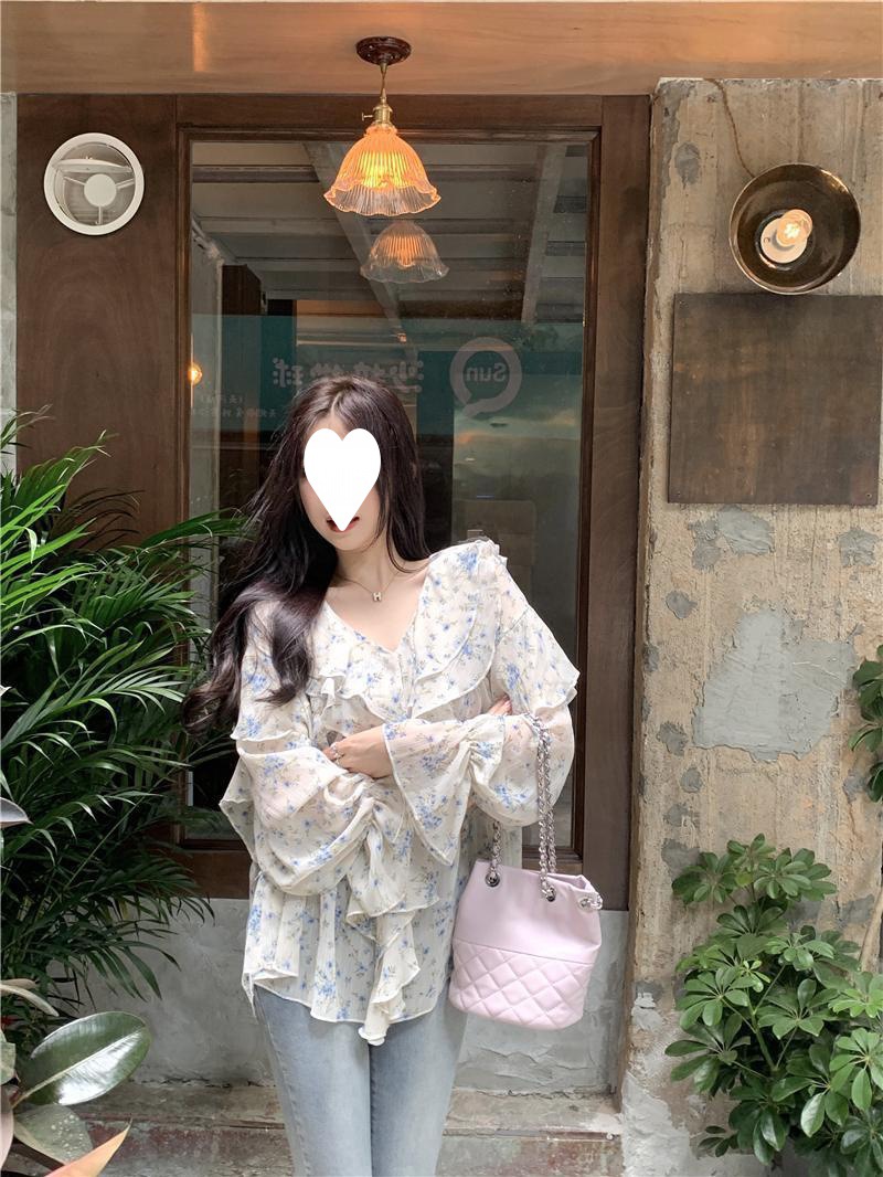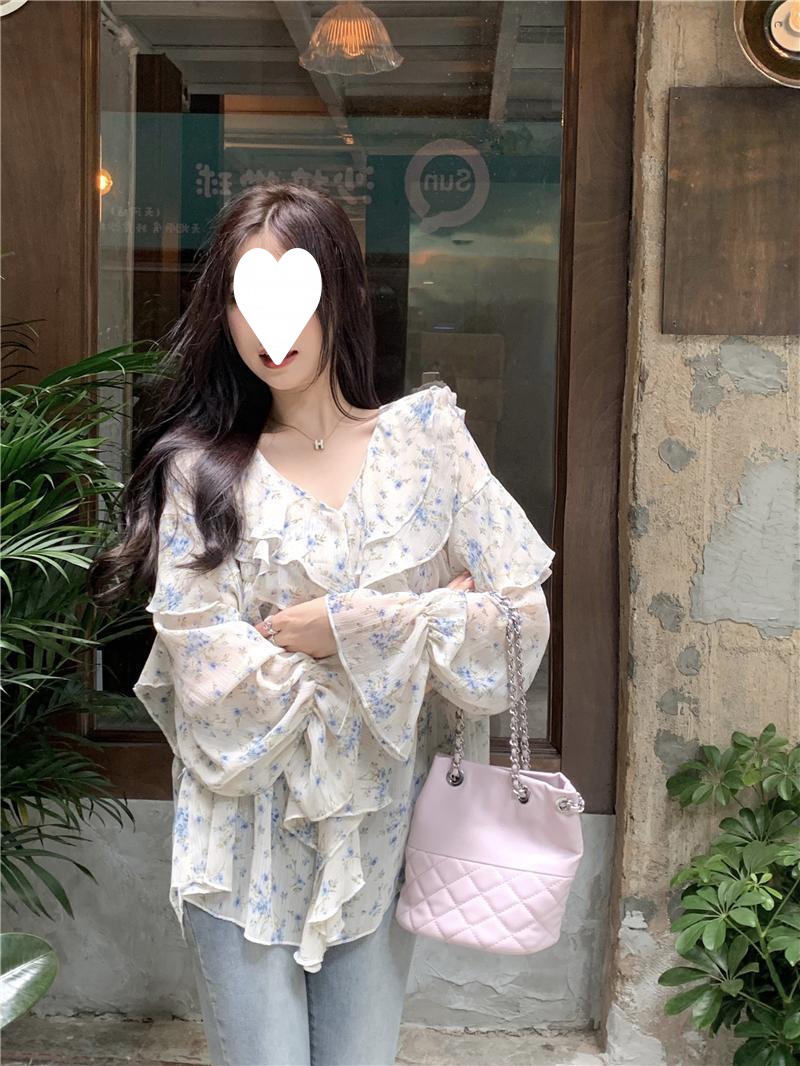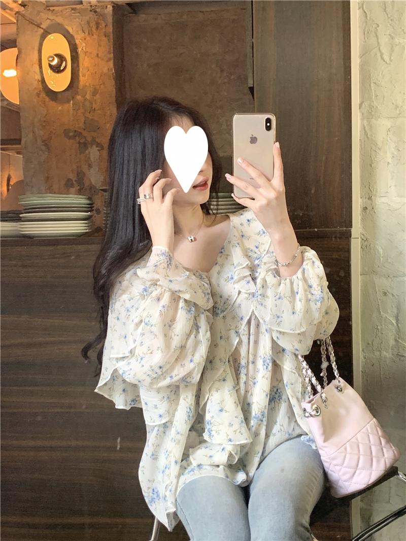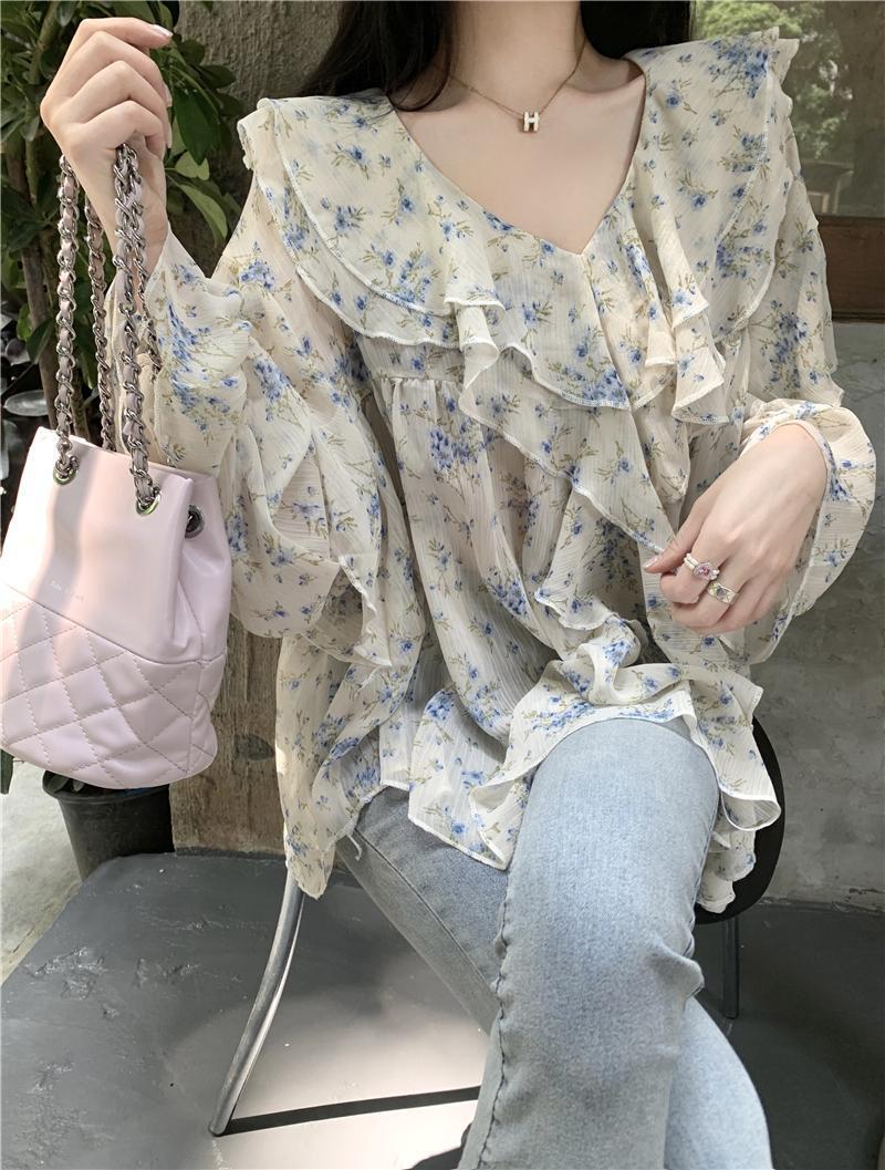통통녀 1.00 kg-150.00 kg 특대 사이즈 디자인 센스 더블 칼라 V-넥 꽃무늬 쉬폰 자외선 차단제 셔츠 여성의 여름 프랑스 스타일 탑
