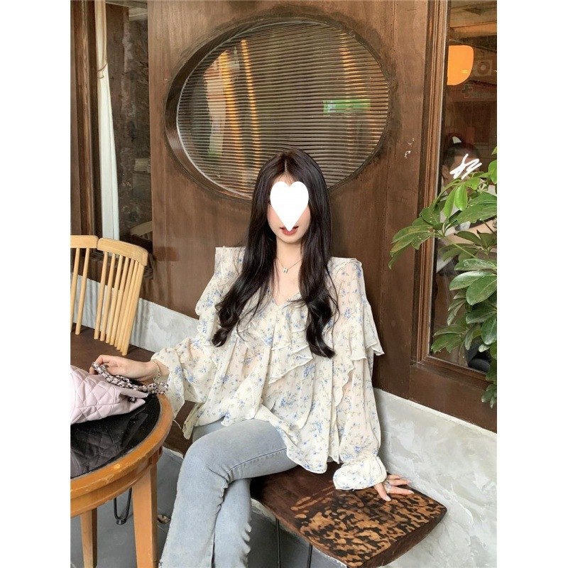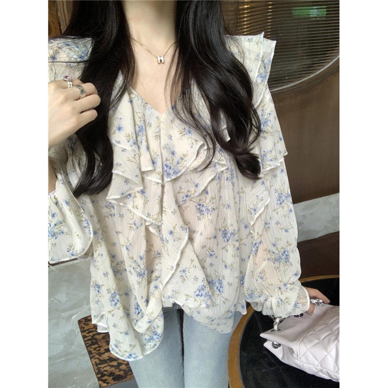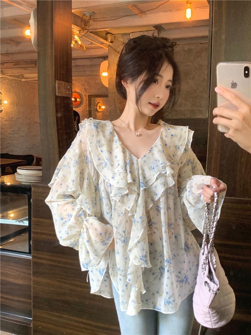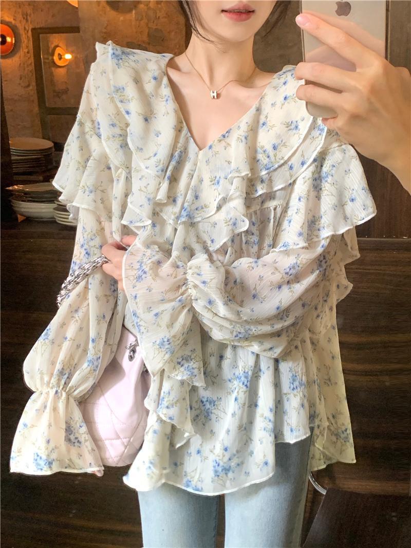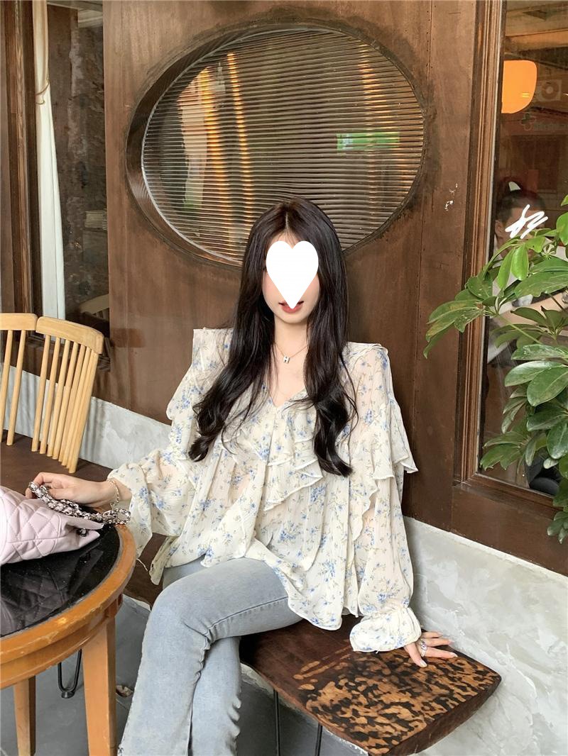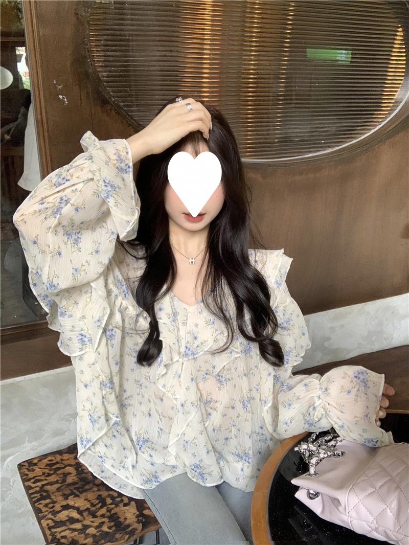 통통녀 1.00 kg-150.00 kg 특대 사이즈 디자인 센스 더블 칼라 V-넥 꽃무늬 쉬폰 자외선 차단제 셔츠 여성의 여름 프랑스 스타일 탑