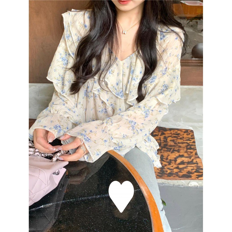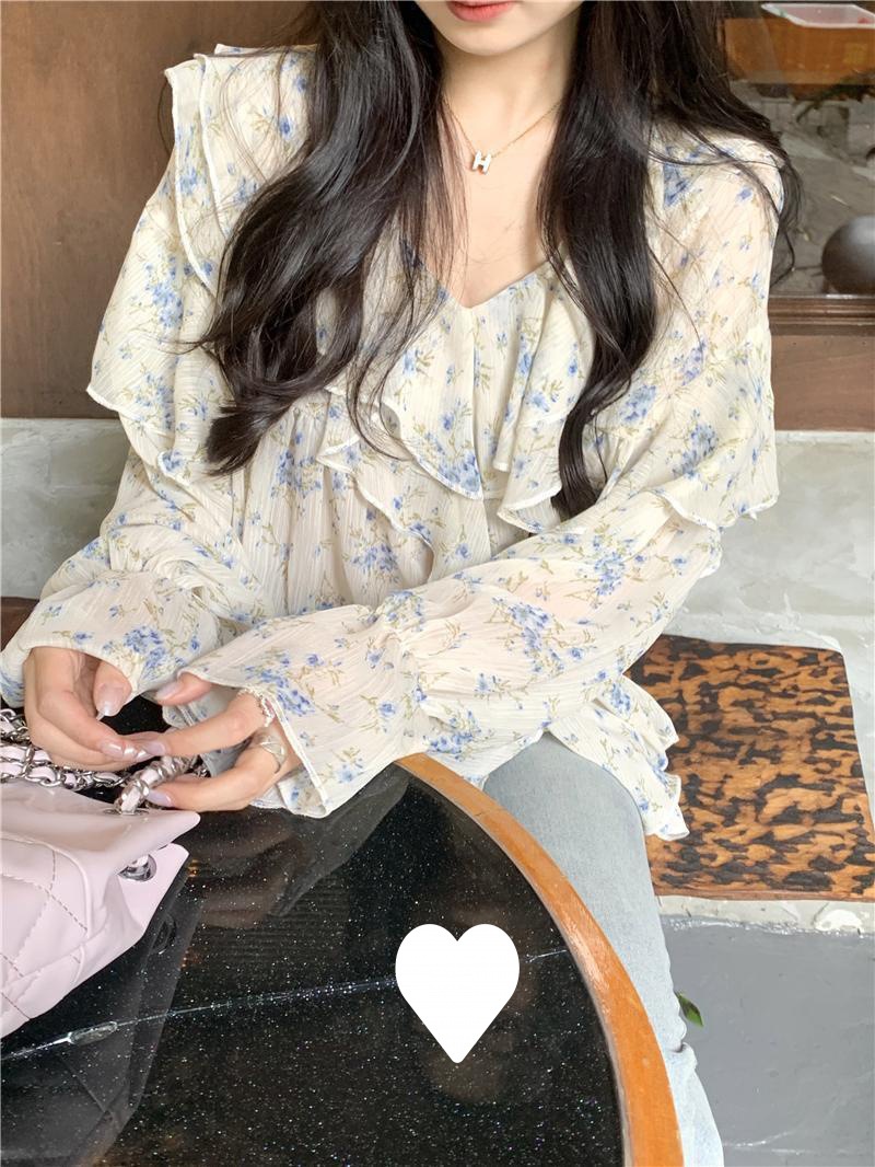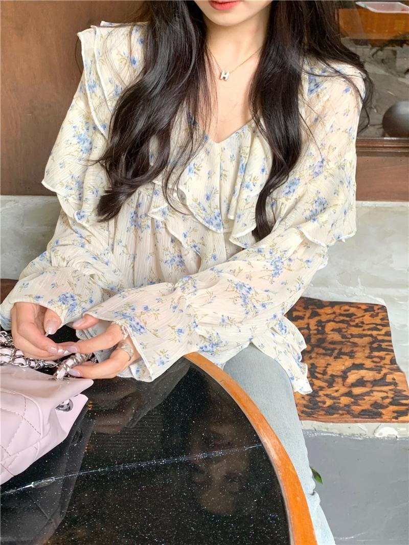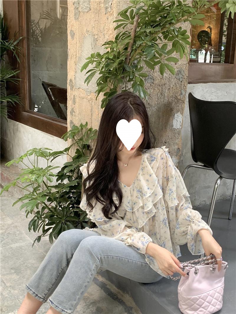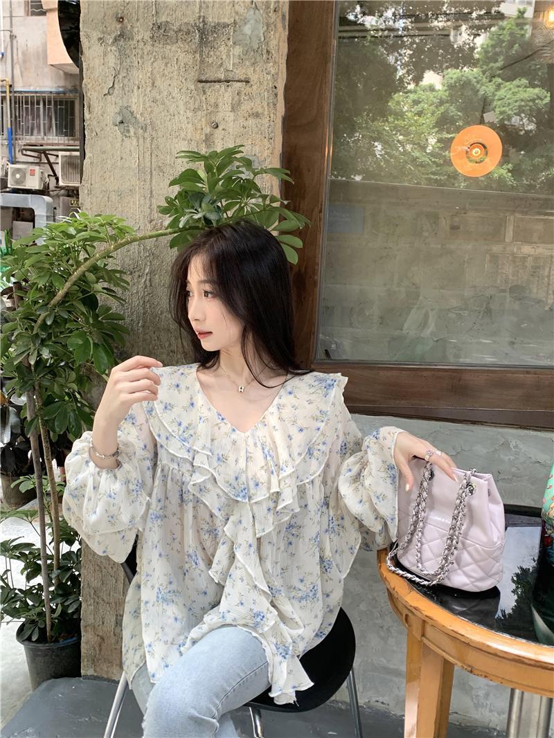 통통녀 1.00 kg-150.00 kg 특대 사이즈 디자인 센스 더블 칼라 V-넥 꽃무늬 쉬폰 자외선 차단제 셔츠 여성의 여름 프랑스 스타일 탑