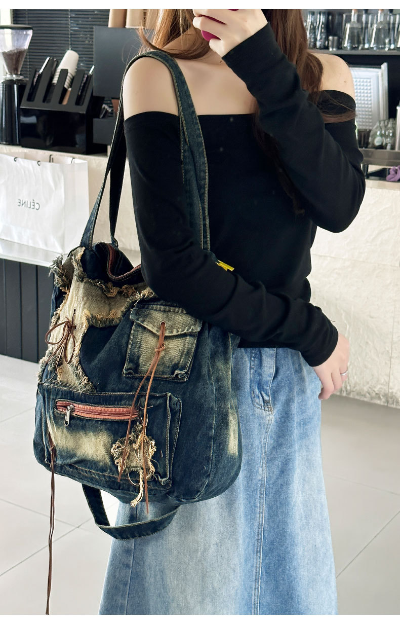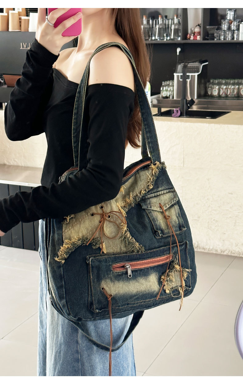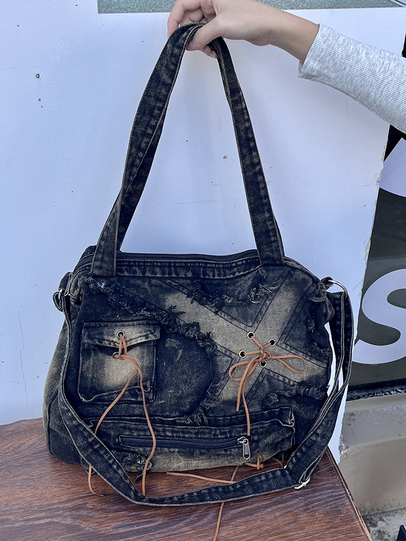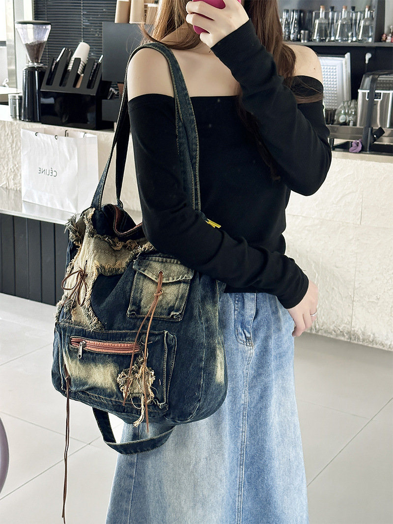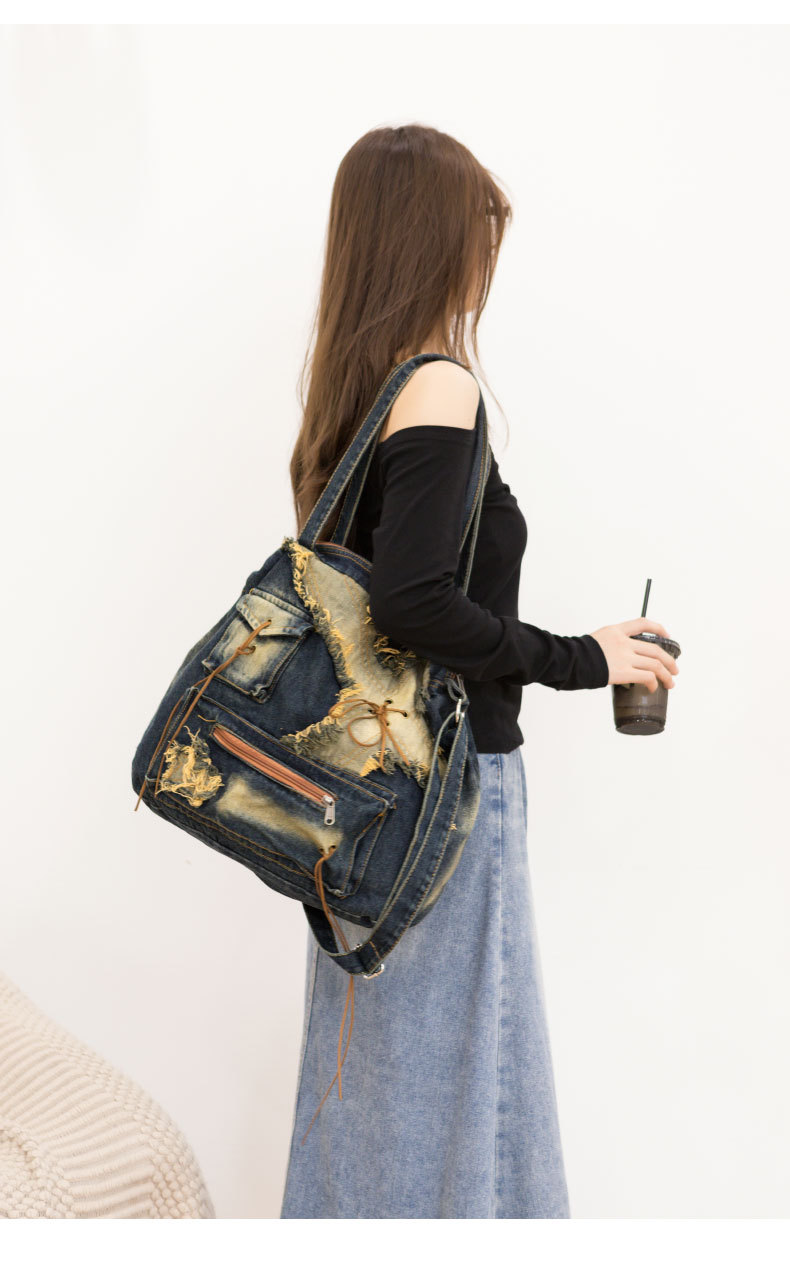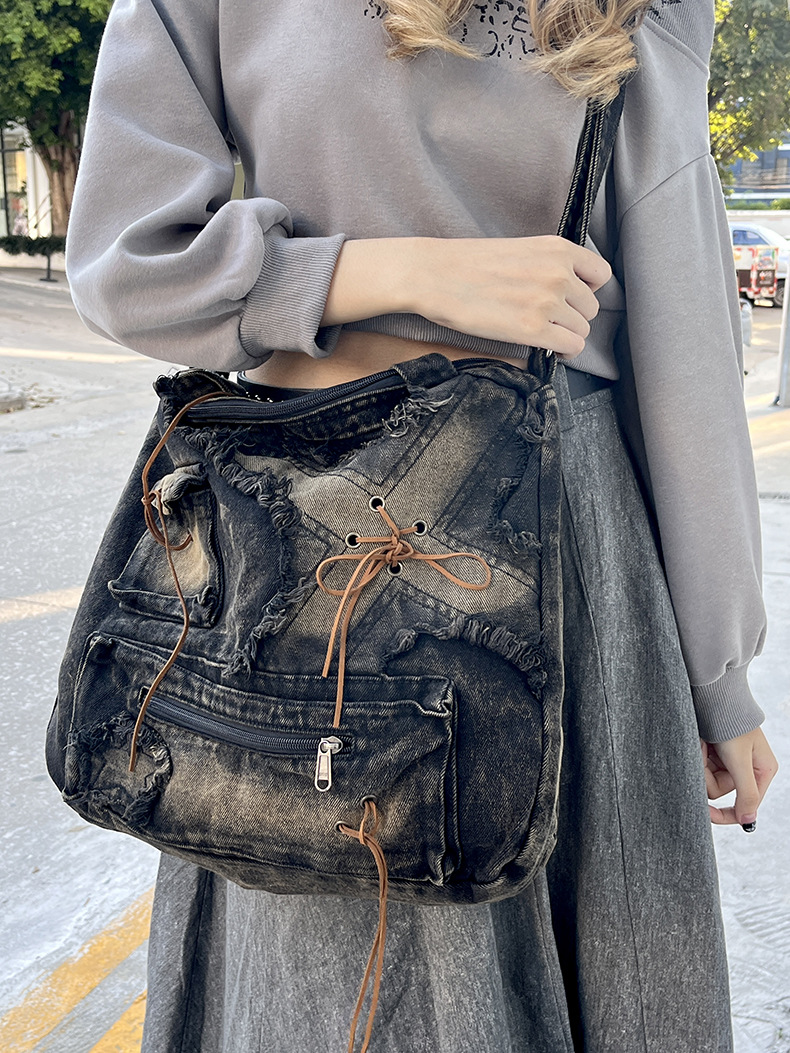 이니엘 레트로 데님 백 대용량 캐주얼 숄더백 학생 출퇴근용 빈티지 마감 데일리 크로스백