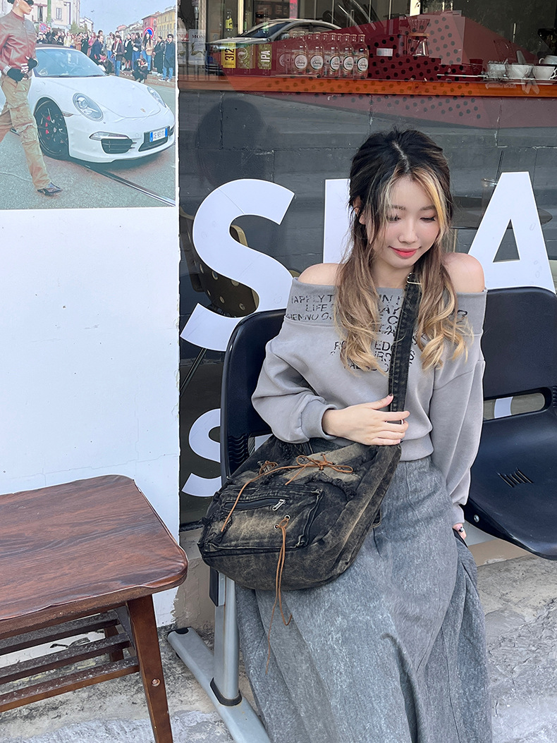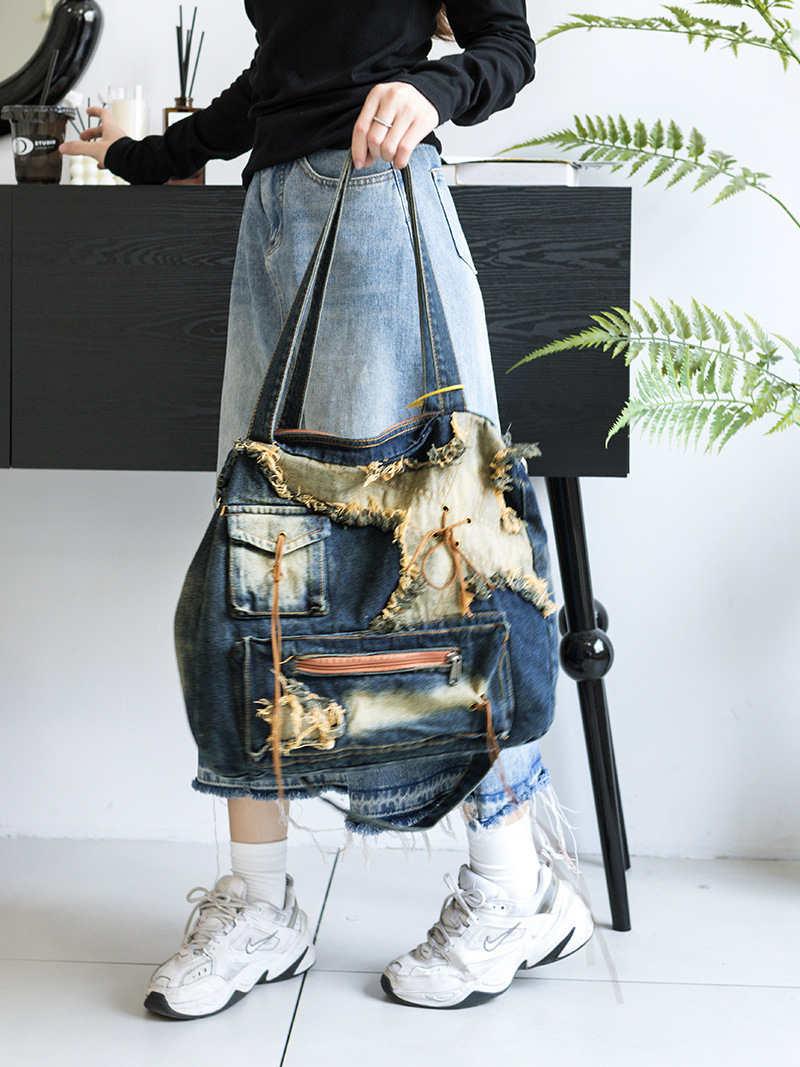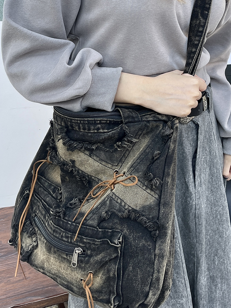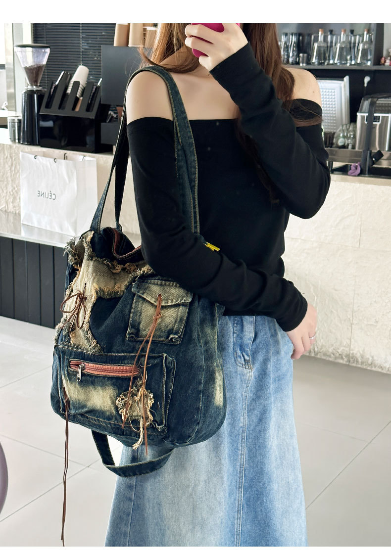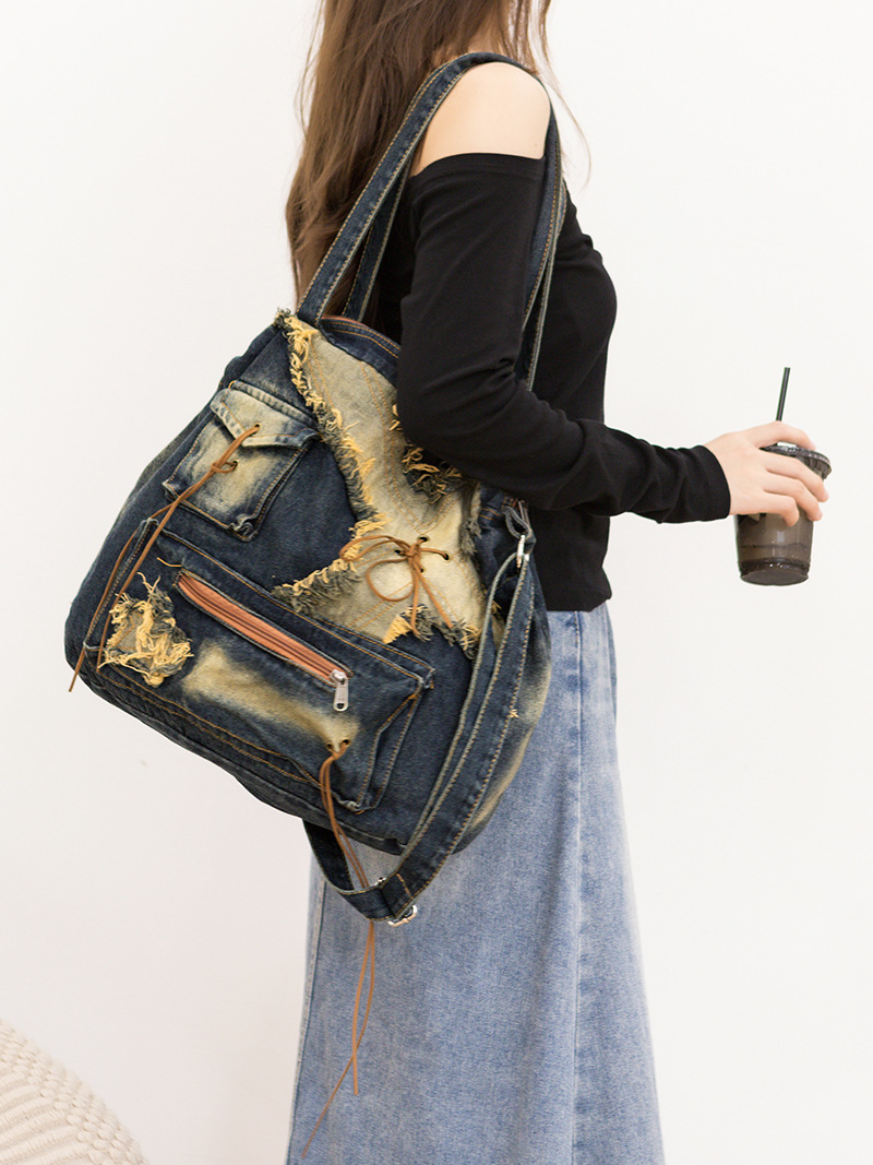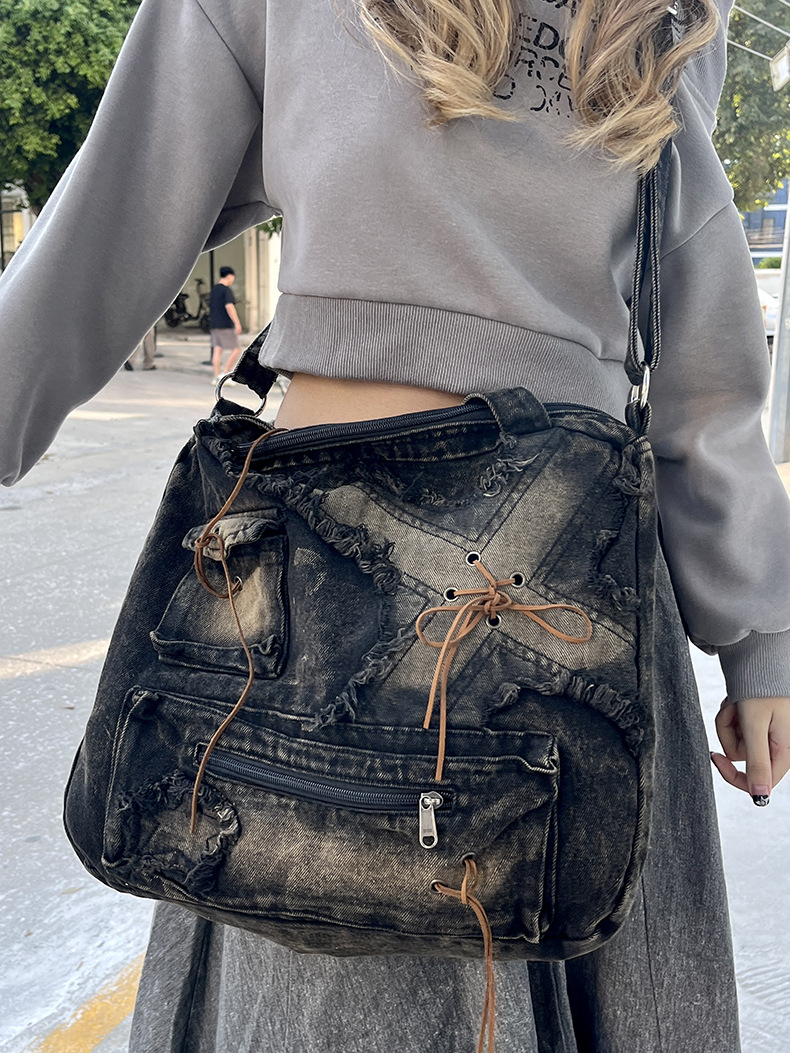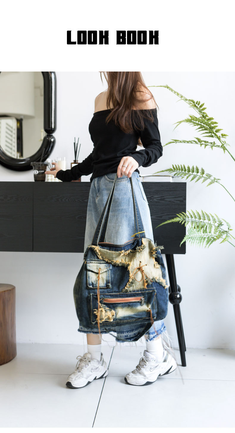 이니엘 레트로 데님 백 대용량 캐주얼 숄더백 학생 출퇴근용 빈티지 마감 데일리 크로스백