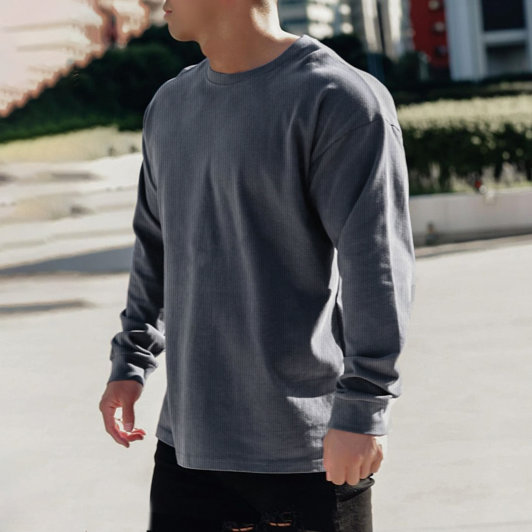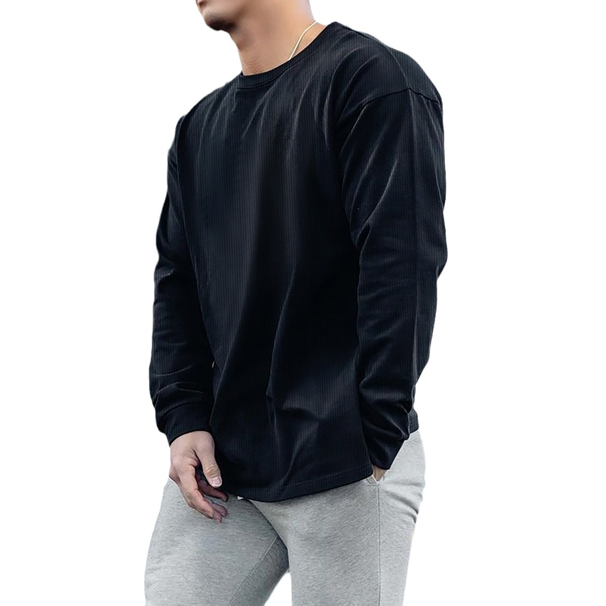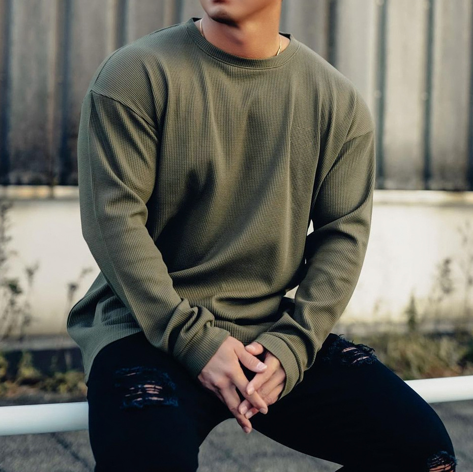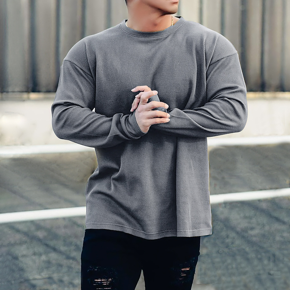 새로운 가을 피트니스 단색 스포츠 긴팔 티셔츠 남성용 느슨한 어깨 달리기 스포츠 레저 와플 농구 유행