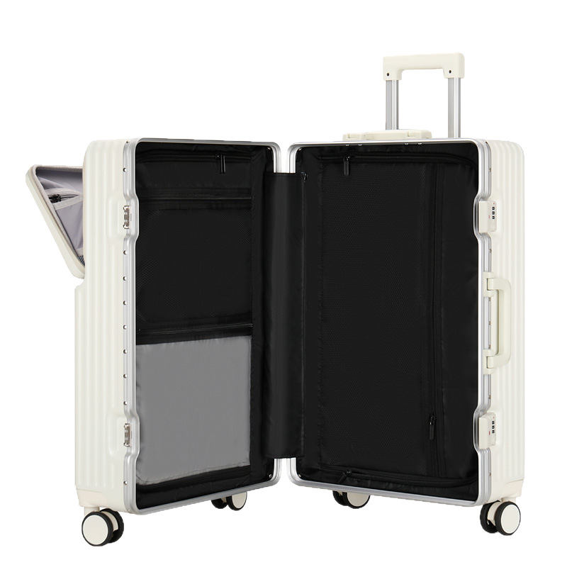 전면 오픈 뚜껑 알루미늄 프레임 트롤리 케이스 용량 증가 암호 상자 비즈니스 가죽 상자 건조 및 습식 이중 레이어 분리 20 인치 장착 케이스