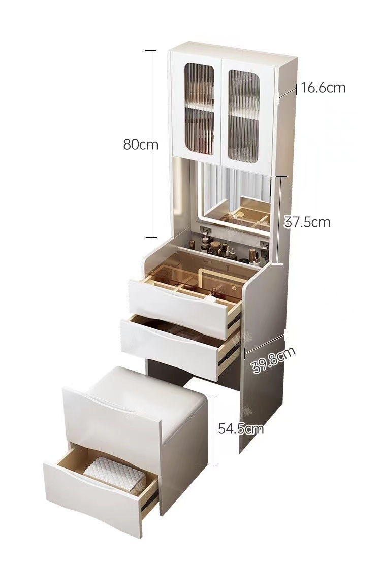 상단 캐비닛은 조명 없이 뒤집을 수 있으며 메이크업 스툴이 포함되어 있습니다.