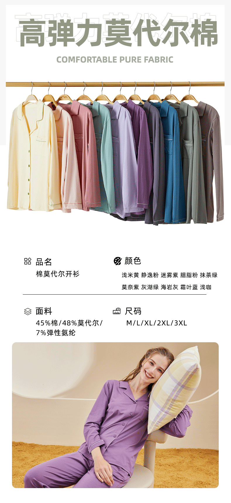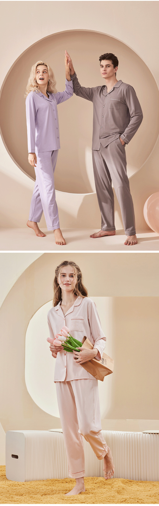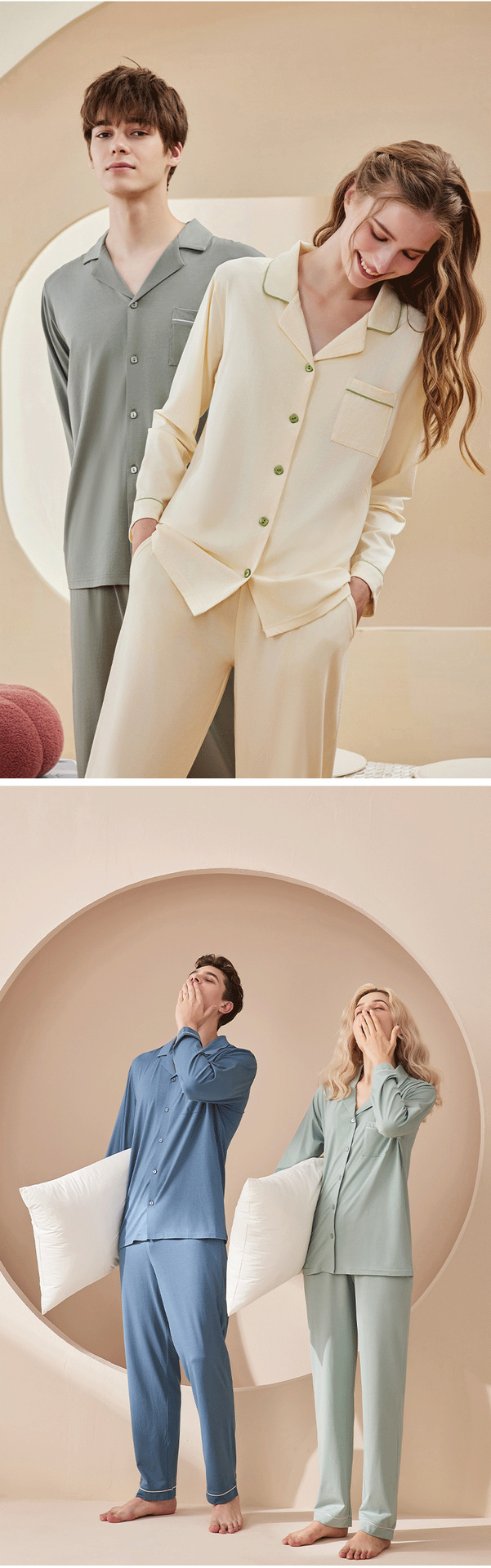 란징 모달 코튼 남성 잠옷 세트 봄 가을용 심플한 단색 커플 홈웨어 남성용 통기성 편안함