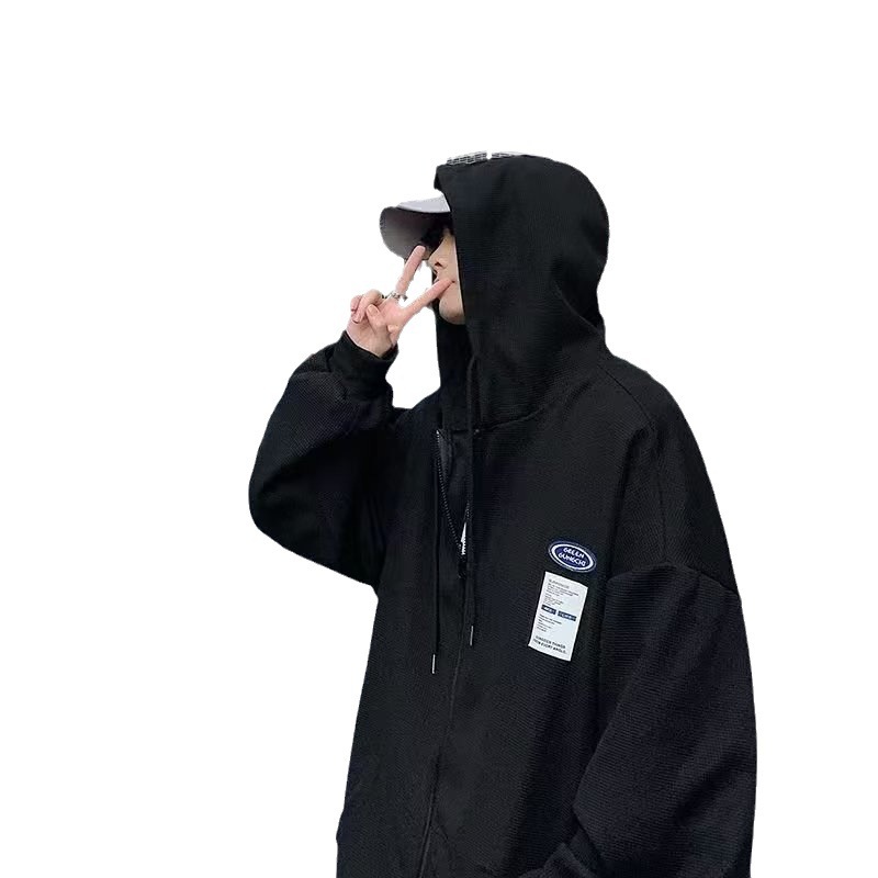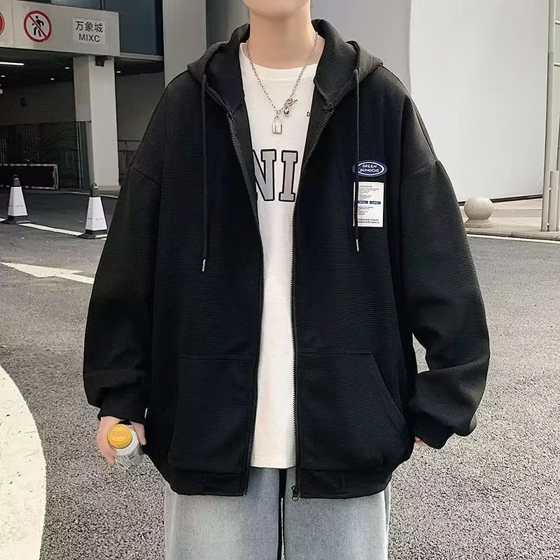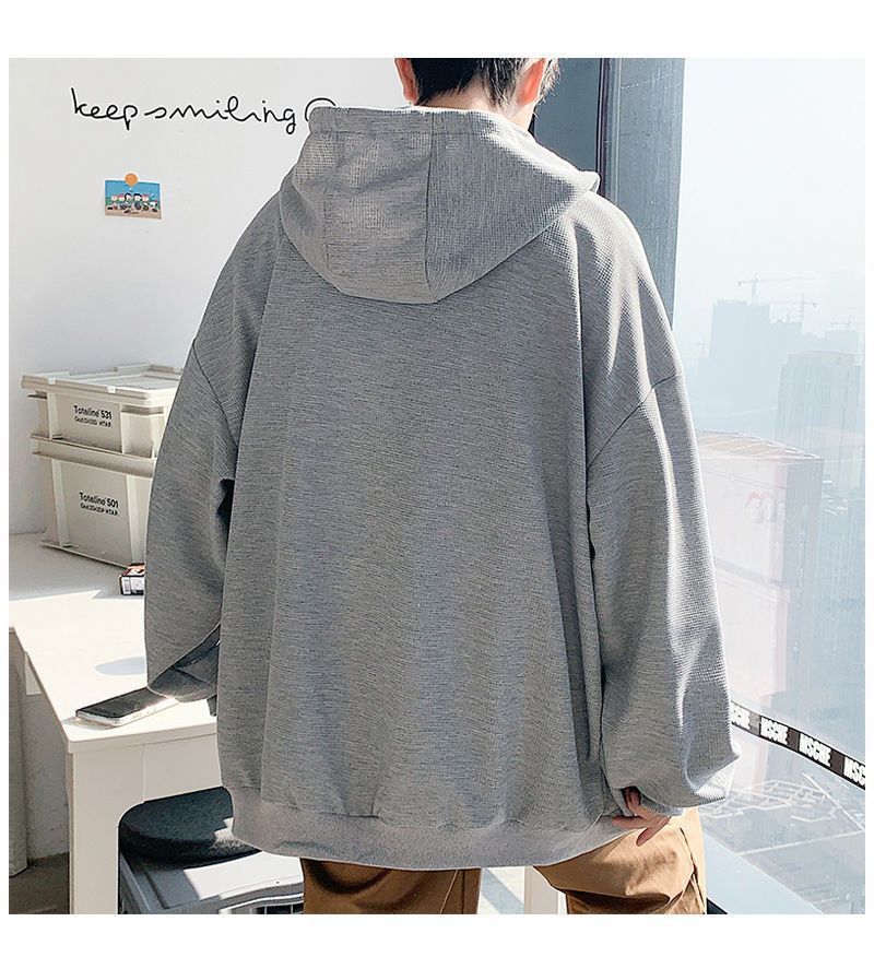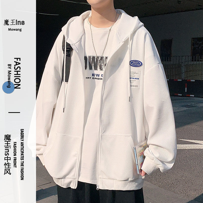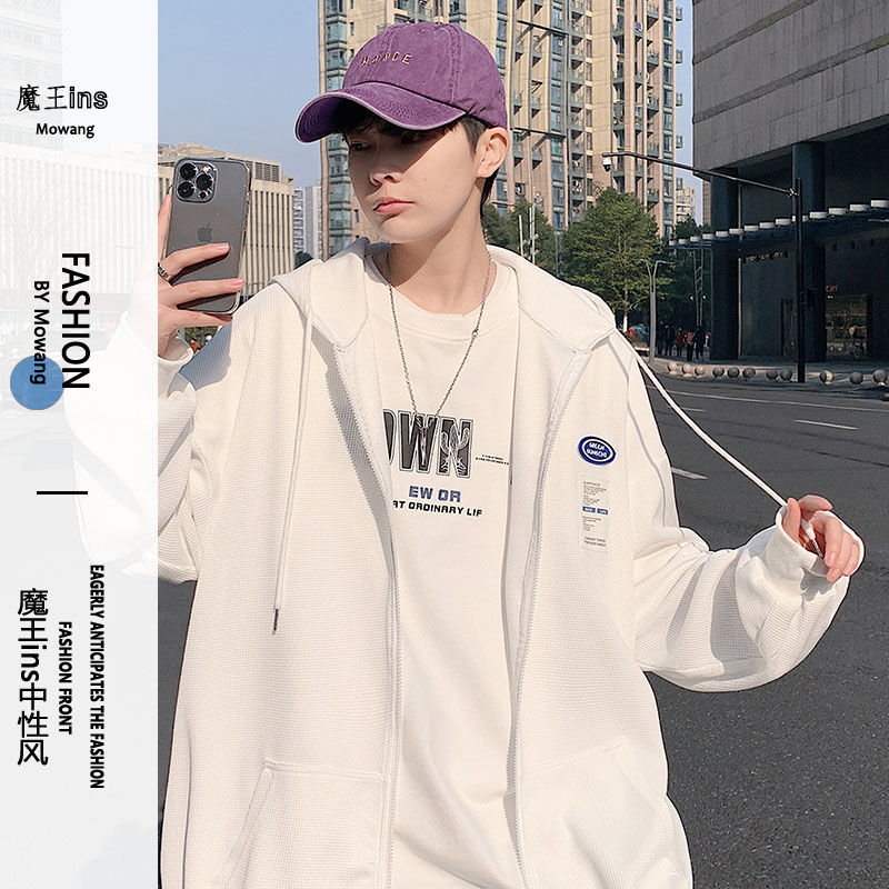 와플 패턴 봄 가을 스웨트셔츠 남성용 카디건 지퍼 탑 루즈핏 후드 봄 가을 스타일 트렌디 재킷 남성용