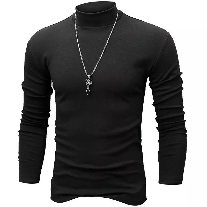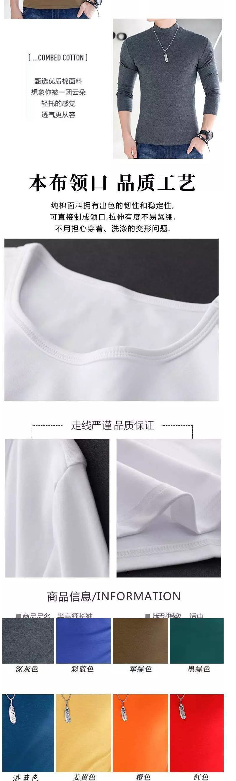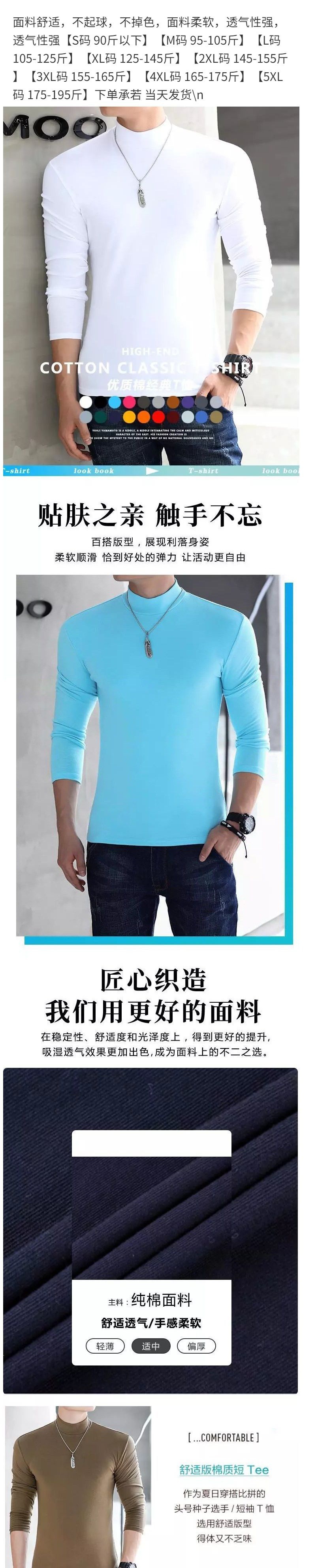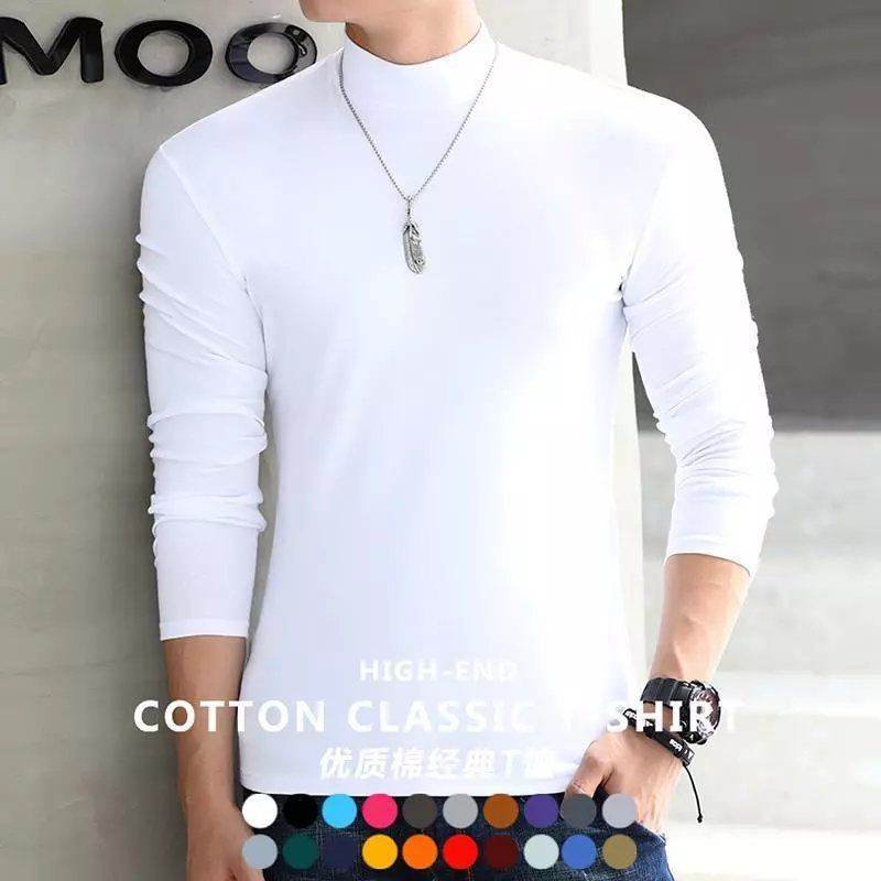 코튼 세미 하이 칼라 긴팔 티셔츠 청년과 중년 남성의 얇은 베이스 셔츠 남성용 티셔츠 단색 기본 플러스 사이즈 탑