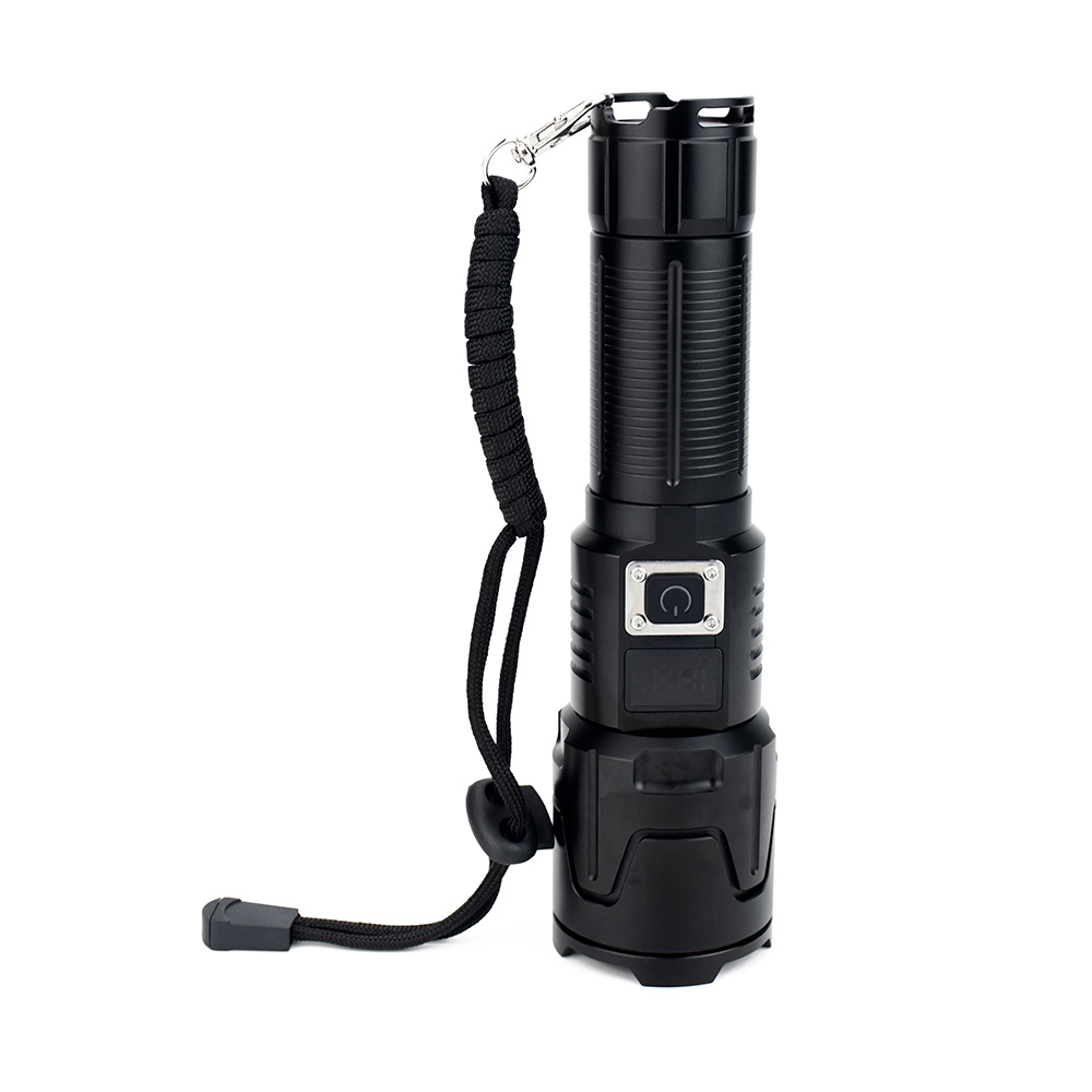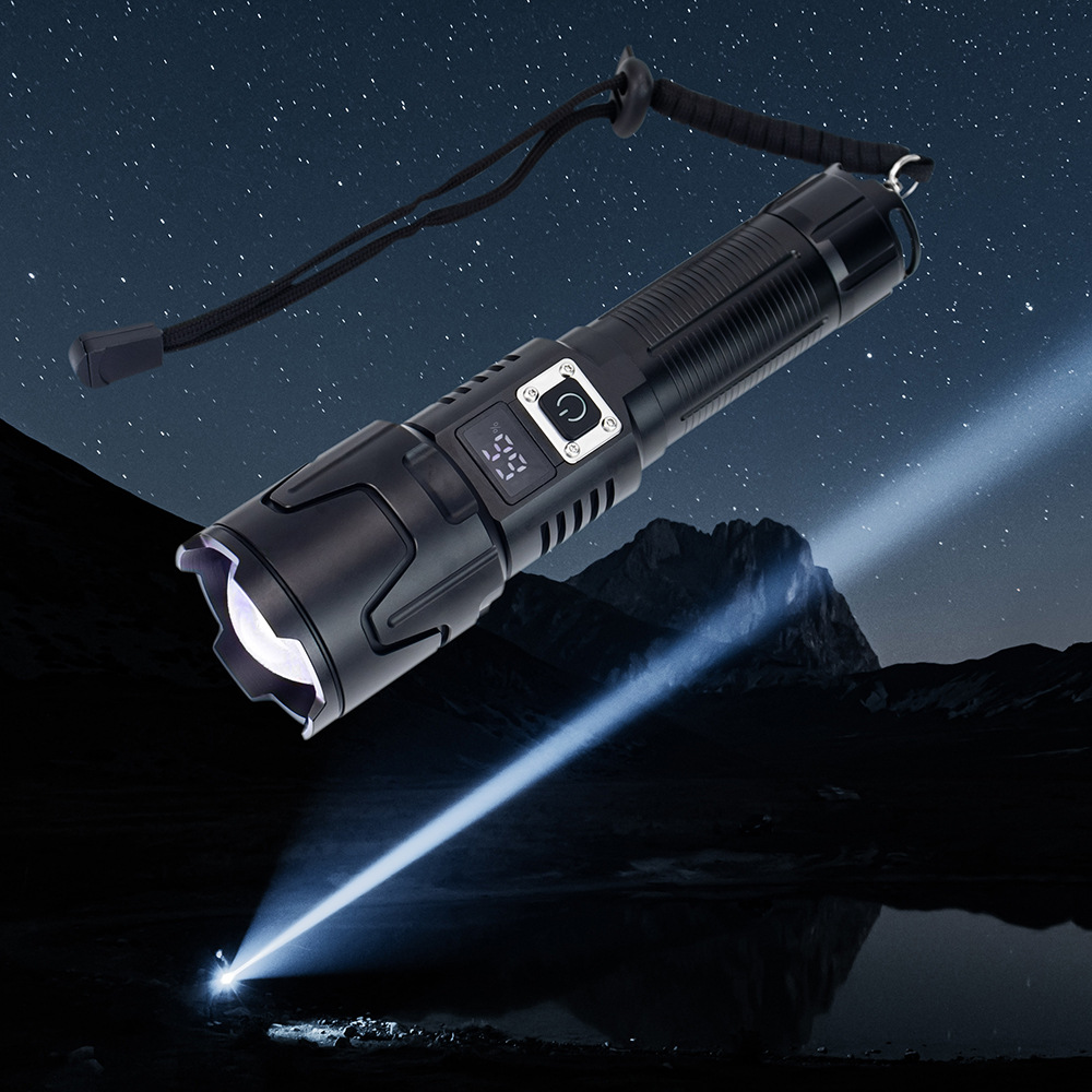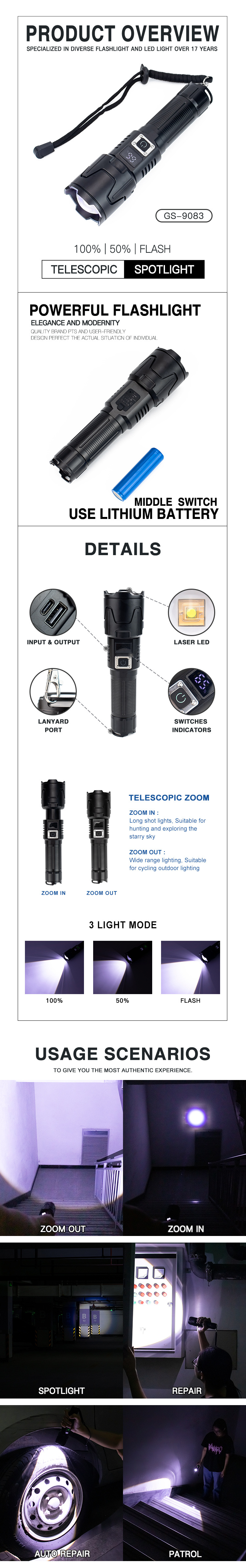 디지털 전력 표시 기능이 있는 백색 레이저 LED 초고휘도 USB 충전식 텔레스코픽 줌 알루미늄 합금 손전등