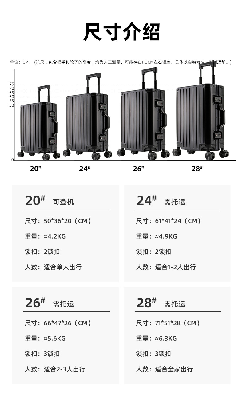 올알루미늄 여행가방, 알루미늄-마그네슘 합금 여행가방, 알루미늄 프레임 트롤리 케이스, 범용 휠 가죽 여행가방, 20inch 탑승가방, 24인치 내구성